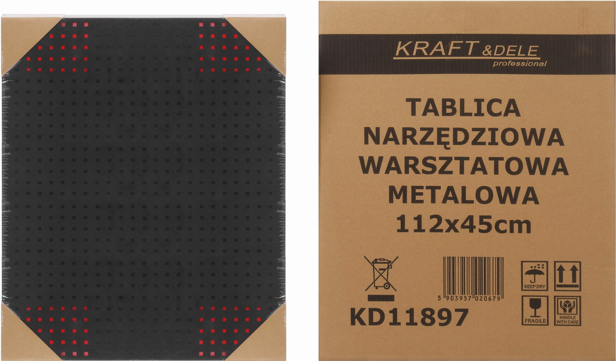 KD11897 to zestaw dwóch perforowanych paneli metalowych przeznaczonych do organizacji narzędzi w warsztacie, garażu lub serwisie. W skład zestawu wchodzi 32 elementy montażowe — haki, pojemniki i uchwyty — umożliwiające elastyczne rozmieszczenie narzędzi na ścianie roboczej.