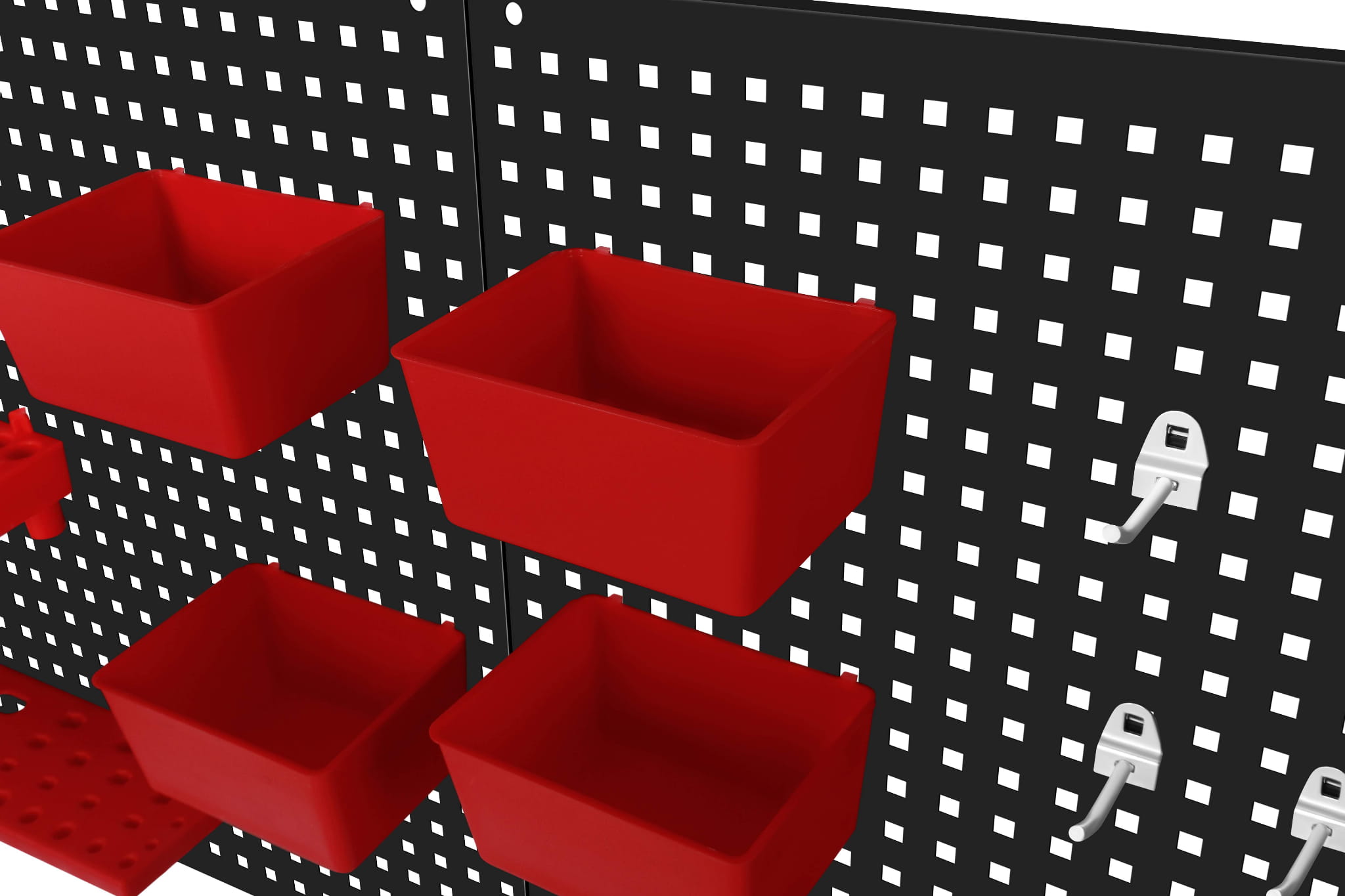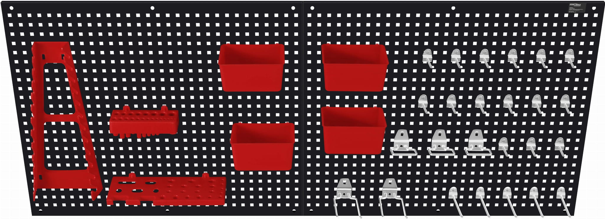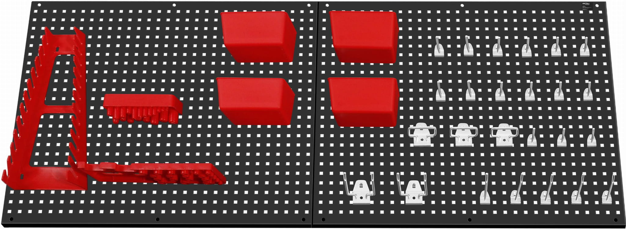 W zestawie znajduje się 25 haków (15 krótkich, 5 długich, 2 podwójne, 3 na szczypce), 4 plastikowe pojemniki na drobne elementy oraz dedykowany uchwyt na klucze płaskie, śrubokręty i wiertła. Zestaw umożliwia organizację narzędzi od razu po montażu.