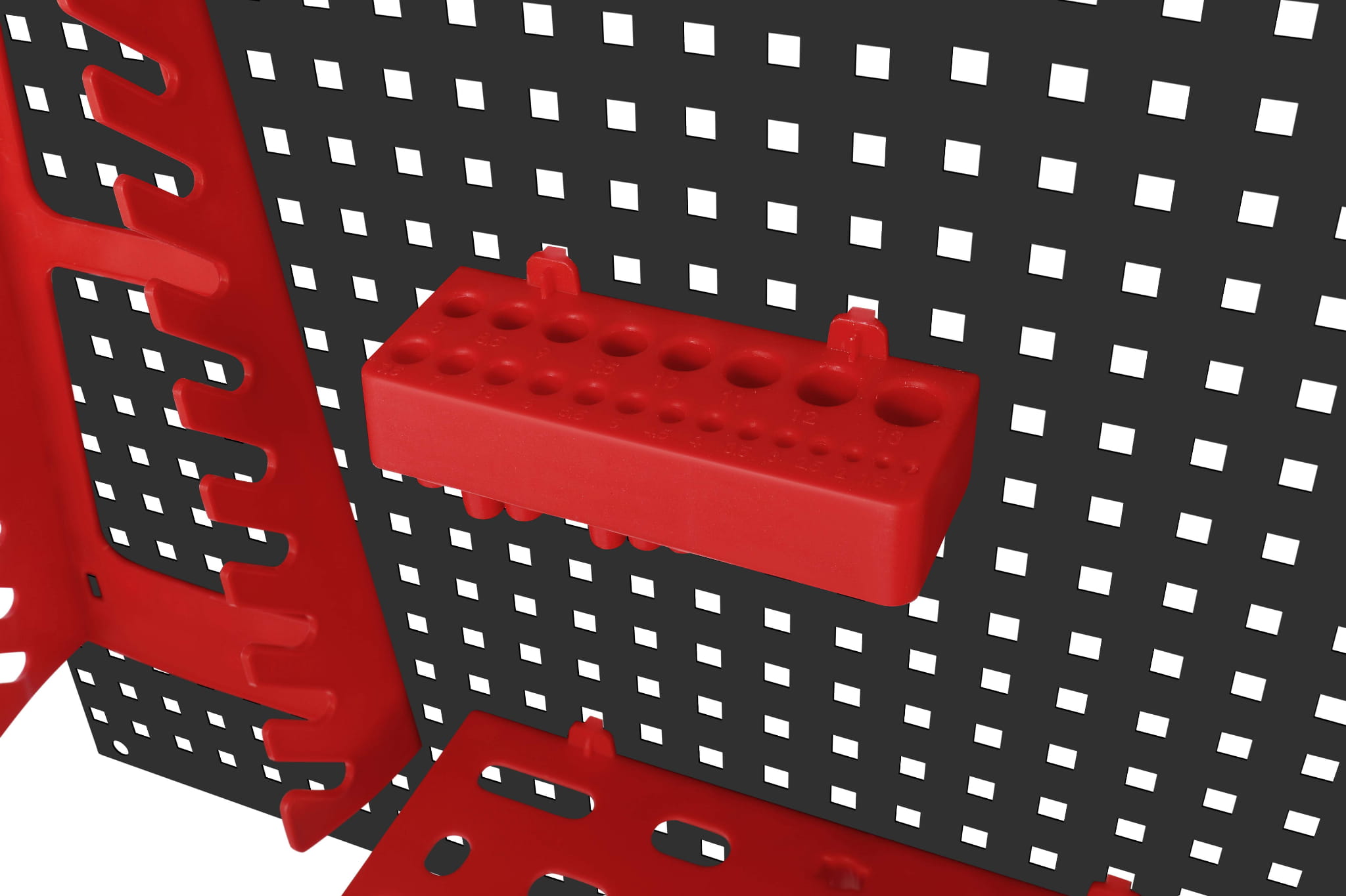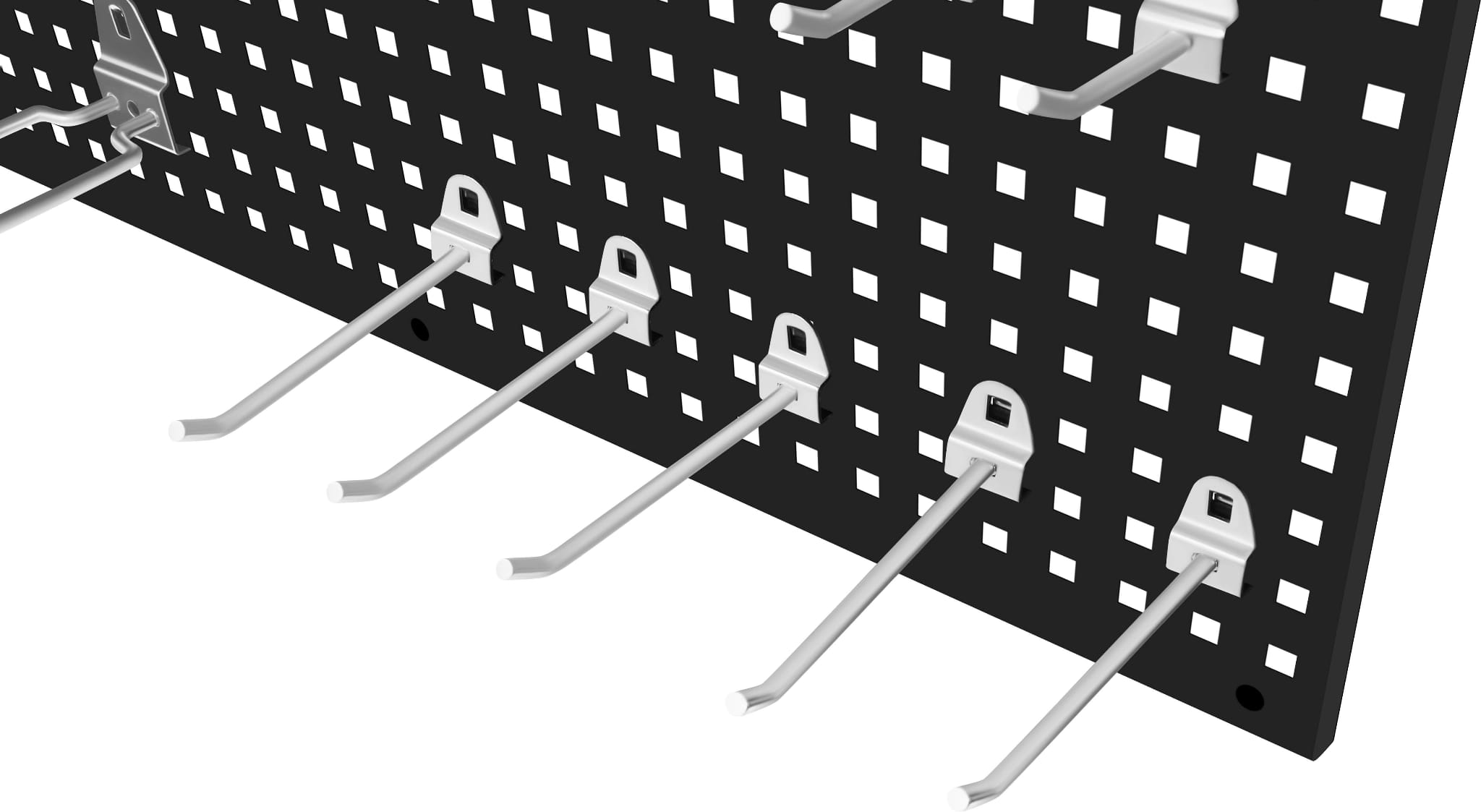 Regularnie rozmieszczone otwory w panelach pozwalają na dowolne ustawienie haków i uchwytów w wybranym miejscu. Rozmieszczenie akcesoriów można w każdej chwili zmienić bez konieczności wiercenia nowych otworów — wystarczy przestawić elementy w inne pozycje siatki.