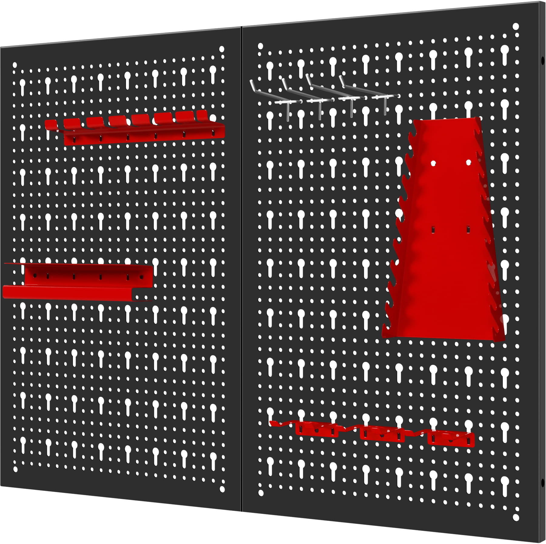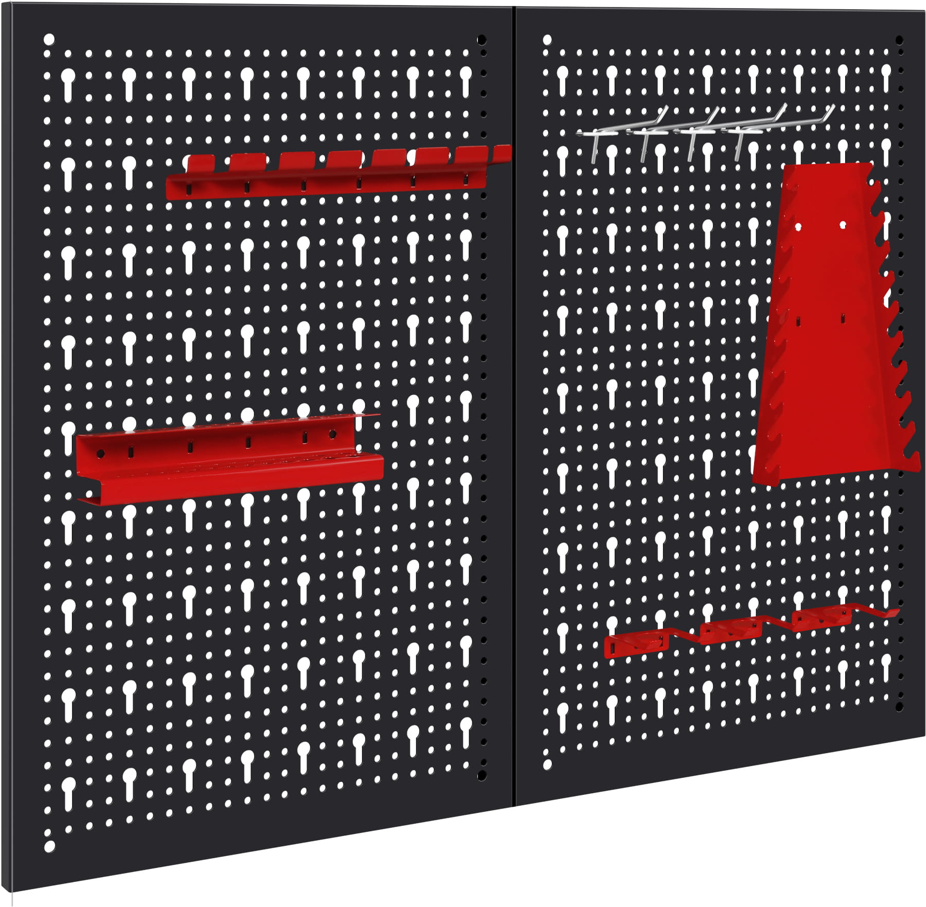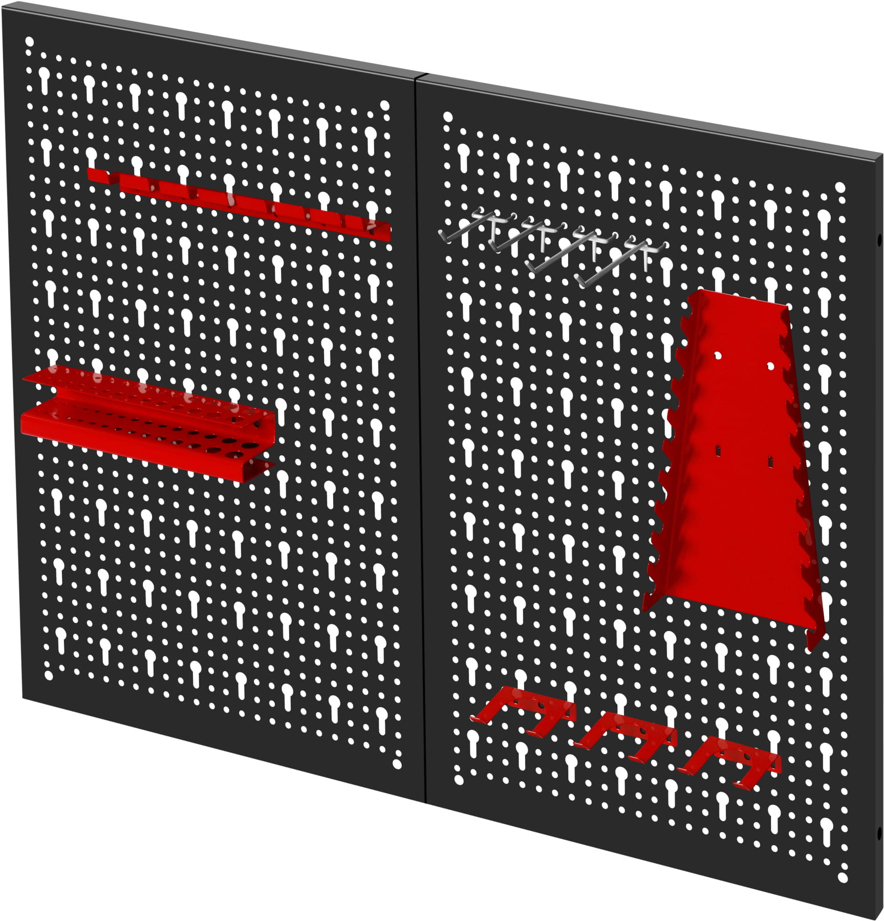 Format 80×60 cm (4800 cm²) umożliwia jednoczesne przechowywanie rozbudowanego zestawu narzędzi — kluczy płaskich i oczkowych, śrubokrętów, szczypiec, młotków czy miarek. Tablica składa się z dwóch elementów montowanych razem.