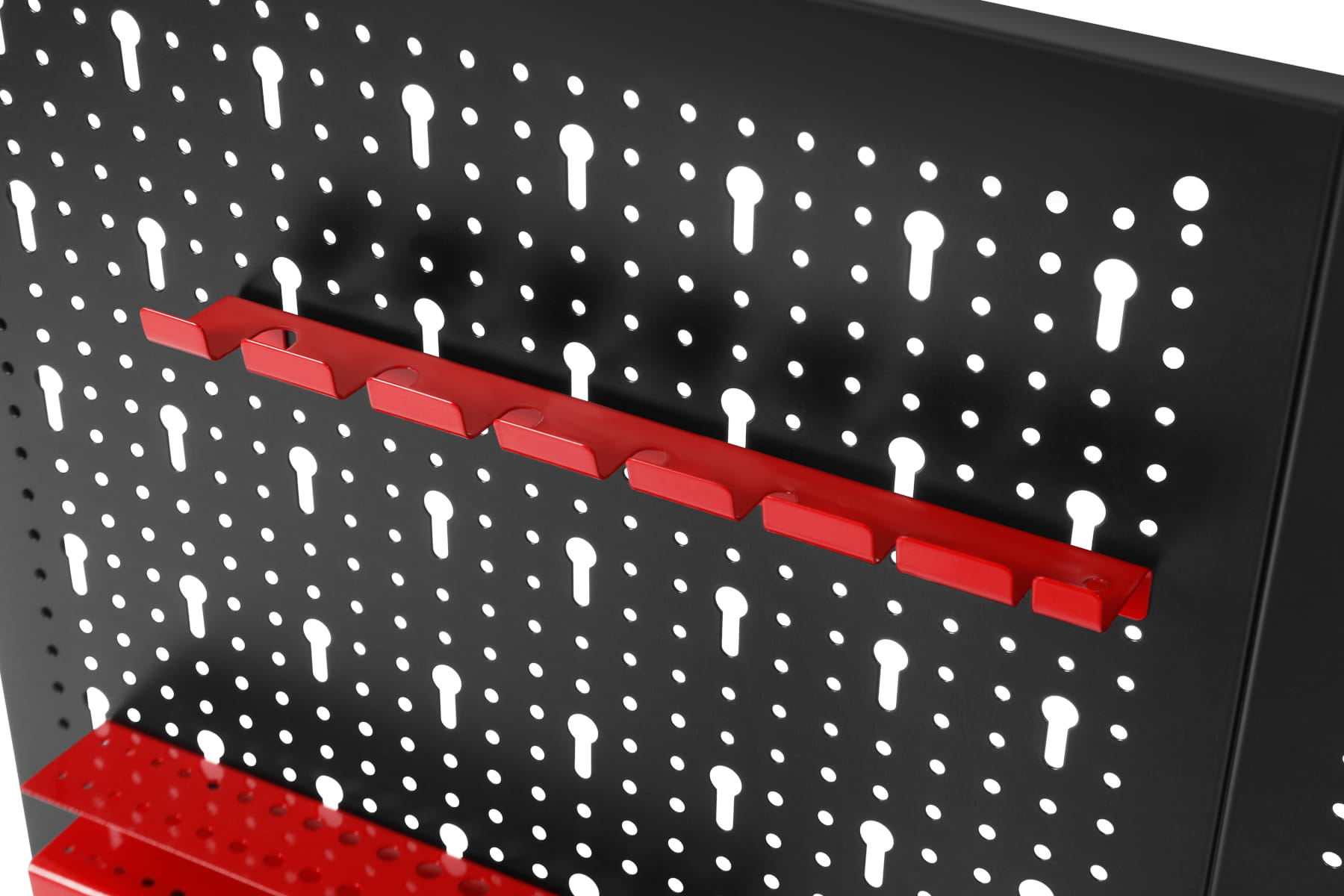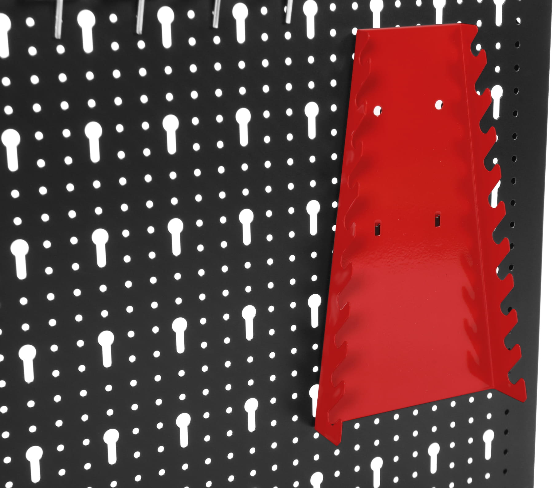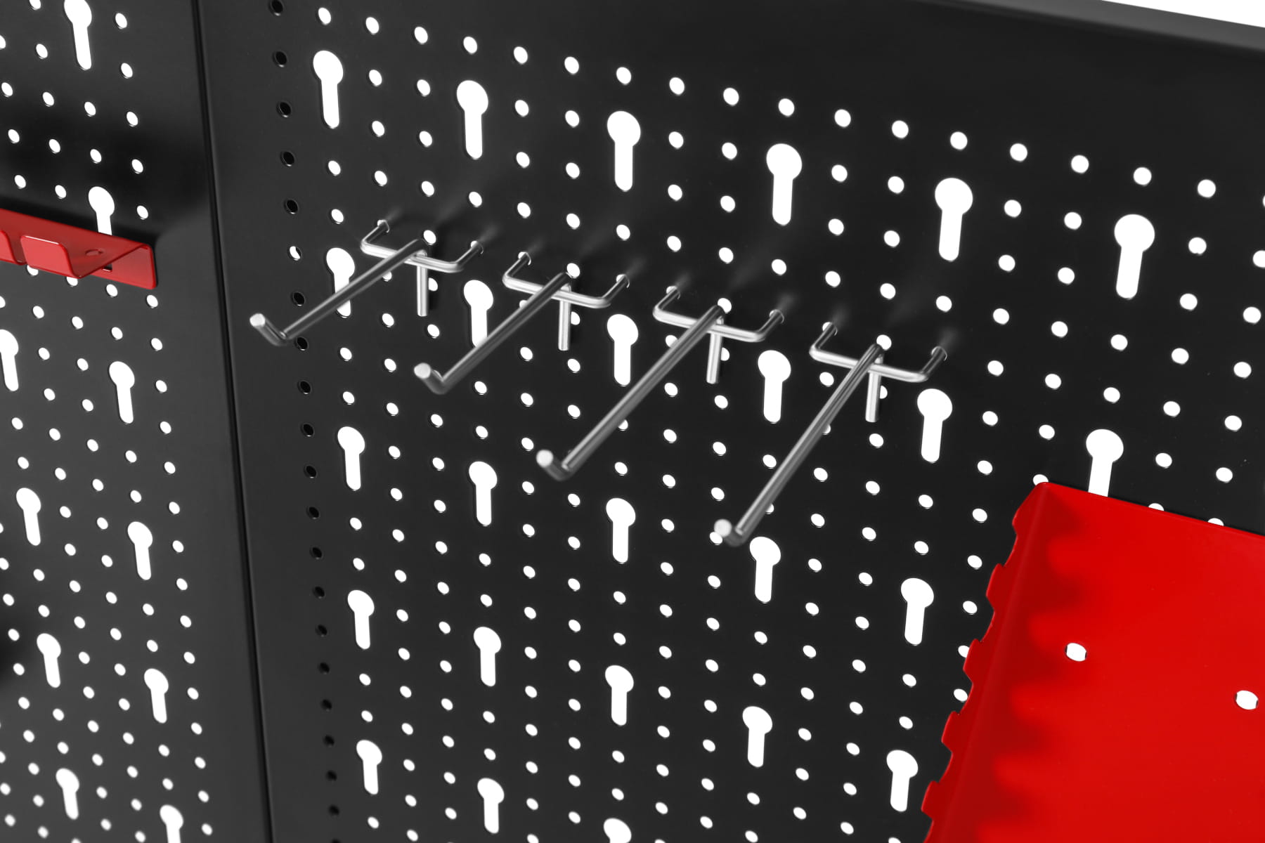 Uchwyty można przestawiać w obrębie całej perforowanej powierzchni, dostosowując rozmieszczenie narzędzi do zmieniających się potrzeb lub rozbudowując zestaw o dodatkowe akcesoria kompatybilne ze standardowym rozstawem otworów.