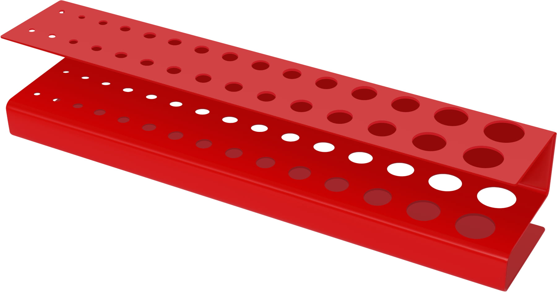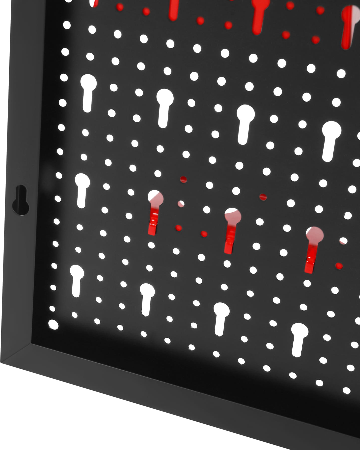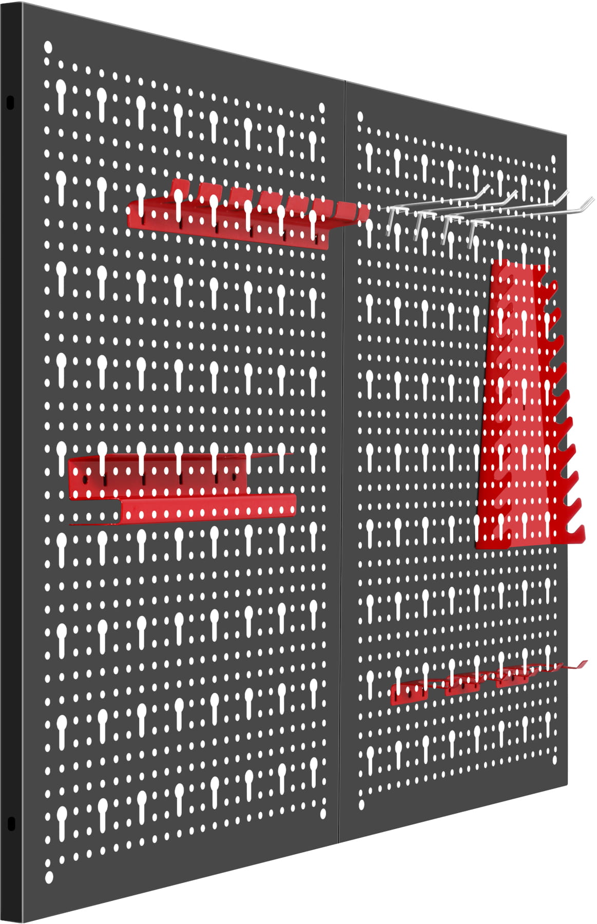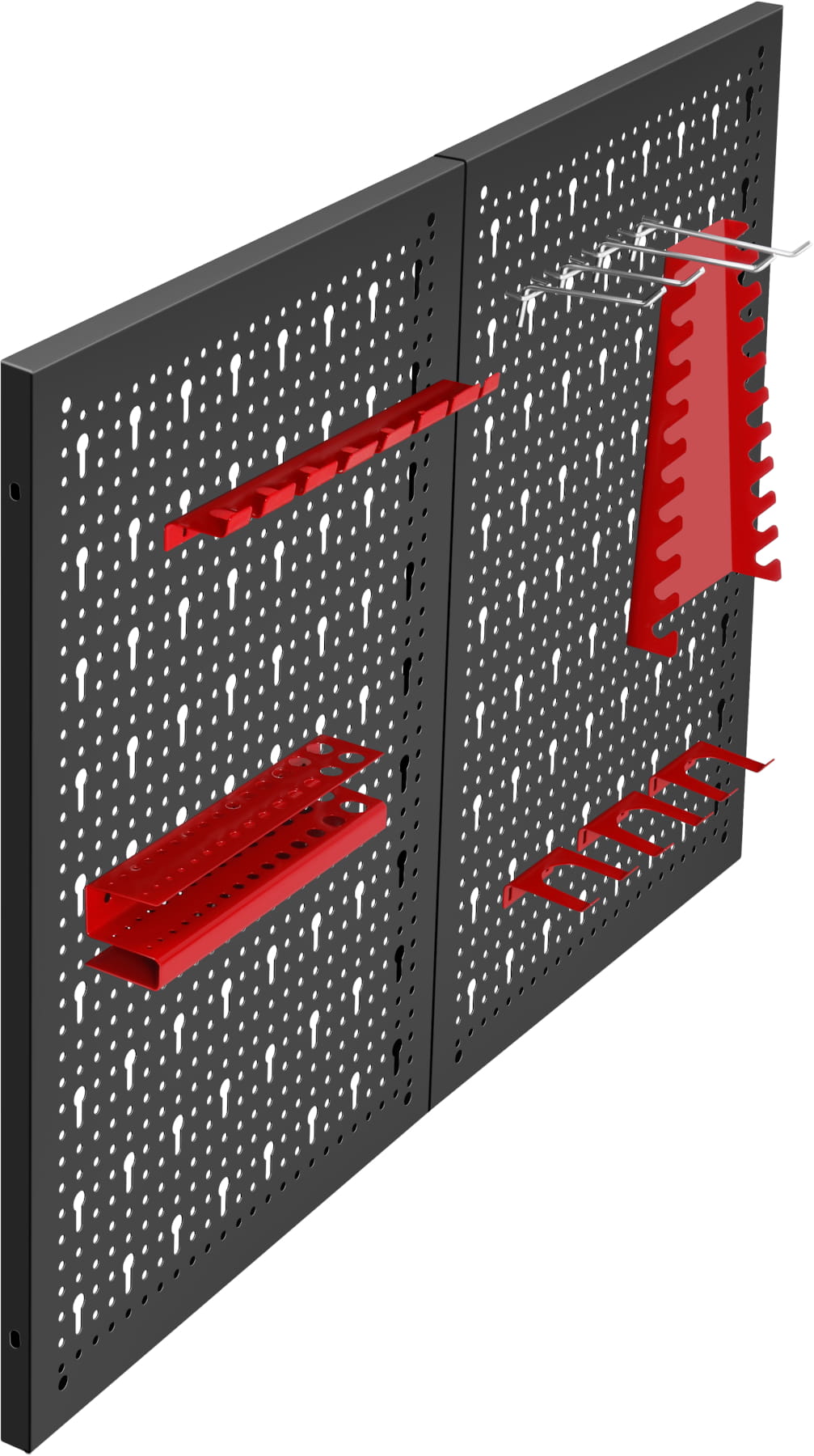 Uchwyty można przestawiać w obrębie całej perforowanej powierzchni, dostosowując rozmieszczenie narzędzi do zmieniających się potrzeb lub rozbudowując zestaw o dodatkowe akcesoria kompatybilne ze standardowym rozstawem otworów.