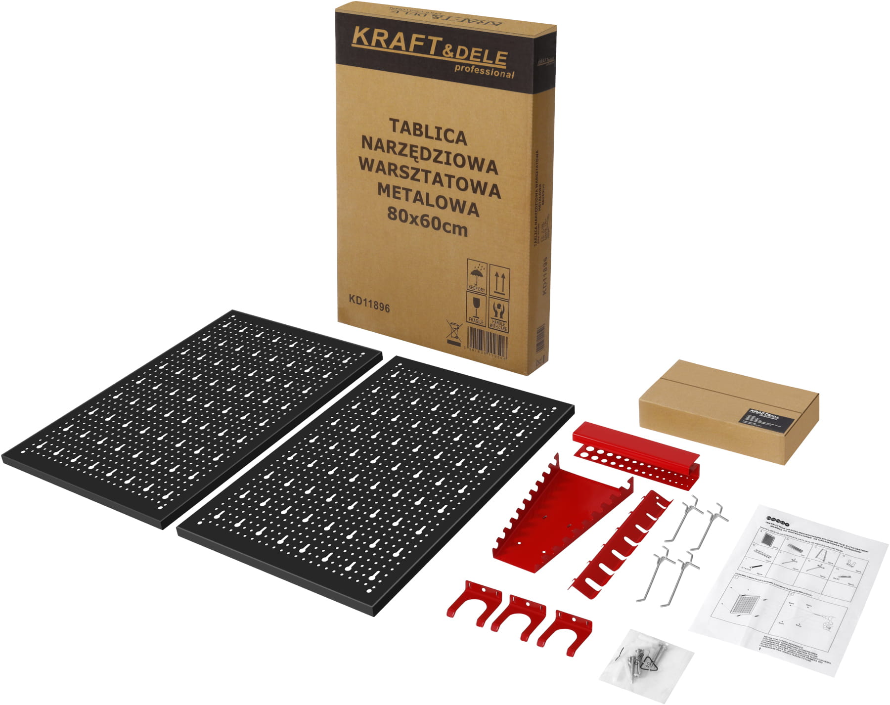 KD11896 marki Kraft&Dele to ścienna tablica narzędziowa wykonana z perforowanej blachy stalowej o powierzchni roboczej 80×60 cm. Przeznaczona do montażu na ścianie warsztatu, garażu lub piwnicy — umożliwia systematyczne rozmieszczenie narzędzi ręcznych i szybki do nich dostęp bez konieczności przeszukiwania szuflad czy skrzynek.
