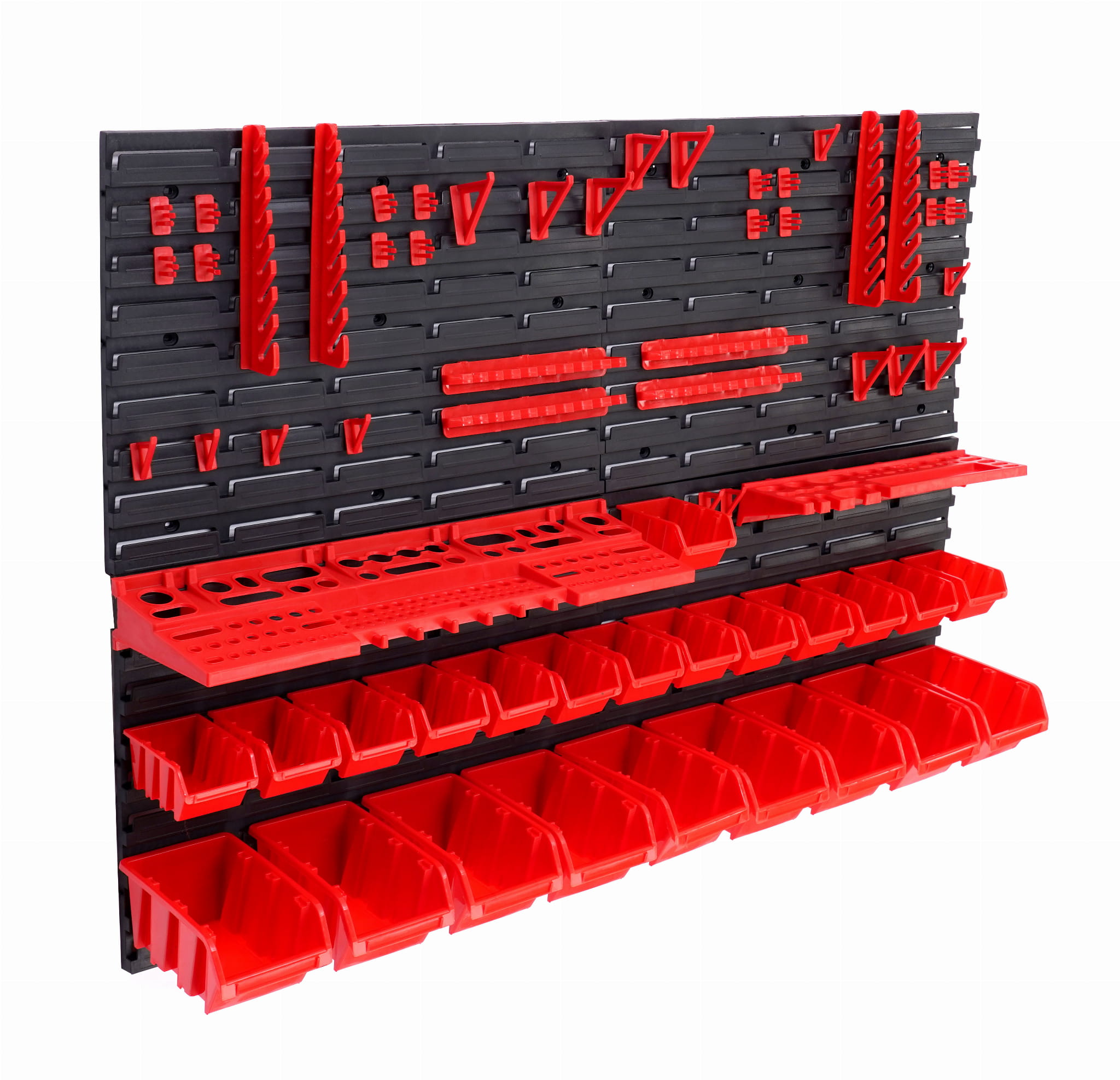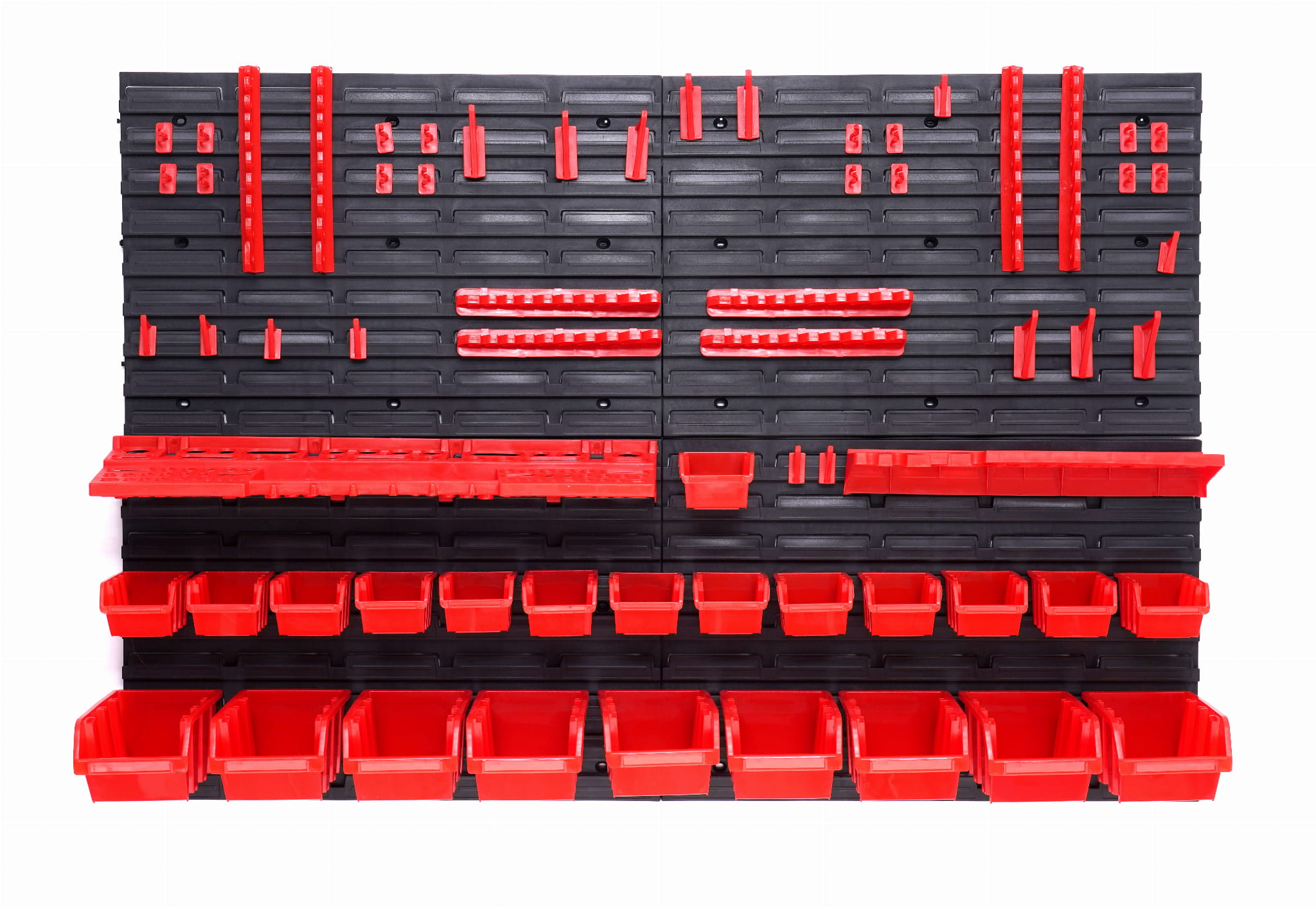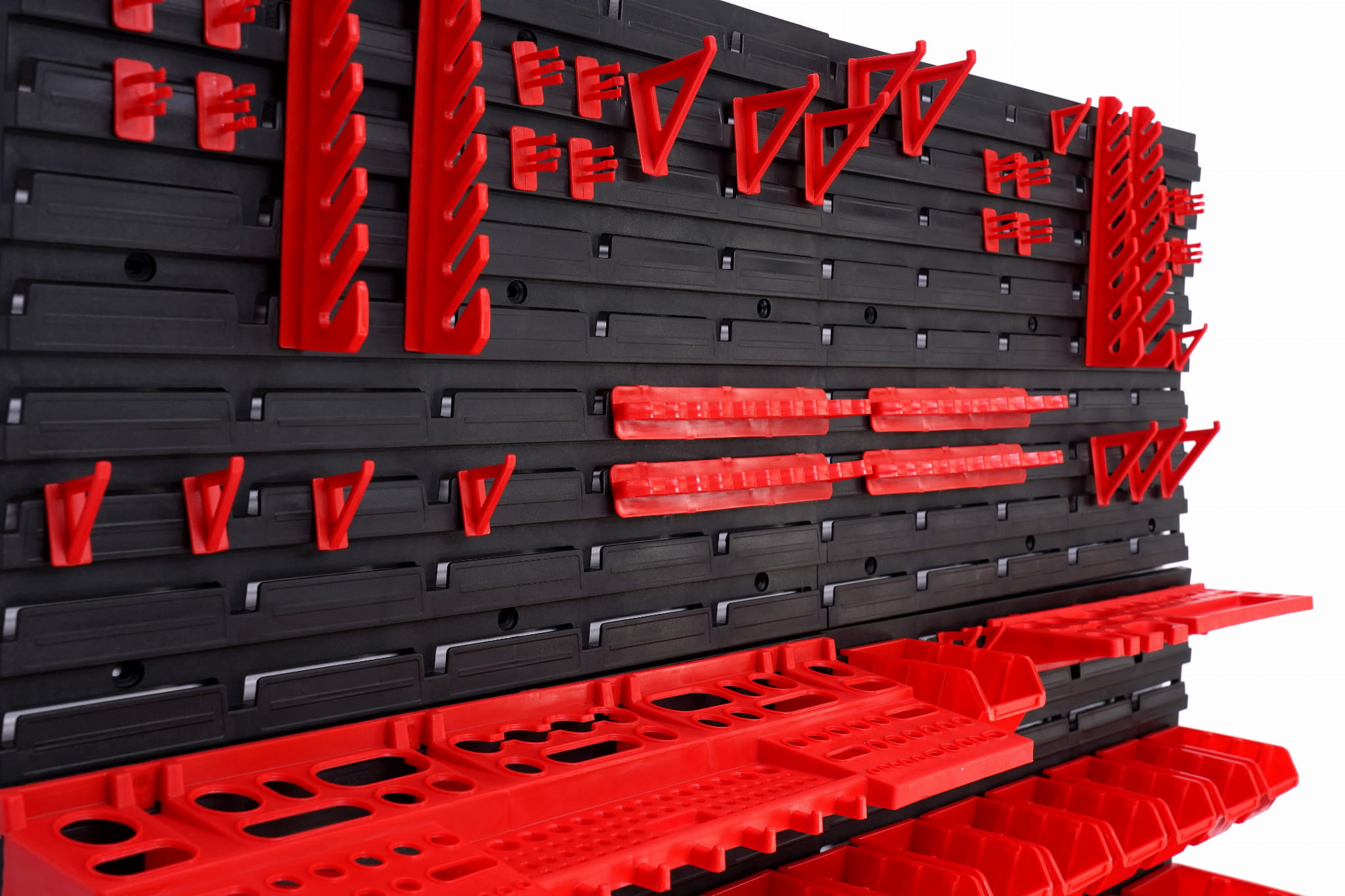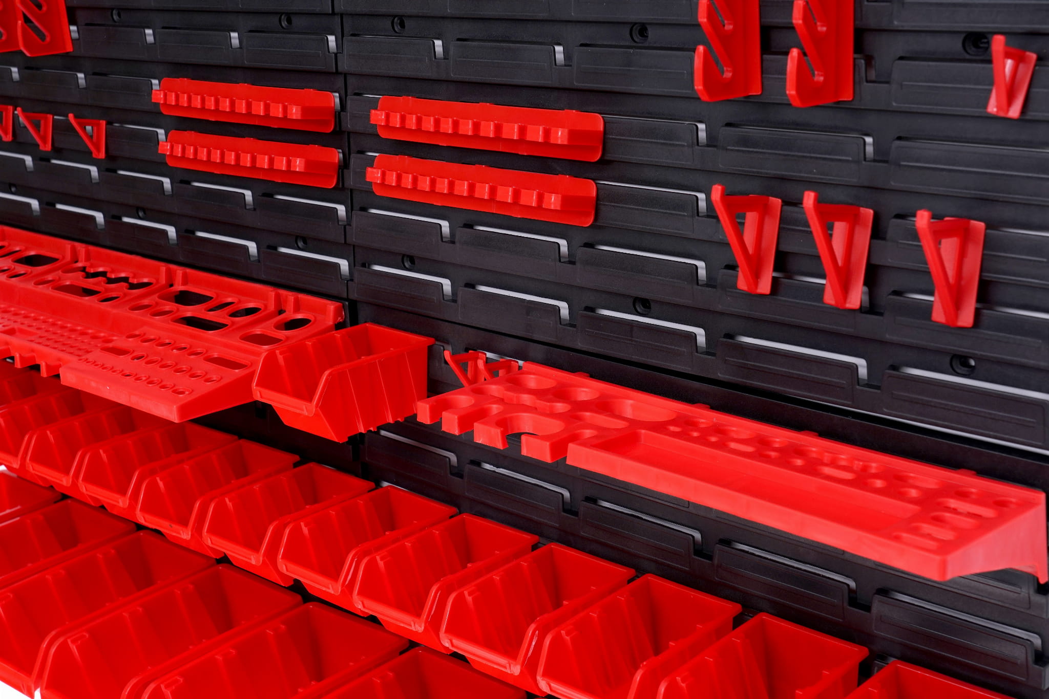 Ścianka narzędziowa z tworzywa sztucznego przeznaczona do montażu naściennego. Zestaw zawiera komplet akcesoriów organizacyjnych — pojemniki dwóch rozmiarów, uchwyty na klucze i śrubokręty, wieszaki oraz dwie półki — umożliwiając zabudowę całej powierzchni tablicy bez konieczności dokupowania dodatkowych elementów. Zestaw nie zawiera narzędzi.