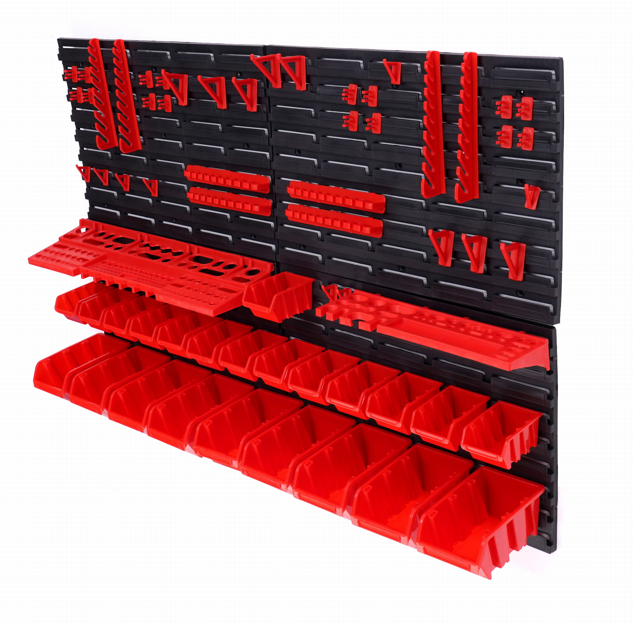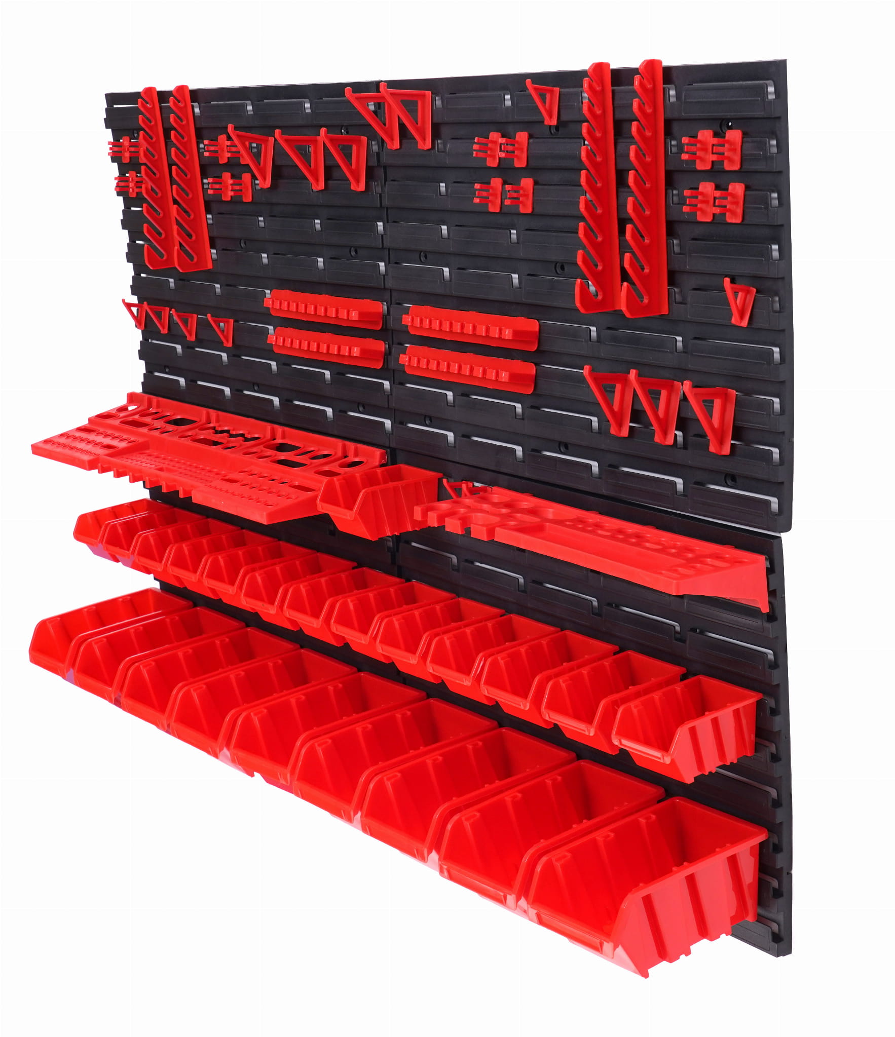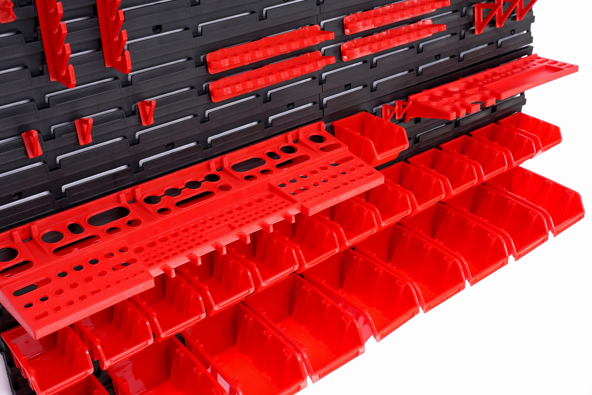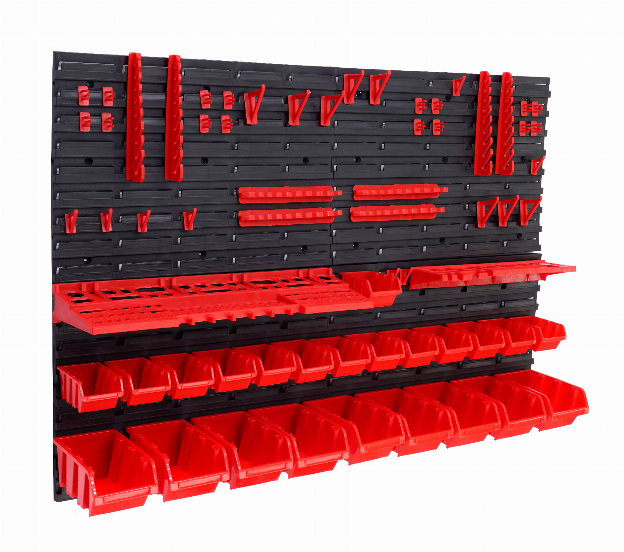 Ścianka narzędziowa z tworzywa sztucznego przeznaczona do montażu naściennego. Zestaw zawiera komplet akcesoriów organizacyjnych — pojemniki dwóch rozmiarów, uchwyty na klucze i śrubokręty, wieszaki oraz dwie półki — umożliwiając zabudowę całej powierzchni tablicy bez konieczności dokupowania dodatkowych elementów. Zestaw nie zawiera narzędzi.