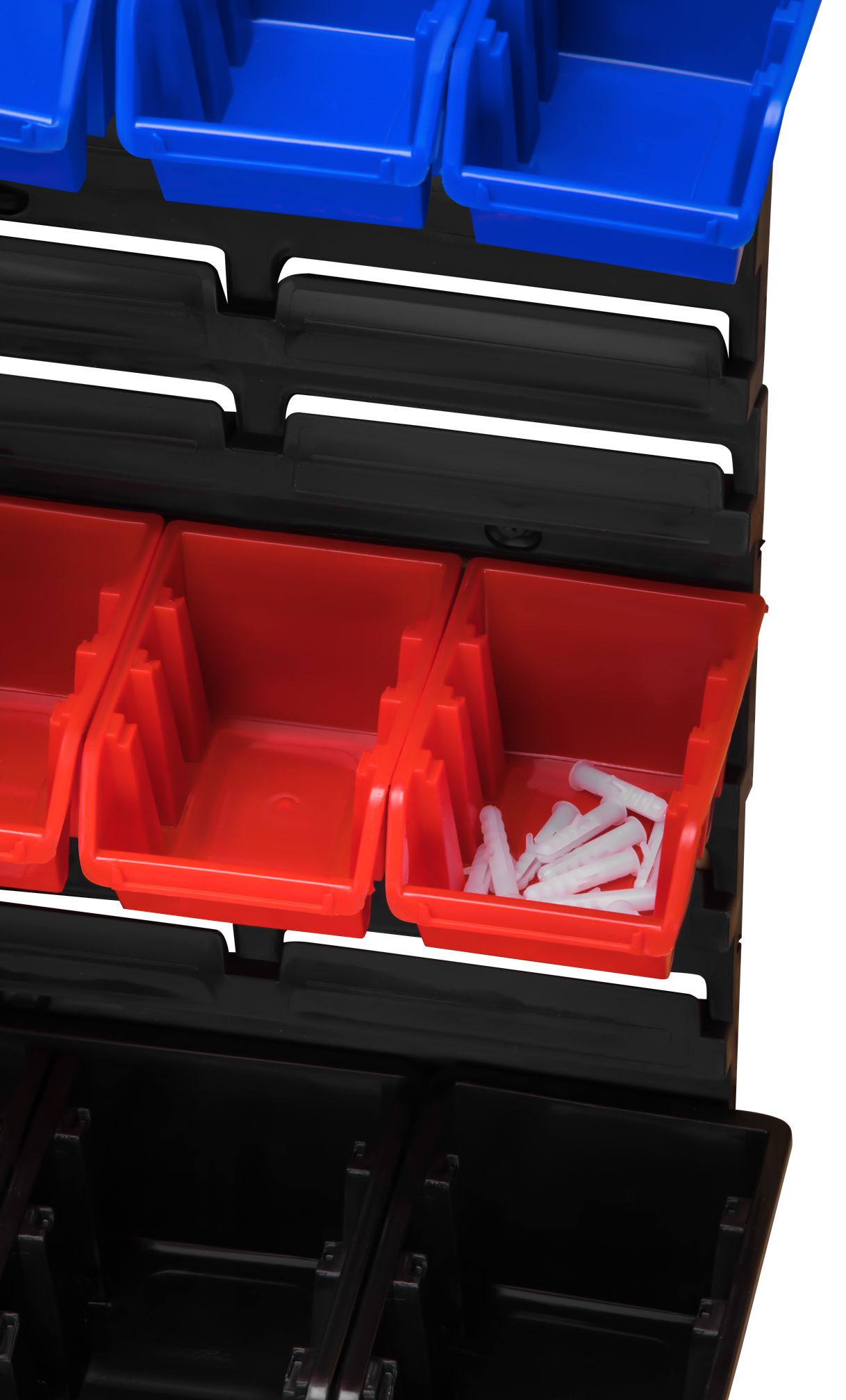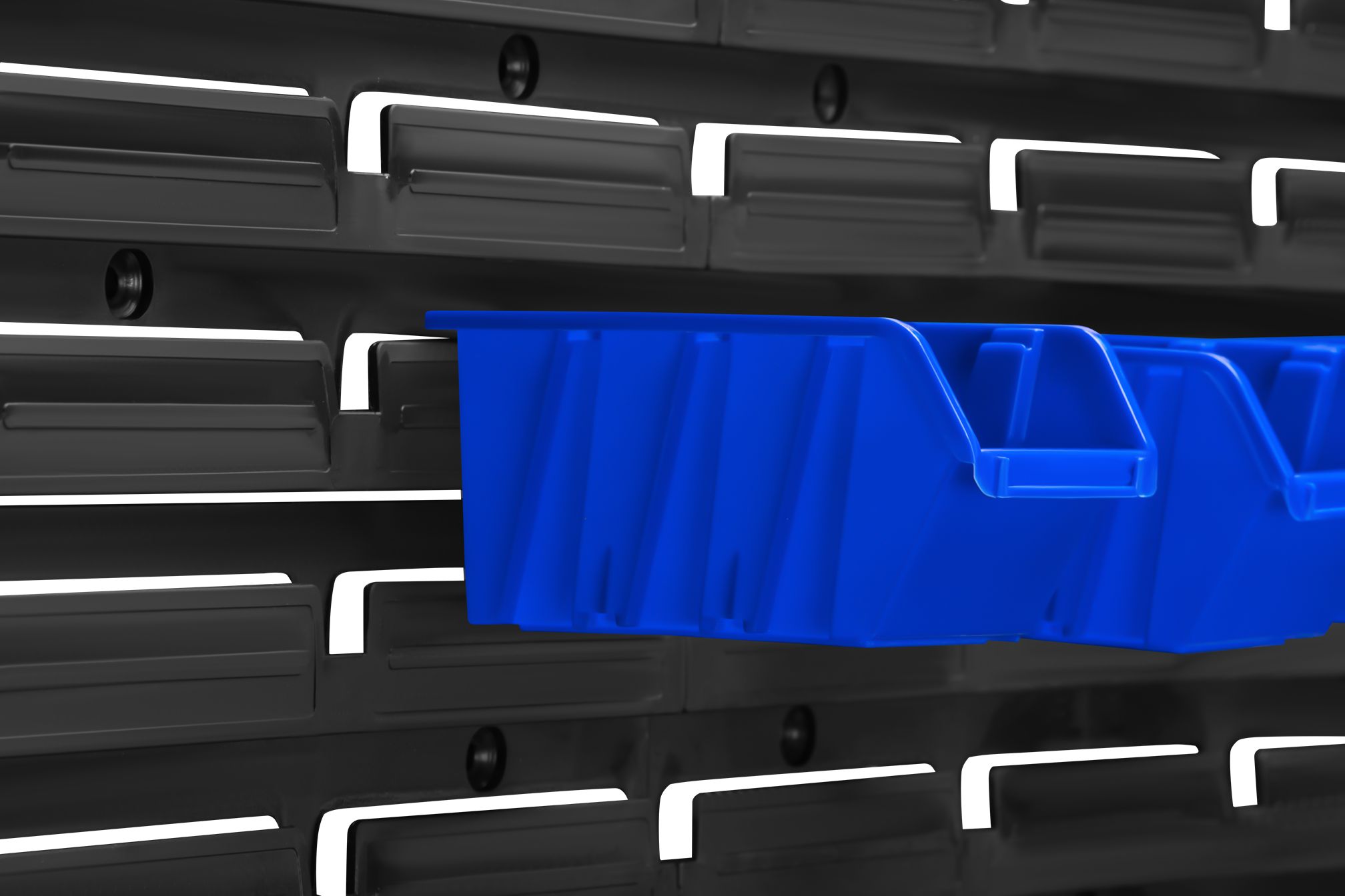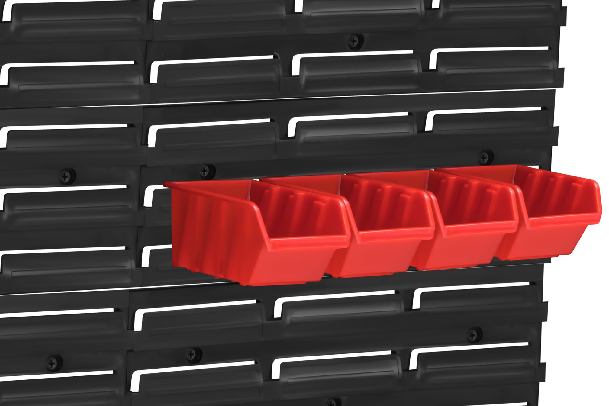 Zestaw podzielony na 12 mniejszych płyt pozwala dopasować tablicę z pojemnikami warsztatowymi do przestrzeni roboczej, także w wąskich strefach.