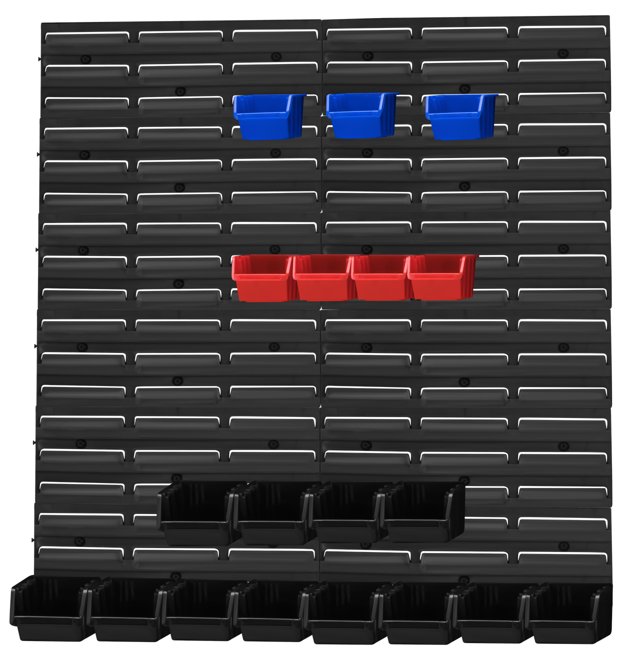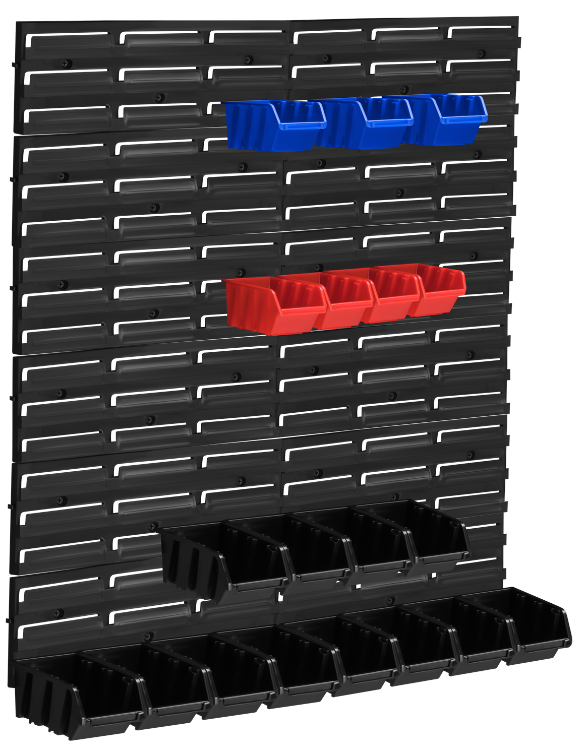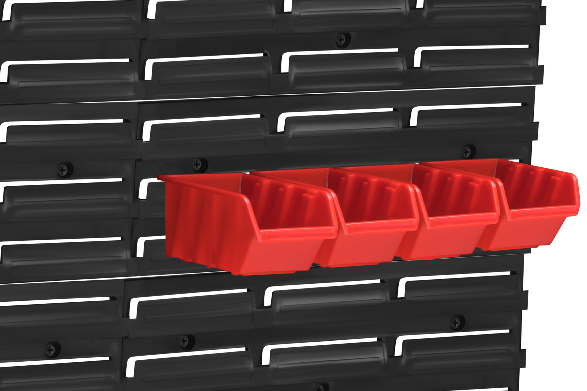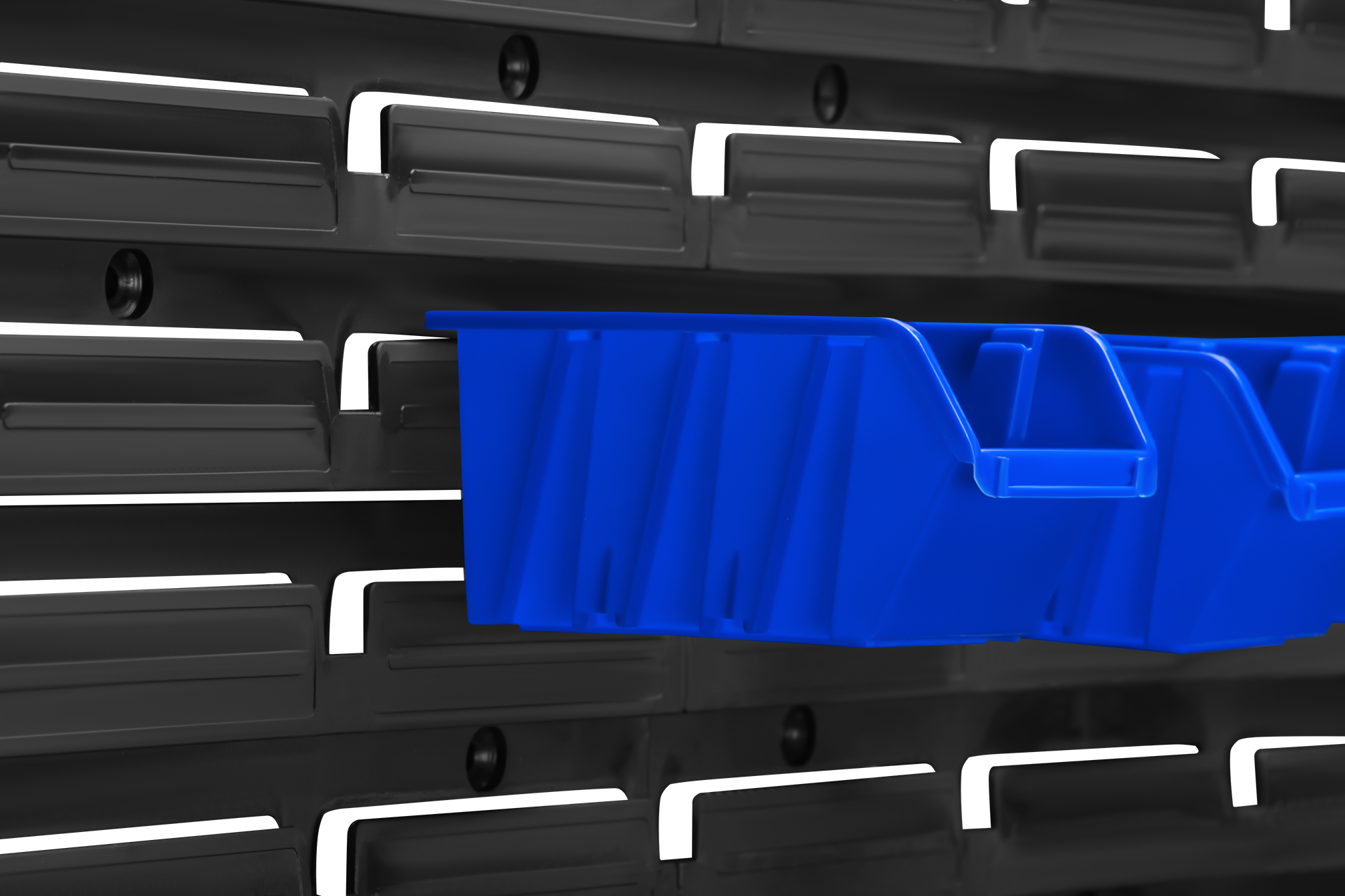 Modułowy system organizacji przestrzeni roboczej złożony z 82 pojemników sztaplowanych i 12 płyt tylnych. Zestaw przeznaczony do przechowywania i segregacji drobnych elementów w warsztacie, garażu lub magazynie. Podział na 12 niezależnych płyt pozwala swobodnie konfigurować układ i rozmiar tablicy.