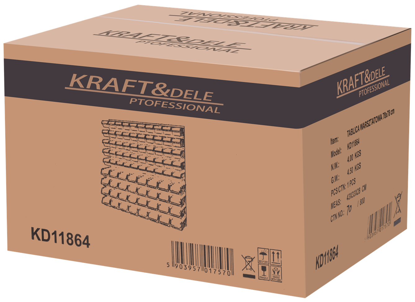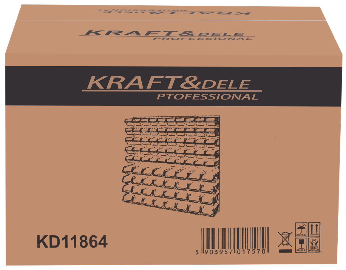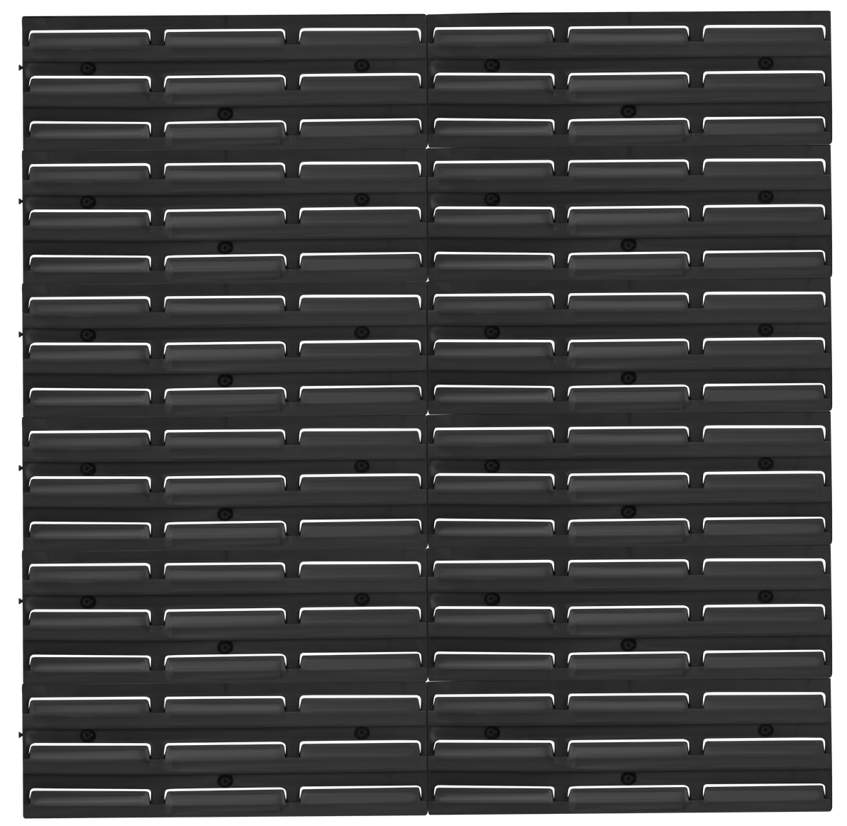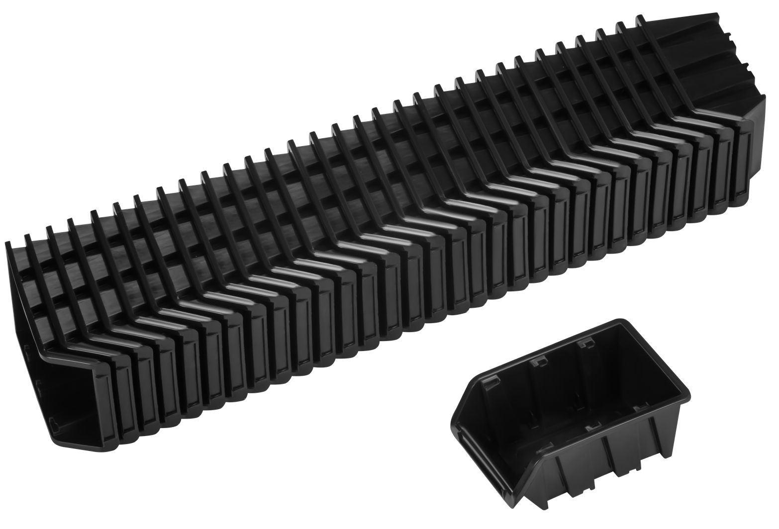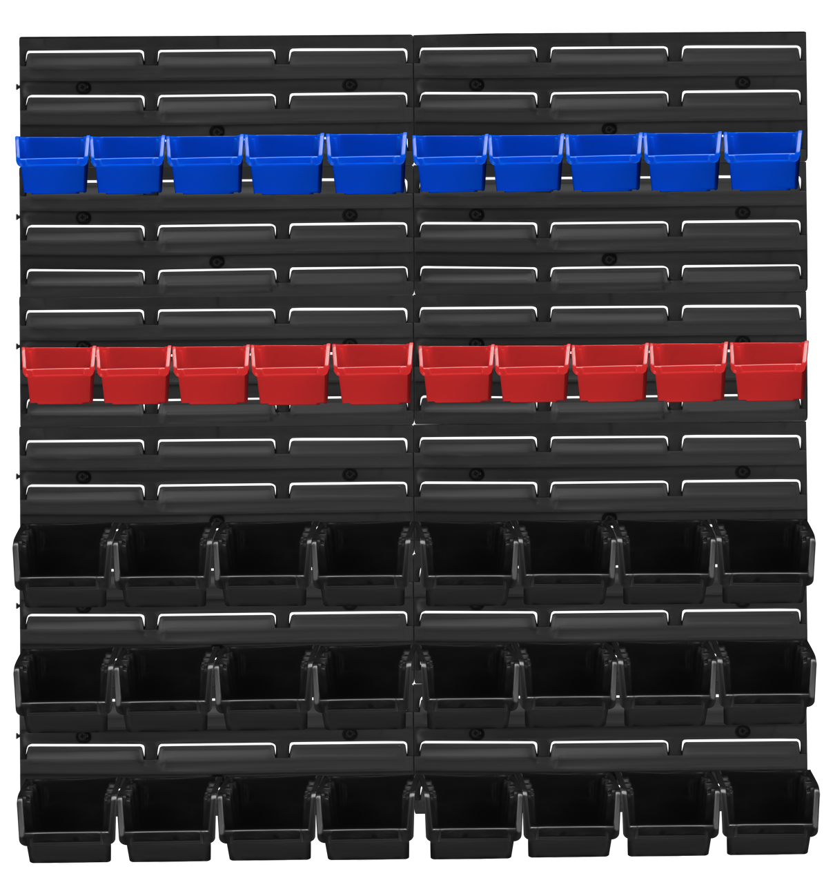 Modułowy system organizacji przestrzeni roboczej złożony z 82 pojemników sztaplowanych i 12 płyt tylnych. Zestaw przeznaczony do przechowywania i segregacji drobnych elementów w warsztacie, garażu lub magazynie. Podział na 12 niezależnych płyt pozwala swobodnie konfigurować układ i rozmiar tablicy.