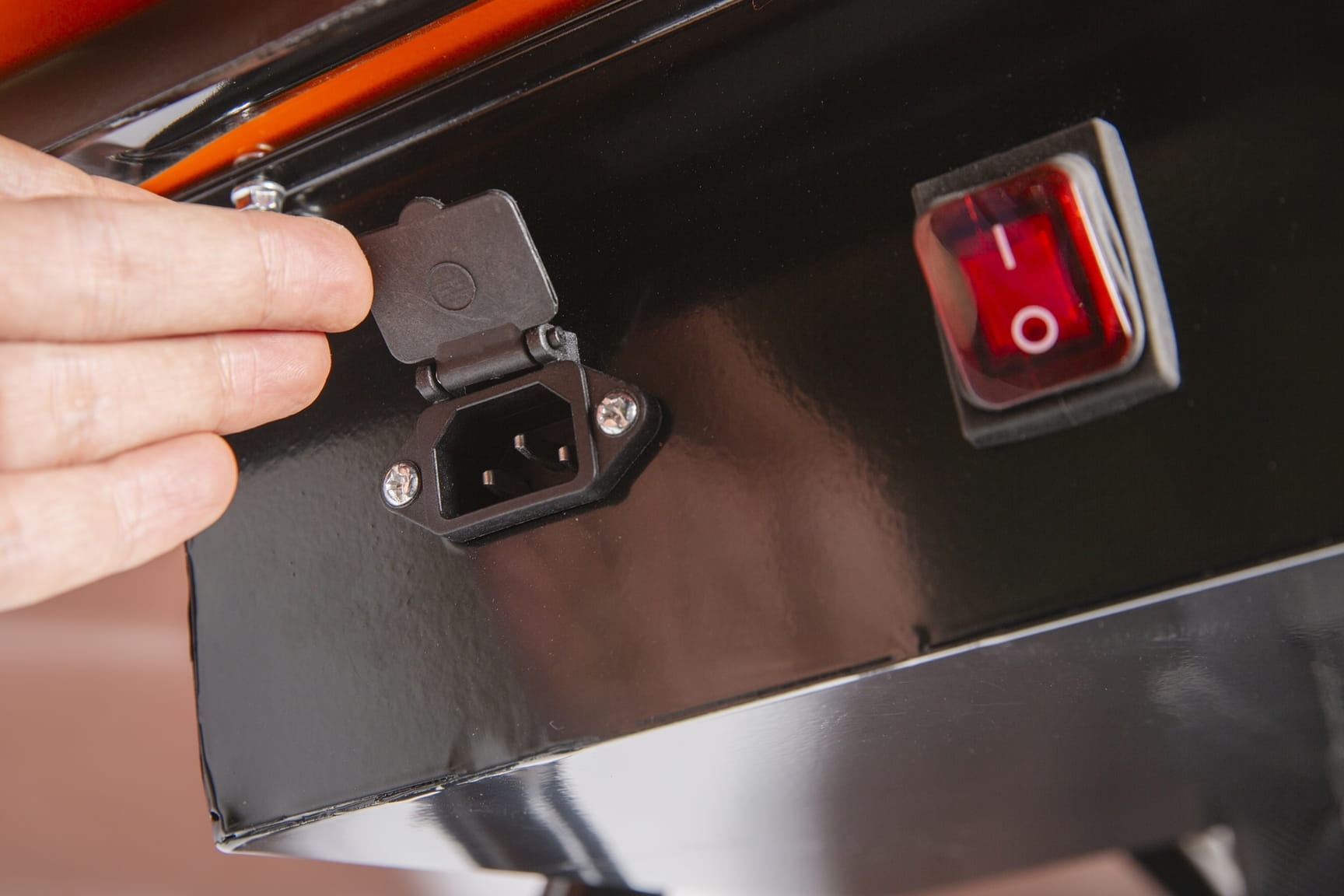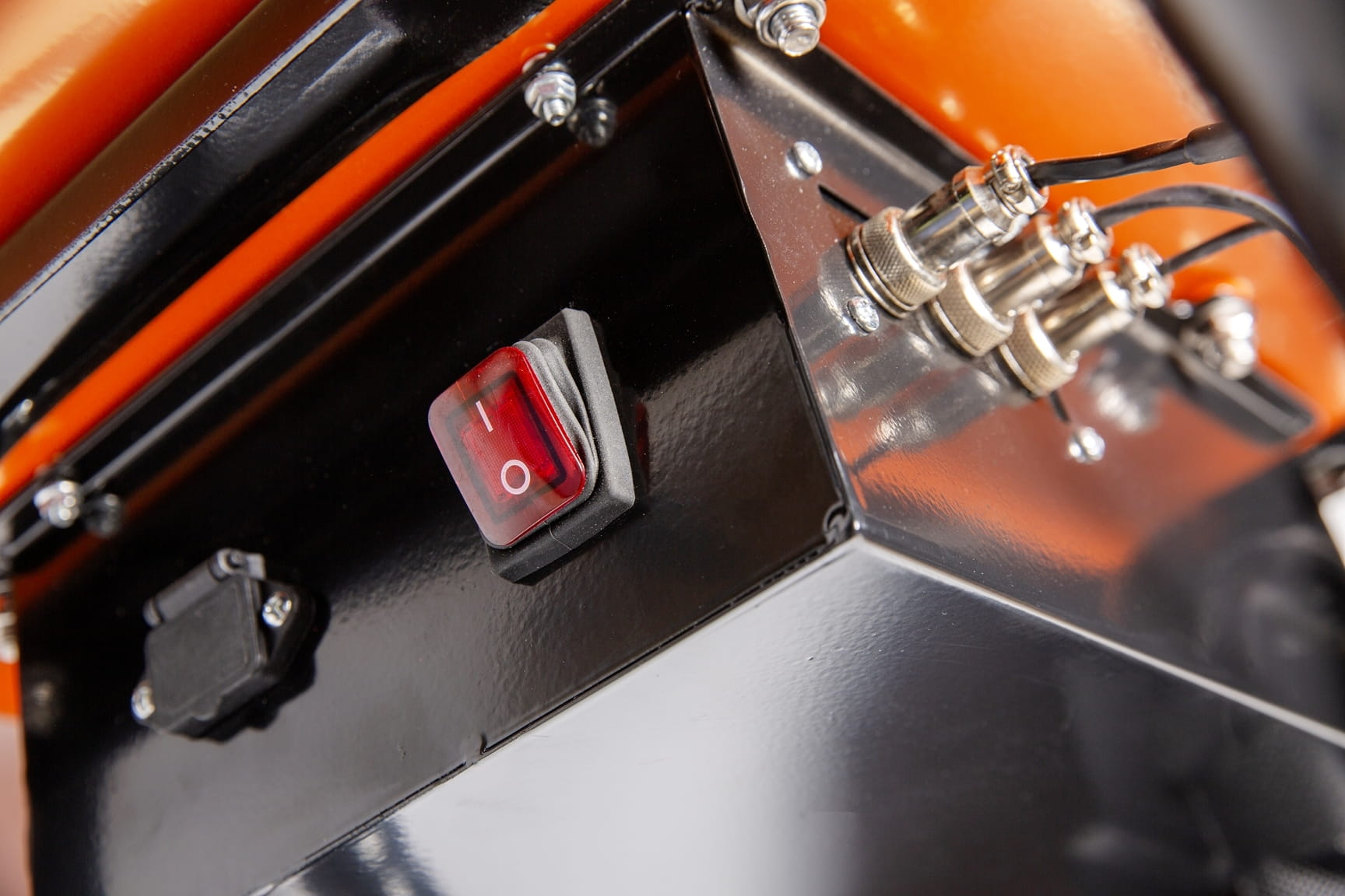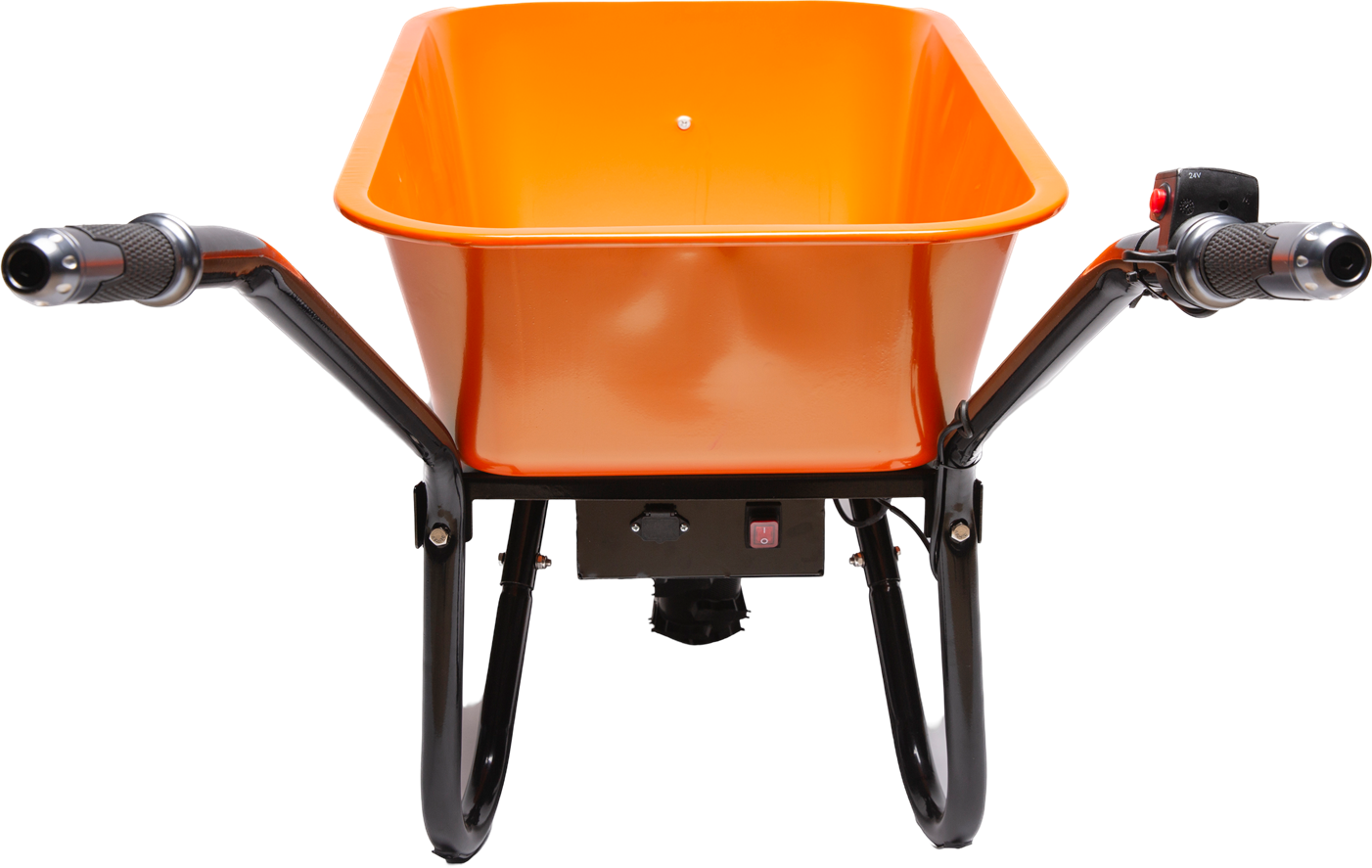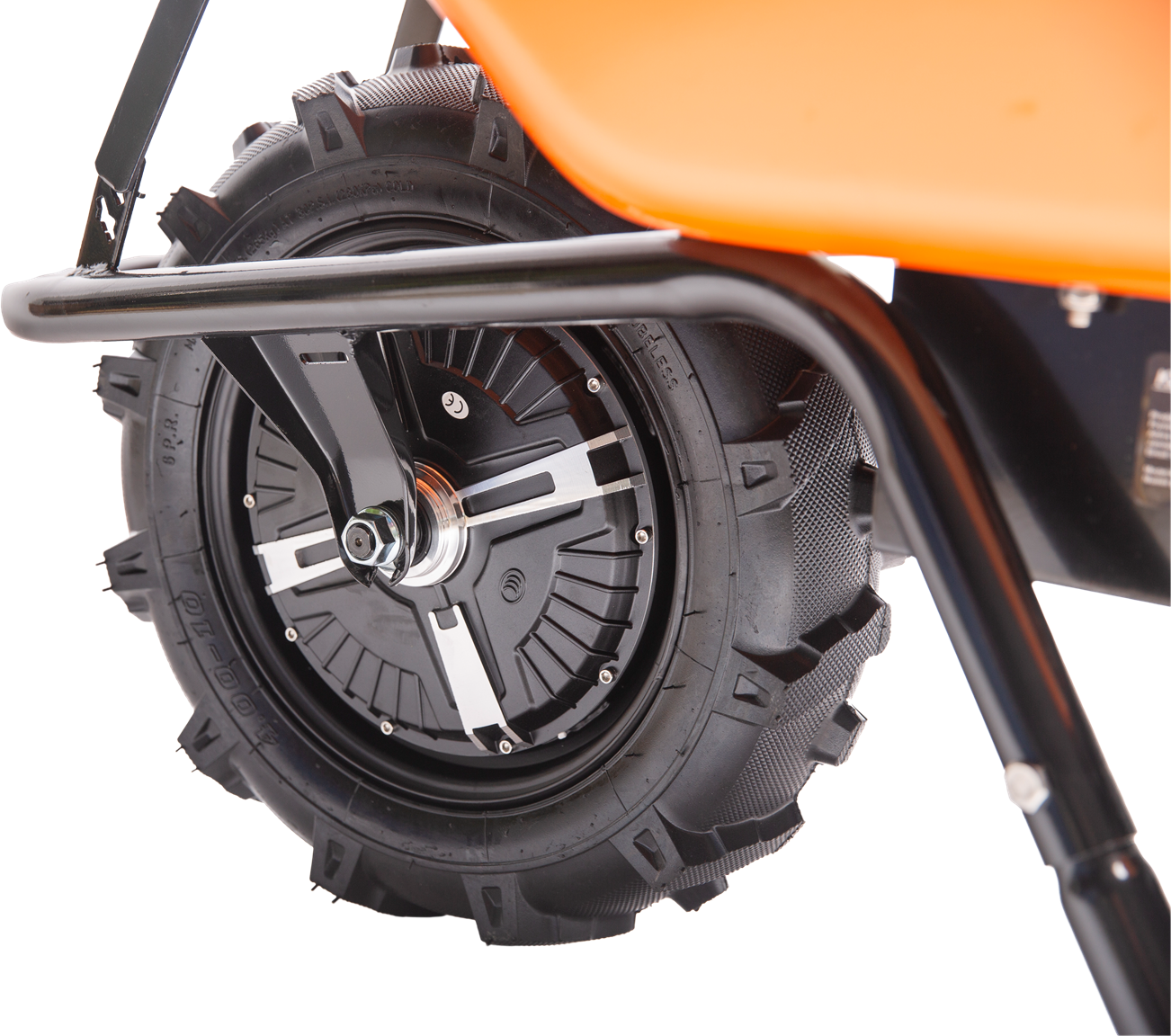 Silnik bezszczotkowy zasilany akumulatorem 24V o pojemności 12Ah zapewnia napęd bez konieczności ręcznego pchania ładunku. Regulowana prędkość jazdy (do 7 km/h) pozwala dostosować tempo pracy do nawierzchni i rodzaju przewożonego materiału. Wskaźnik poziomu naładowania baterii umieszczony na uchwycie umożliwia bieżące monitorowanie stanu akumulatora.