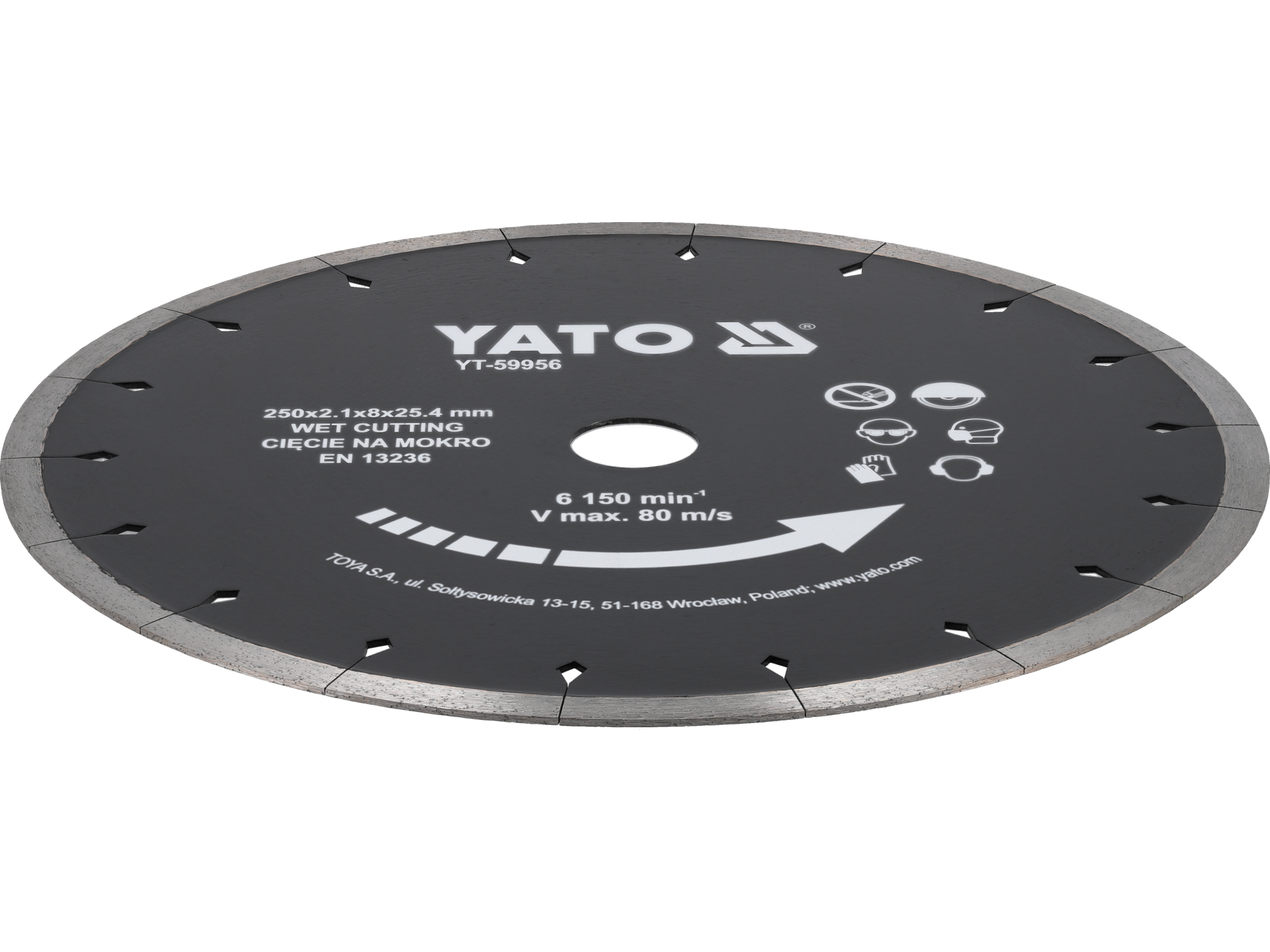 Nie należy przekraczać maksymalnych obrotów 6150 min⁻¹ – wyższe wartości mogą prowadzić do uszkodzenia tarczy. Podczas cięcia materiał należy prowadzić równomiernie bez wymuszania posuwu. Tarcza nie jest przeznaczona do cięcia metali, drewna ani tworzyw sztucznych. Należy stosować okulary ochronne i rękawice odporne na ścieranie.