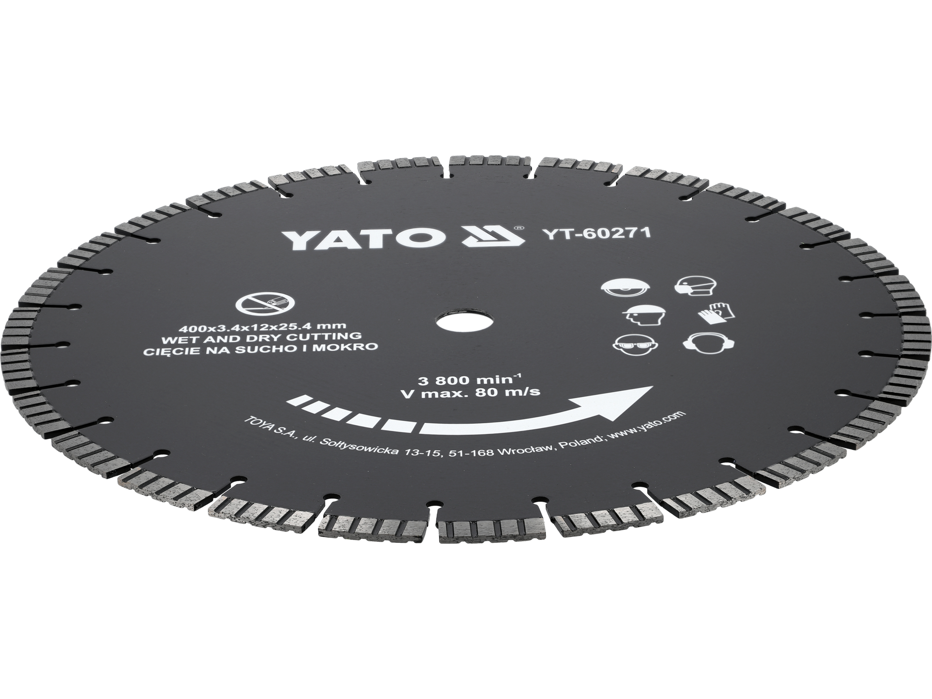 Przed pierwszym użyciem należy przeprowadzić rozruch tarczy na biegu jałowym przez 30-60 sekund, co pozwala na stabilizację segmentów. Podczas cięcia na sucho zaleca się robienie przerw co 30-45 sekund, aby tarcza mogła ostygnąć — przegrzanie skraca żywotność diamentów i może prowadzić do deformacji korpusu.