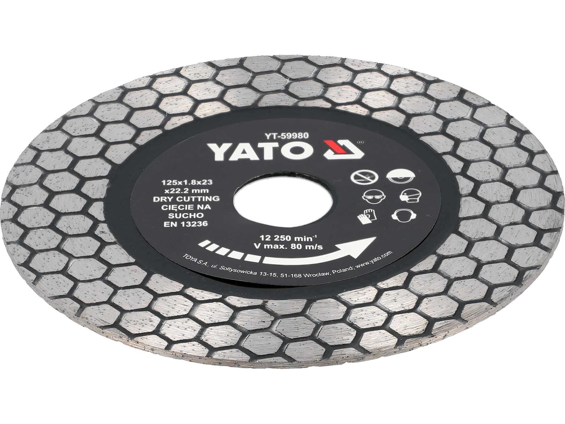 Maksymalna prędkość obrotowa 12250 min-1 nie może być przekroczona – przed uruchomieniem należy sprawdzić oznaczenie szlifierki. Praca na sucho wymaga regularnych przerw, aby zapobiec przegrzaniu segmentu diamentowego. Podczas cięcia twardych materiałów zaleca się stosowanie ochron osobistych: okularów, rękawic i maski przeciwpyłowej.