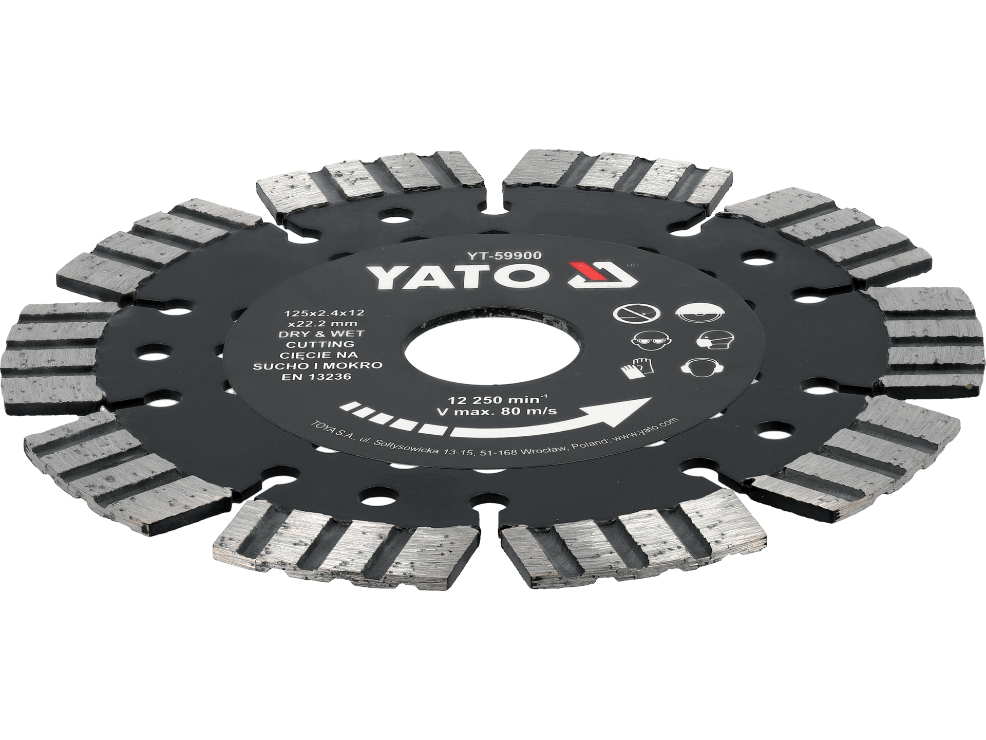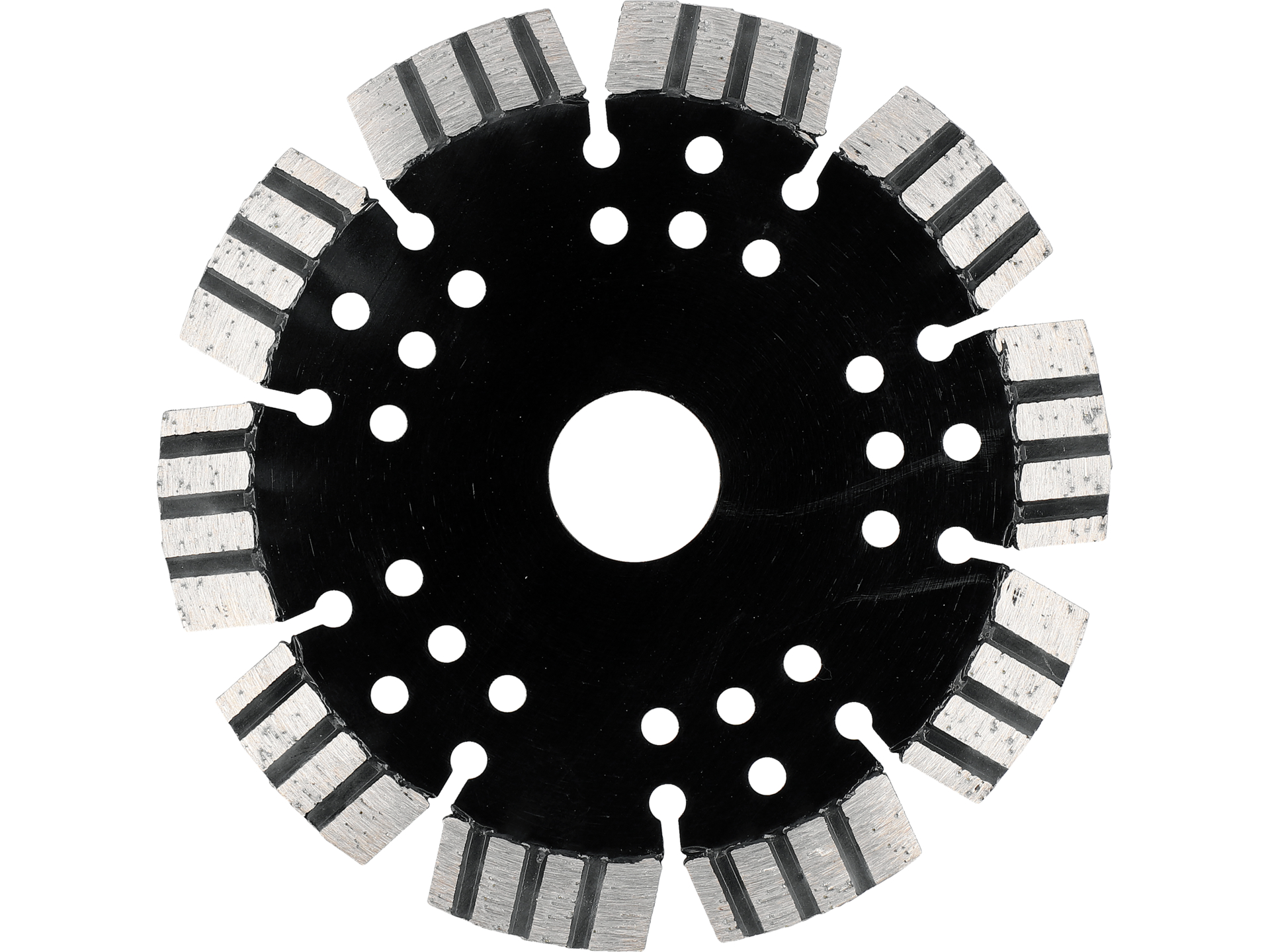 Tarcza diamentowa o średnicy 125 mm z segmentami spawanymi laserowo, przeznaczona do cięcia żelbetu, betonu utwardzonego, granitu i innych twardych materiałów budowlanych. Wykonana ze stali 30 CrMo, umożliwia pracę na sucho i mokro.