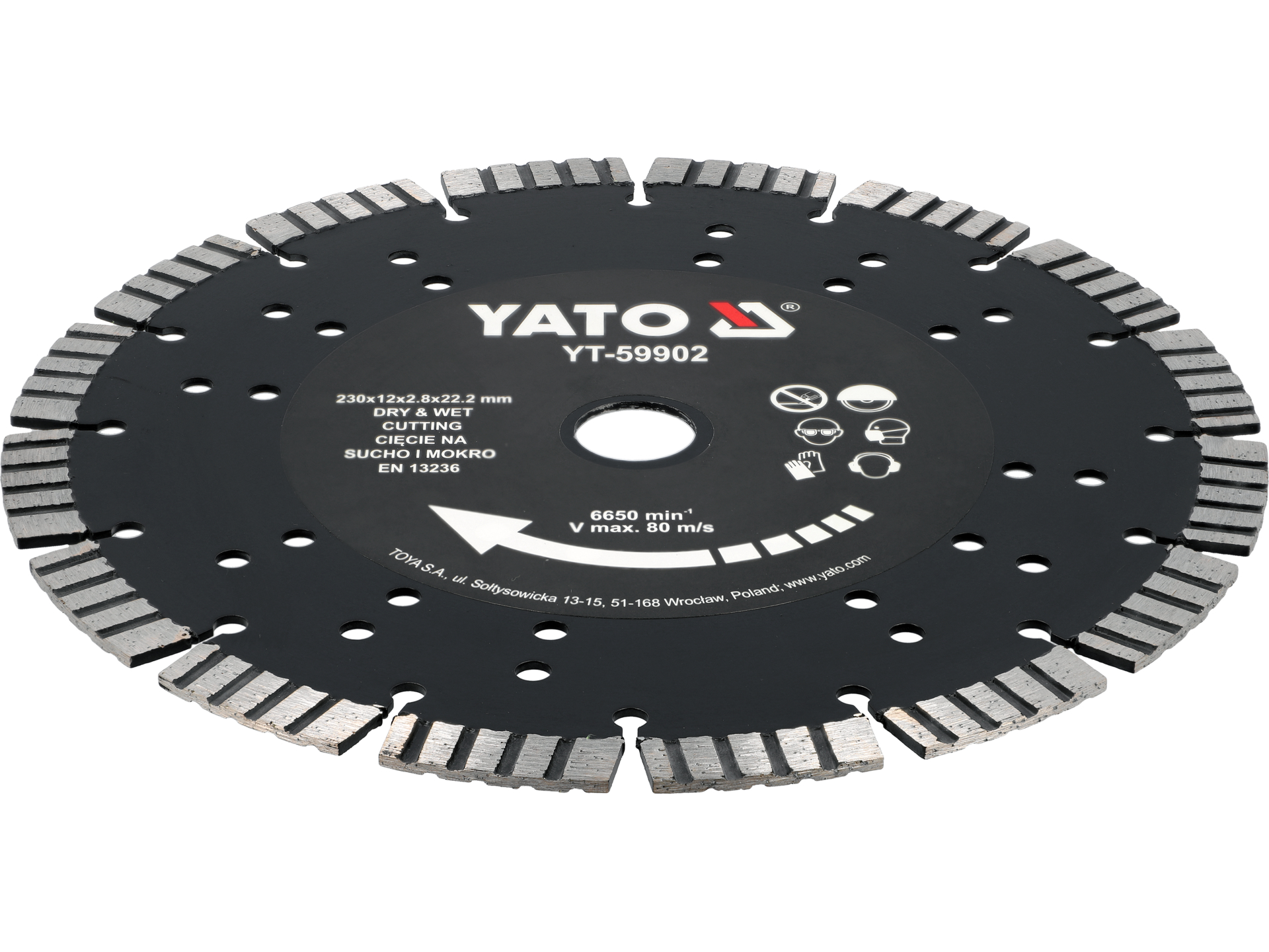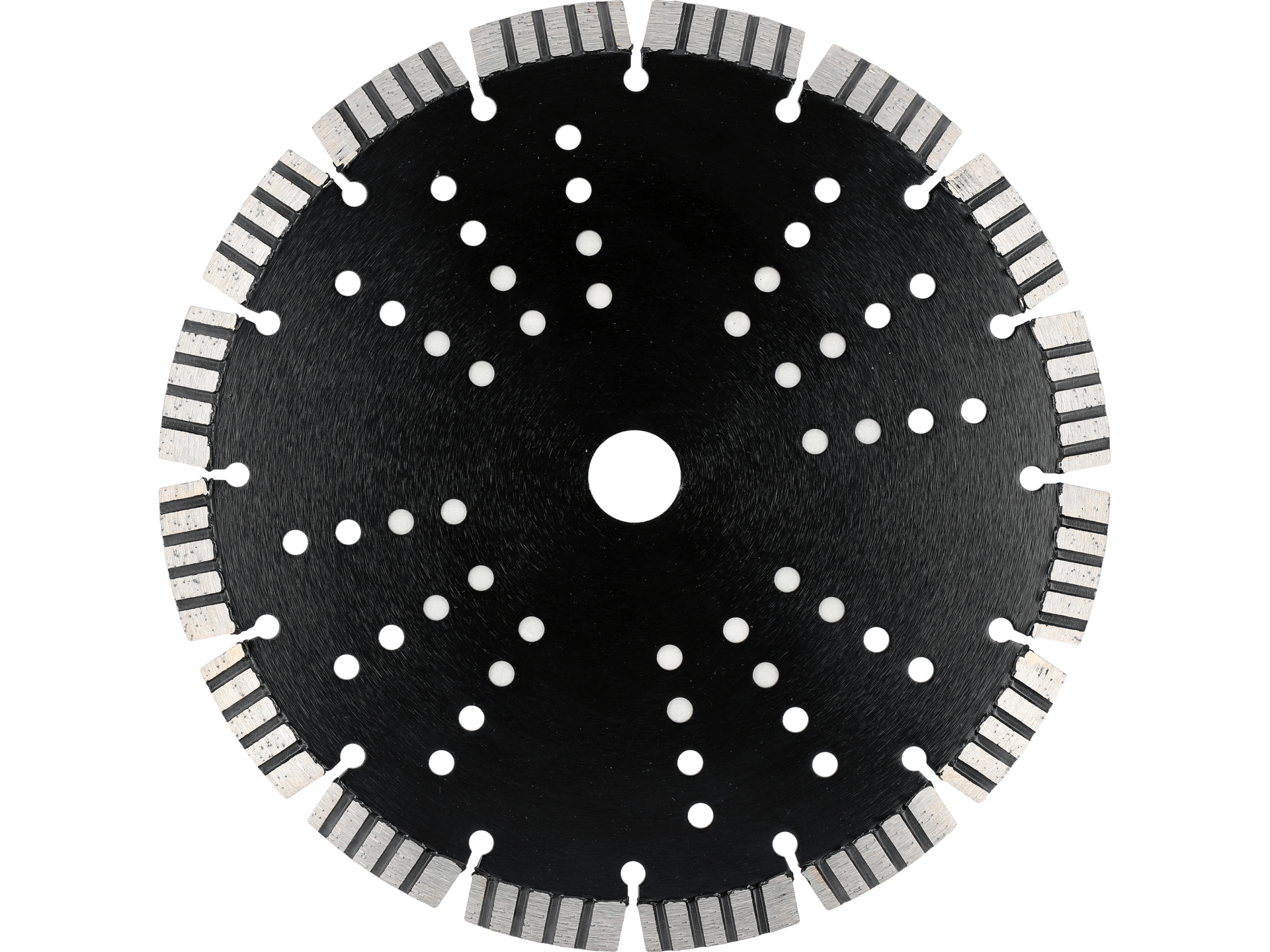 Tarcza diamentowa z laserowo spawanymi segmentami przeznaczona do cięcia betonu zbrojonego, żelbetu i materiałów kamiennych. Konstrukcja ze stali 30 CrMo zapewnia stabilność przy pracy z maksymalną prędkością 6650 obr/min.