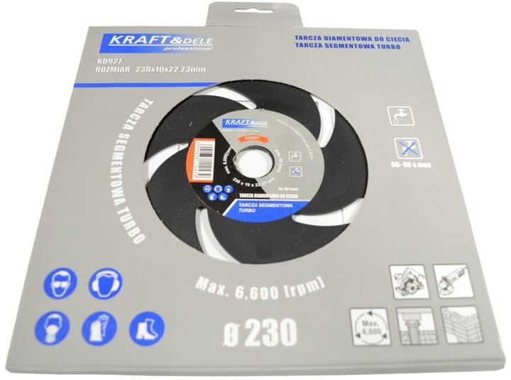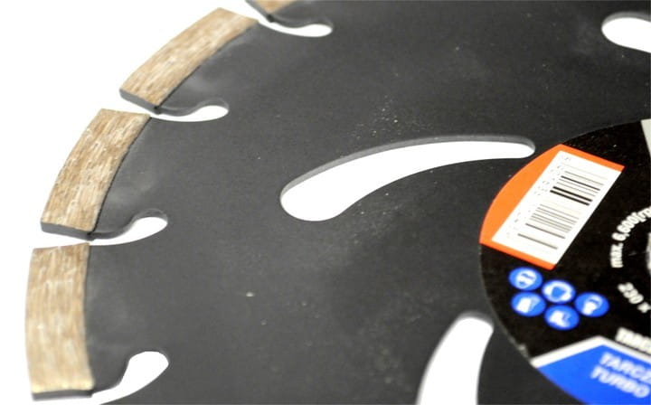 Tarcza diamentowa segmentowa typu Turbo przeznaczona do cięcia materiałów budowlanych twardych i ściernych. Korpus ze stali kobaltowo-niklowej z domieszką miedzi oraz segment tnący z 20% zawartością diamentu syntetycznego klasy JR4 pozwalają na pracę zarówno na sucho, jak i z chłodzeniem wodnym.