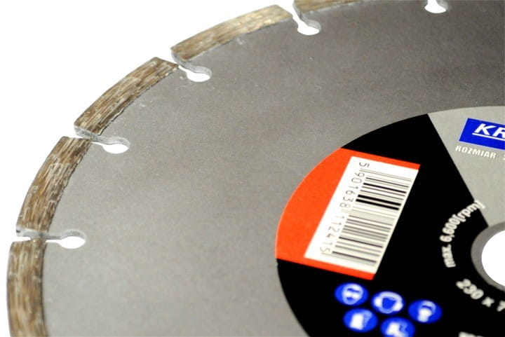 Tarcza diamentowa segmentowa przeznaczona do cięcia materiałów budowlanych na sucho i mokro. Segment tnący zawiera 20% diamentu syntetycznego klasy JR4, a korpus wykonany ze stali kobaltowo-niklowej z dodatkiem miedzi zapewnia odporność na pęknięcia przy dużych prędkościach obrotowych.