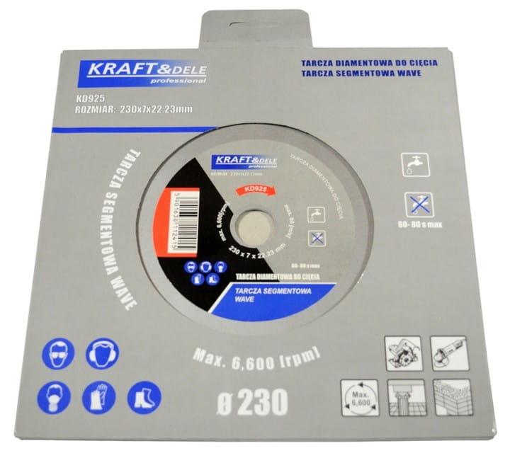 Tarcza segmentowa KD925 przeznaczona jest do cięcia materiałów budowlanych szlifierkami kątowymi o odpowiedniej mocy. Otwór montażowy 22,23 mm jest standardowym rozmiarem stosowanym w szlifierkach kątowych 230 mm — przed montażem należy zweryfikować maksymalną dopuszczalną prędkość obrotową urządzenia (nie powinna przekraczać 6600 rpm).