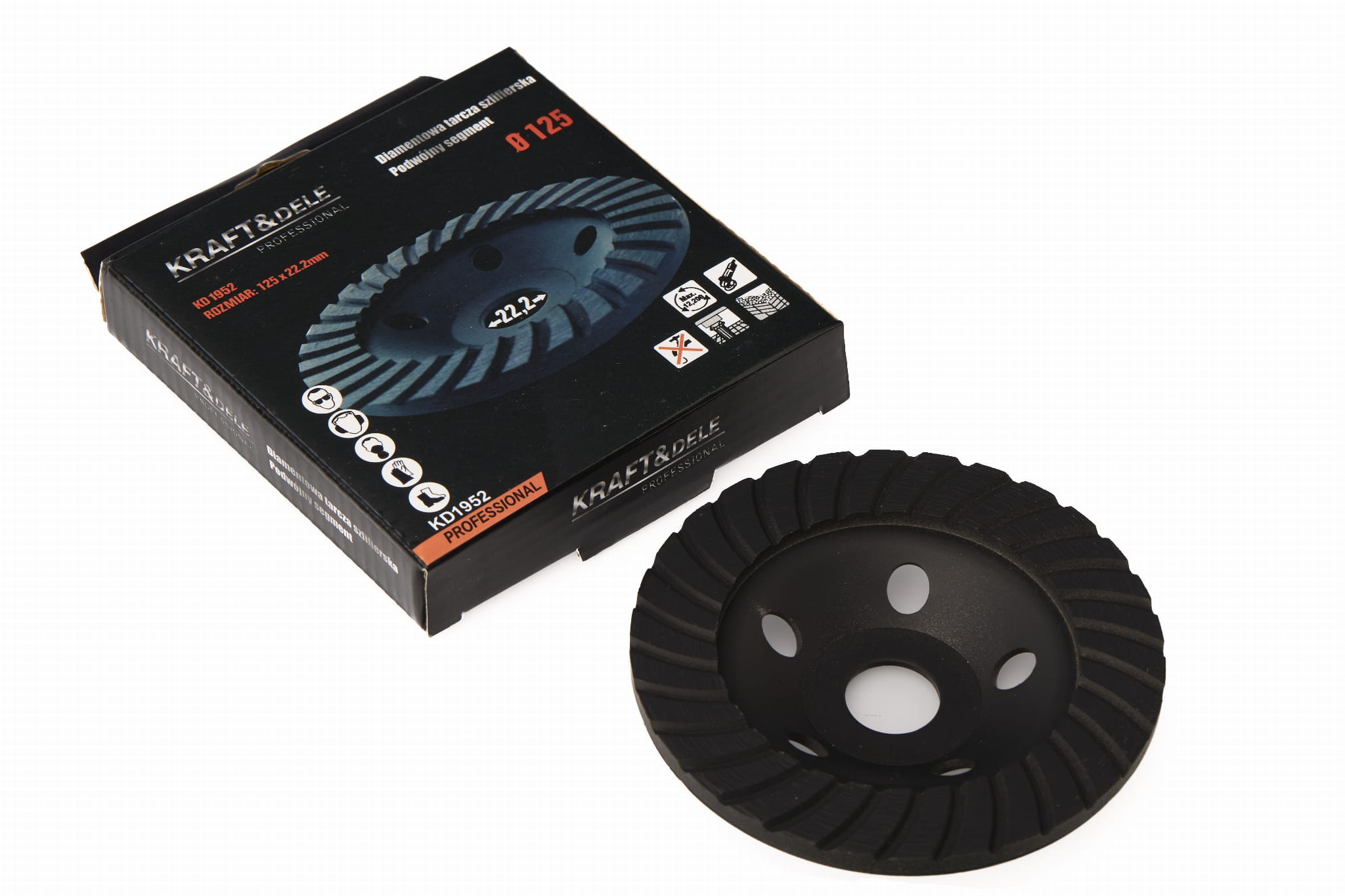 KD1952 to tarcza szlifierska garnkowa przeznaczona do obróbki powierzchni betonowych. Format 125 mm z otworem montażowym 22,2 mm pozwala na montaż w standardowych szlifierkach kątowych, umożliwiając wyrównywanie podłoży, usuwanie nadlewów i przygotowanie betonu pod dalsze prace wykończeniowe.
