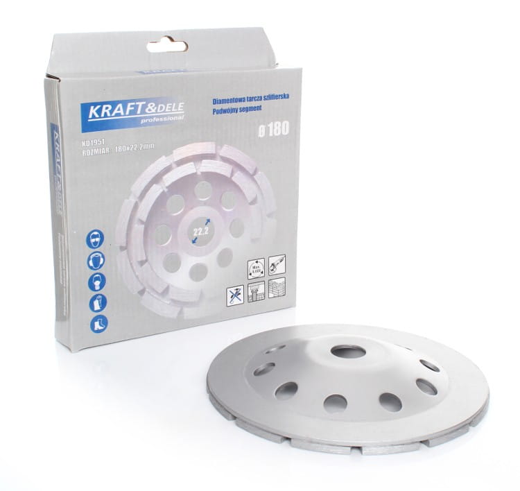 Tarcza diamentowa z podwójnym segmentem przeznaczona do szlifowania powierzchni z betonu, kamienia, ceramiki, kostki brukowej i pokrewnych materiałów budowlanych. Współpracuje z szlifierkami kątowymi wyposażonymi w wrzeciono 22,2 mm oraz z systemami odpylającymi.