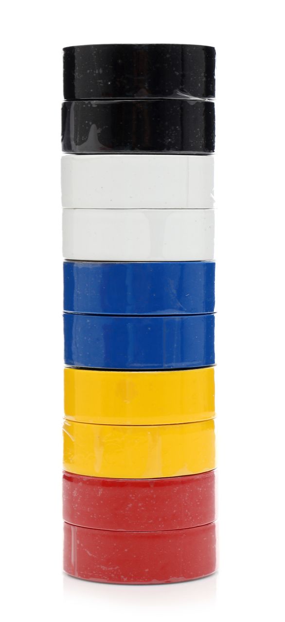 Zestaw dziesięciu taśm izolacyjnych z folii PVC przeznaczonych do izolacji elektrycznej oraz oznaczania przewodów i kabli. Każda taśma mierzy 19 mm szerokości i 10 m długości przy grubości 0,13 mm, a napięcie robocze przekracza 600 V.