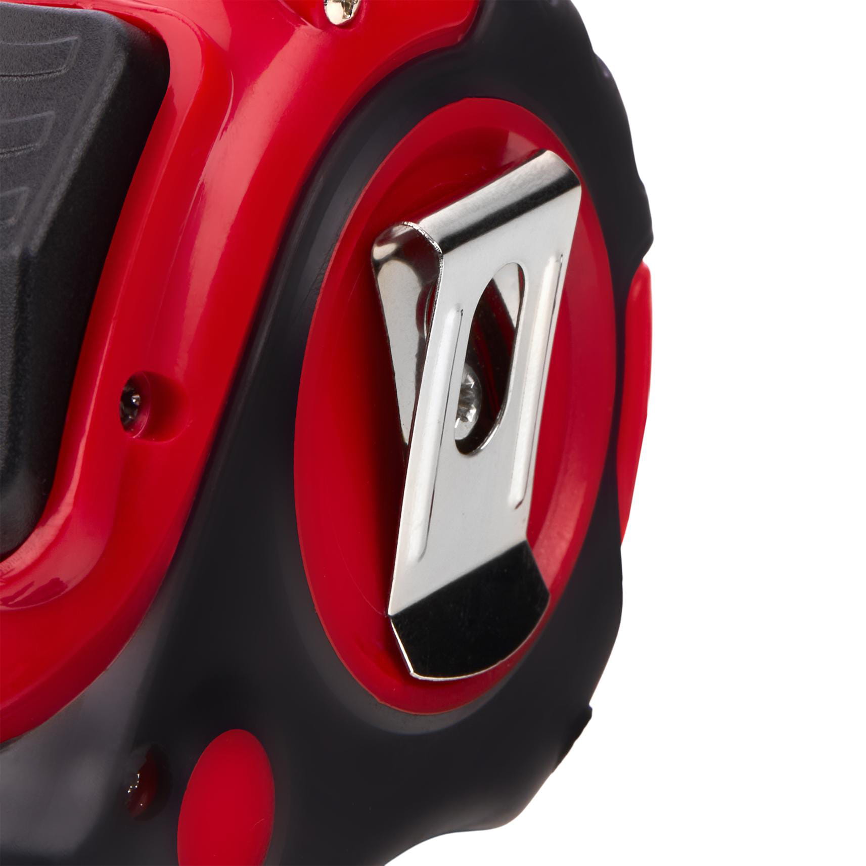Stalowa taśma miernicza o długości 5 metrów i szerokości 19 mm, wyposażona w mechanizm automatycznej blokady oraz antypoślizgowy uchwyt z gumową powłoką. Przeznaczona do pomiarów na budowie, podczas prac stolarskich oraz remontowych.