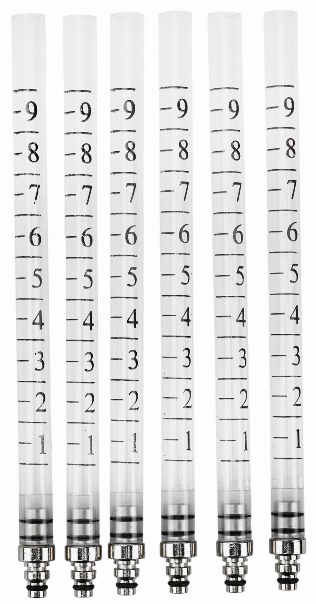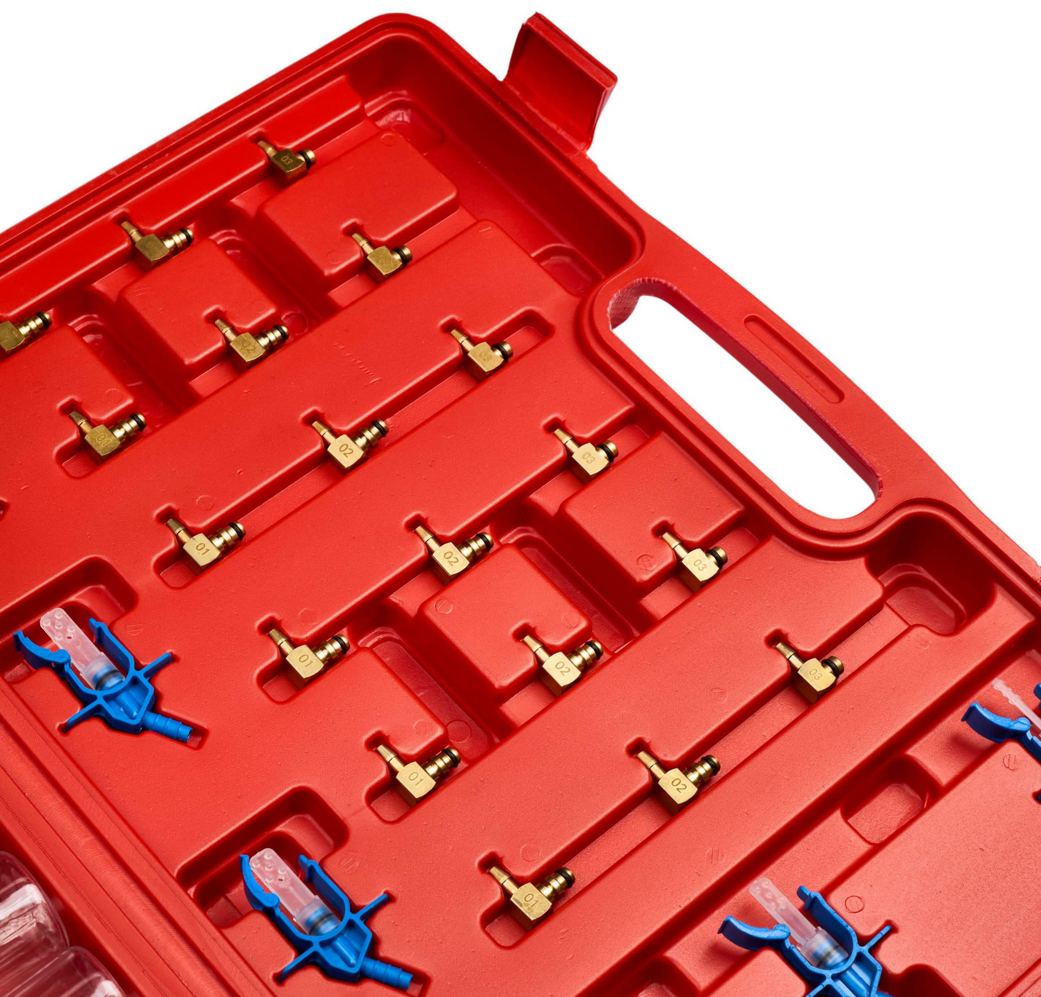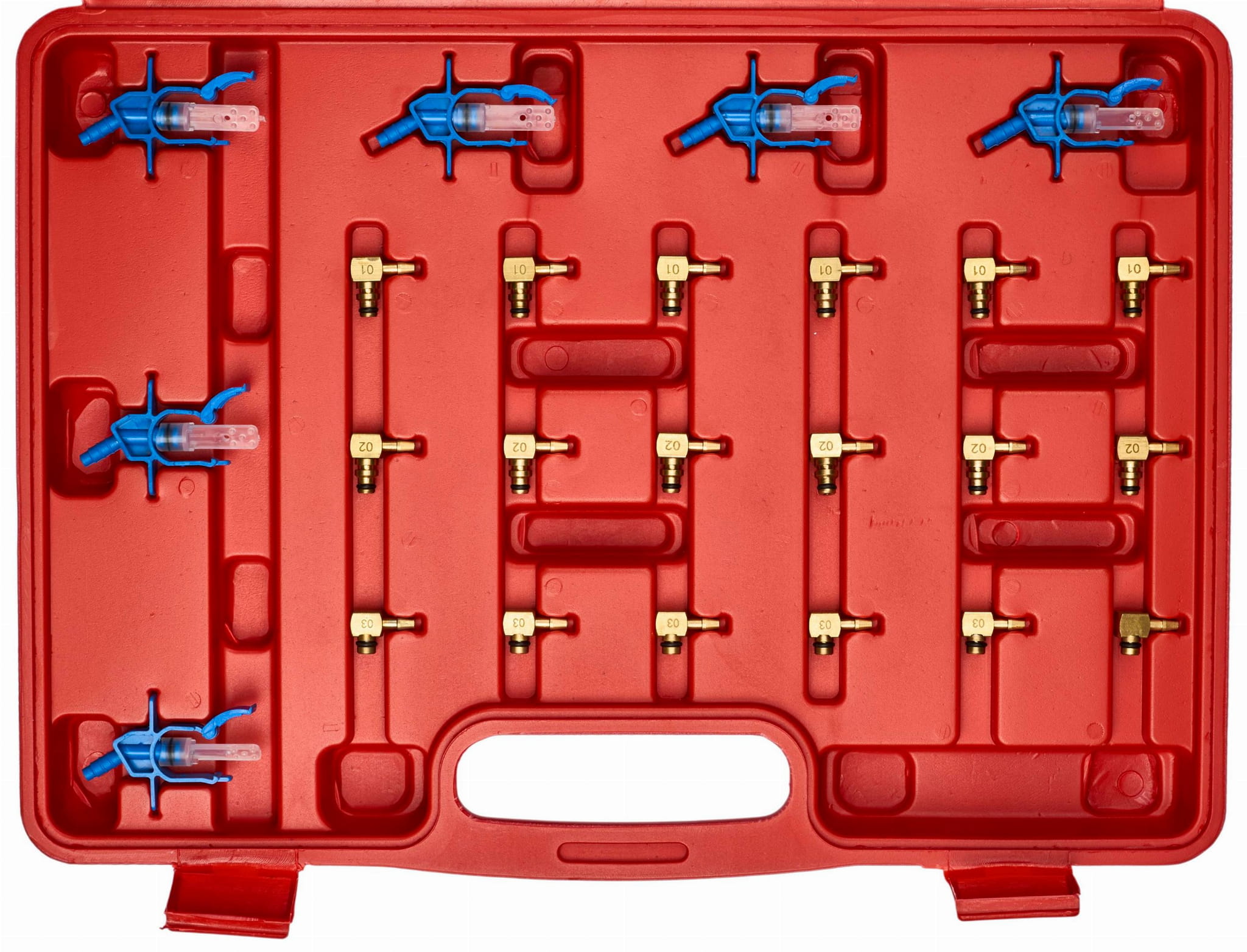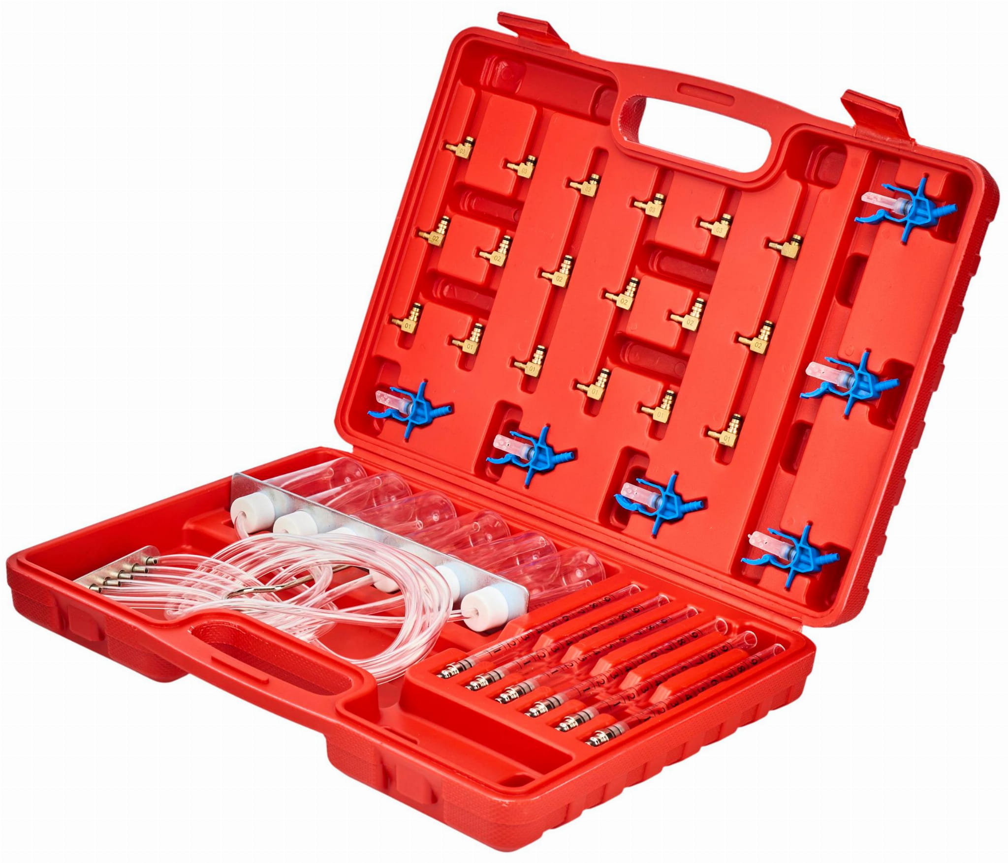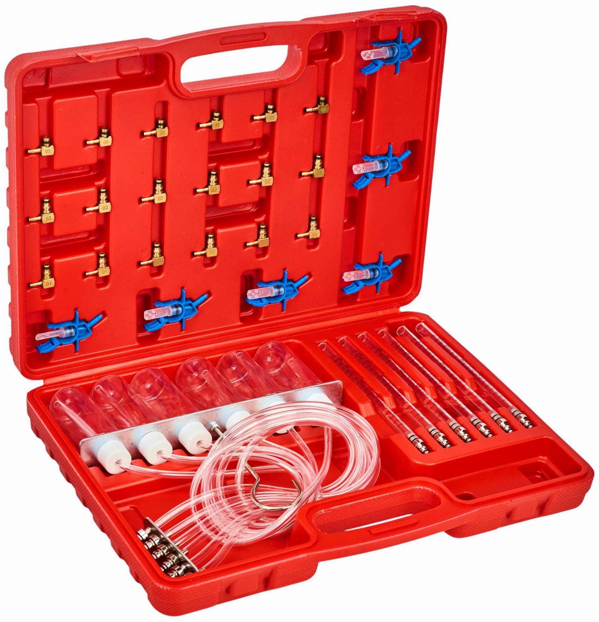 Zestaw zawiera menzurki w dwóch rozmiarach (duże i małe), co pozwala na precyzyjny odczyt ilości paliwa zebranego z każdego wtryskiwacza w trakcie testu. Wyniki dla poszczególnych cylindrów porównuje się ze sobą w celu identyfikacji wadliwego elementu.