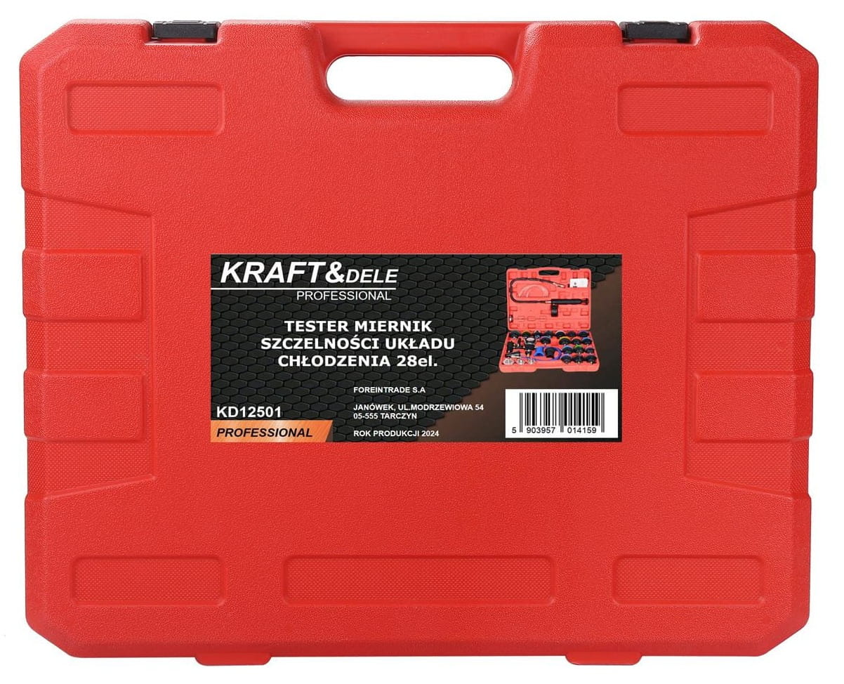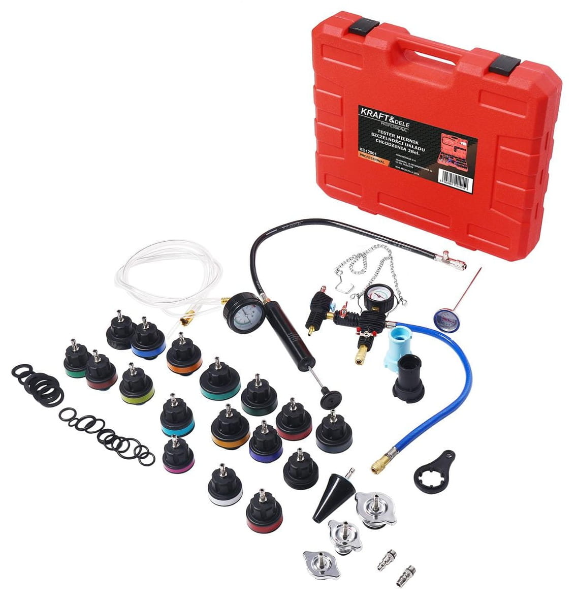 KD12501 to zestaw narzędzi warsztatowych przeznaczony do diagnostyki szczelności układu chłodzenia w pojazdach osobowych. Umożliwia lokalizację nieszczelności w chłodnicy, korkach ciśnieniowych i przewodach, a także przeprowadzenie odpowietrzania oraz wymiany płynu chłodniczego. Zestaw obejmuje 28 elementów — w tym 17 ponumerowanych adapterów kolorowych — co pozwala na pracę z większością samochodów europejskich, japońskich i amerykańskich.