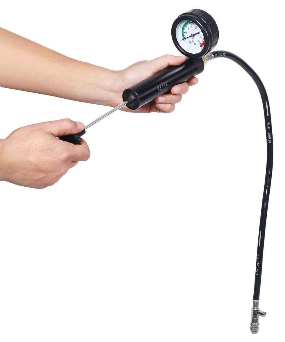 Ręczna pompka pozwala wytworzyć ciśnienie w układzie chłodzenia bez uruchamiania silnika. Manometr wskazuje poziom ciśnienia w czasie rzeczywistym — spadek wartości sygnalizuje nieszczelność. Zakres 0–35 PSI odpowiada typowym ciśnieniom roboczym układów chłodzenia pojazdów osobowych.