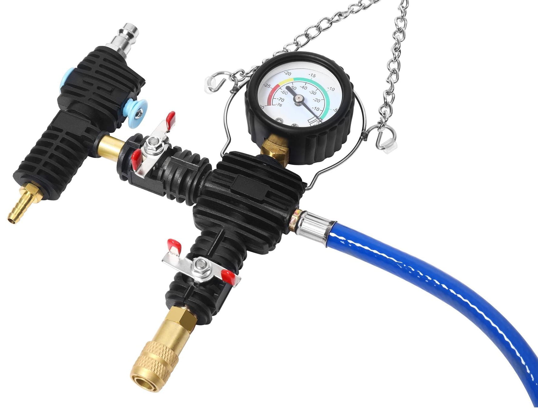 Dodatkowy element zestawu umożliwia przedmuch układu chłodzenia oraz jego odpowietrzanie przy wymianie płynu. Obecność powietrza w układzie może powodować przegrzewanie silnika — narzędzie pozwala skutecznie usunąć pęcherzyki gazu bez konieczności długiego rozgrzewania pojazdu.