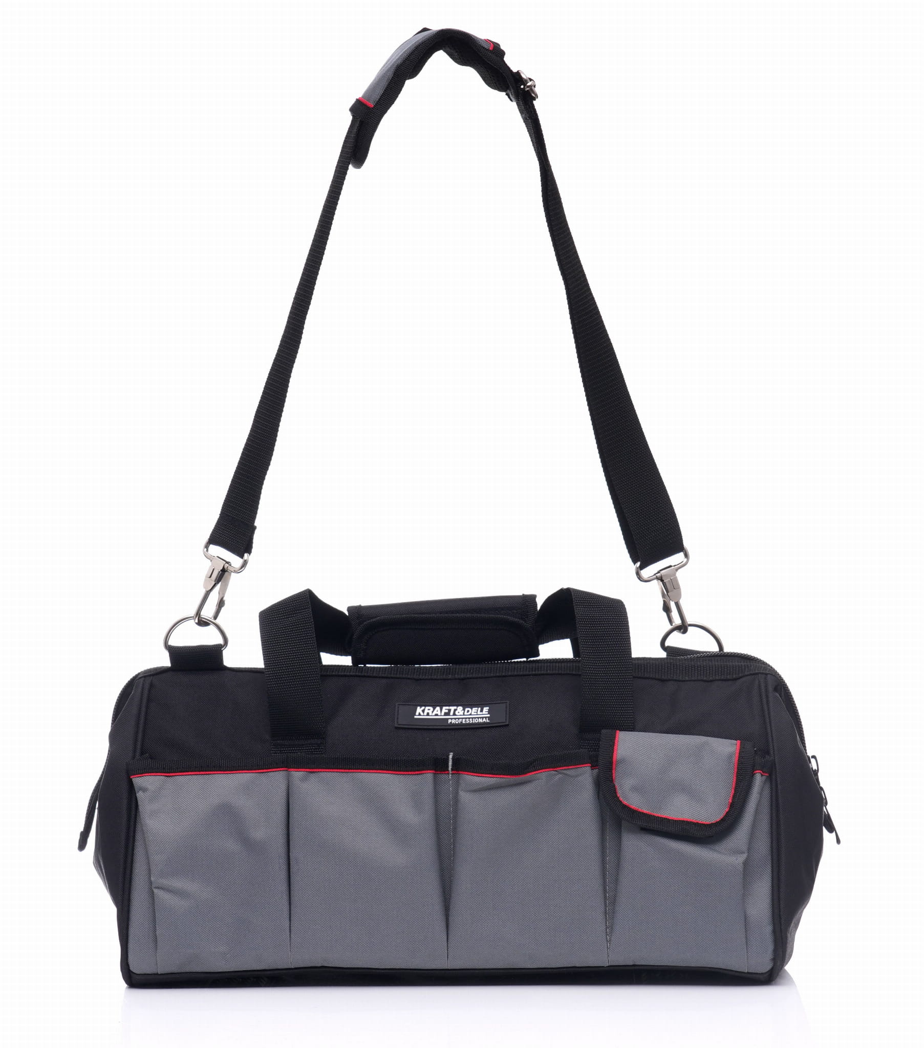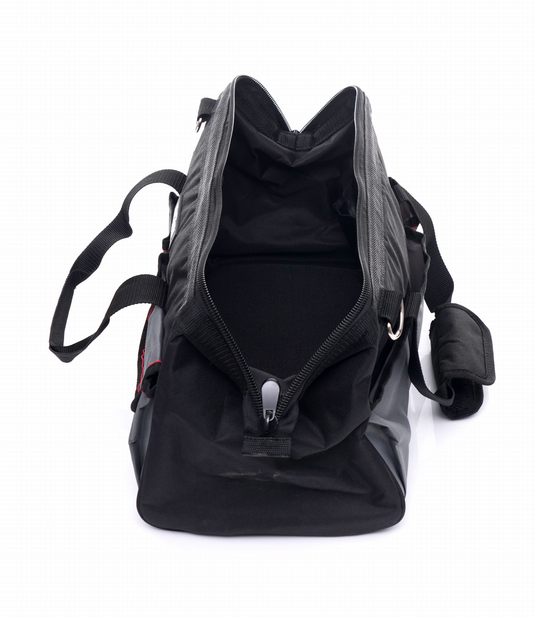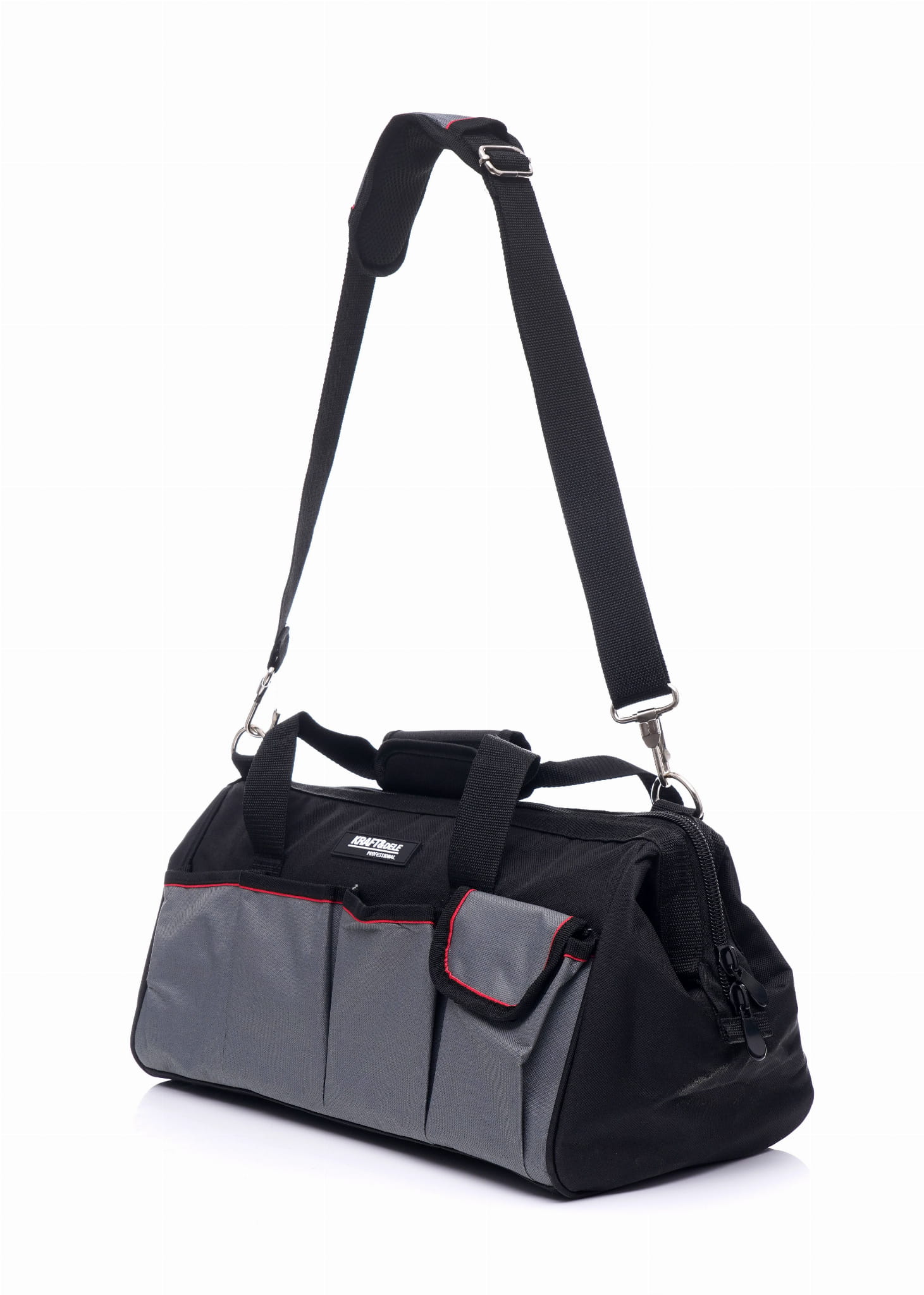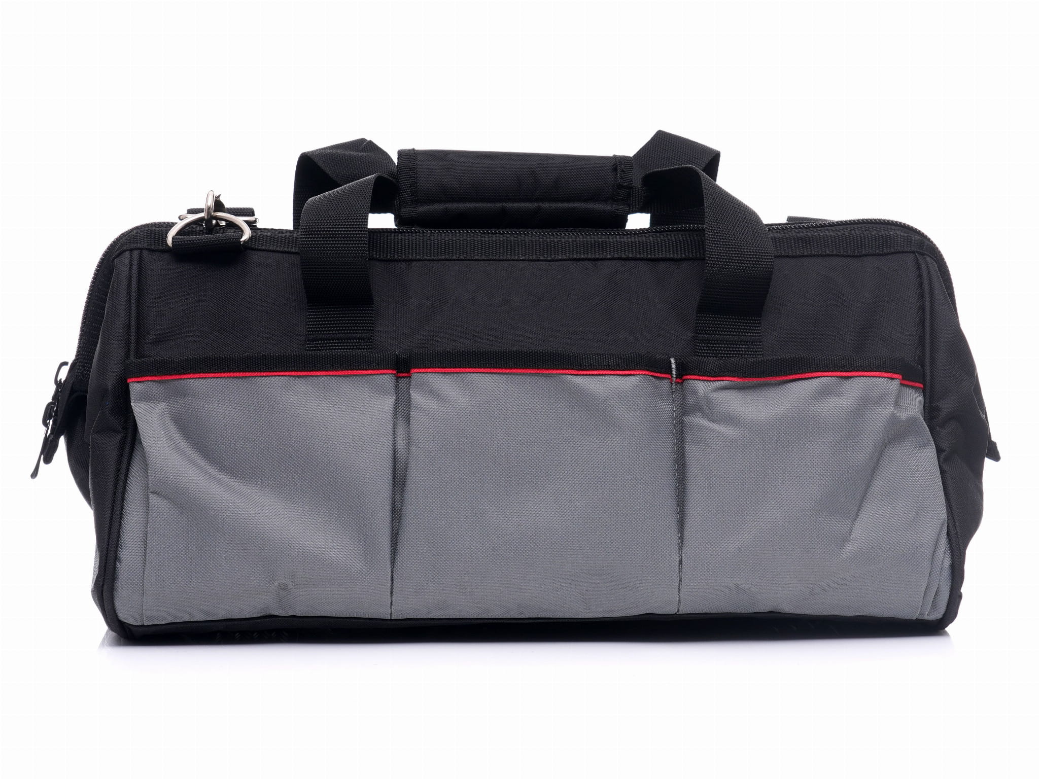 Rozmiar 18" odpowiada standardowemu zestawowi narzędzi ręcznych dla jednej osoby. Twarda podstawa jest kluczowa, jeśli torba będzie stawiana na nierównych powierzchniach lub w wilgotnych warunkach — miękkie dno odkształca się i utrudnia dostęp do narzędzi. Metalowe nity przy uchwytach to istotny wskaźnik trwałości — w tańszych modelach szwy przy rączkach są pierwszym punktem awarii przy regularnym, obciążonym użytkowaniu.