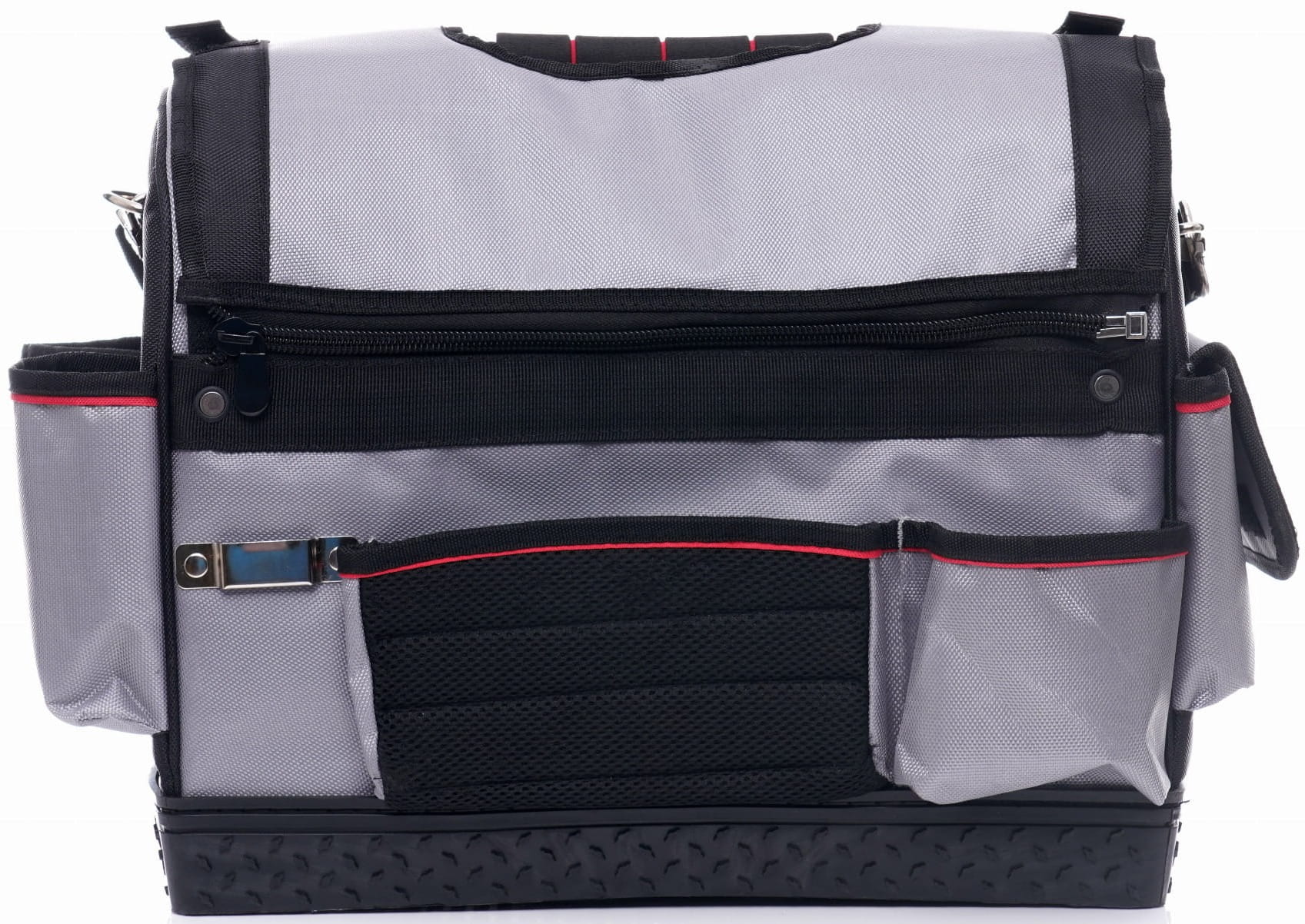 Dodatkowa kieszeń z przodu torby przeznaczona na drobne akcesoria (bity, śruby, opaski kablowe) lub przedmioty osobiste (dokumenty, telefon). Oddzielenie tej przestrzeni od głównego przedziału narzędziowego ułatwia porządkowanie zawartości.