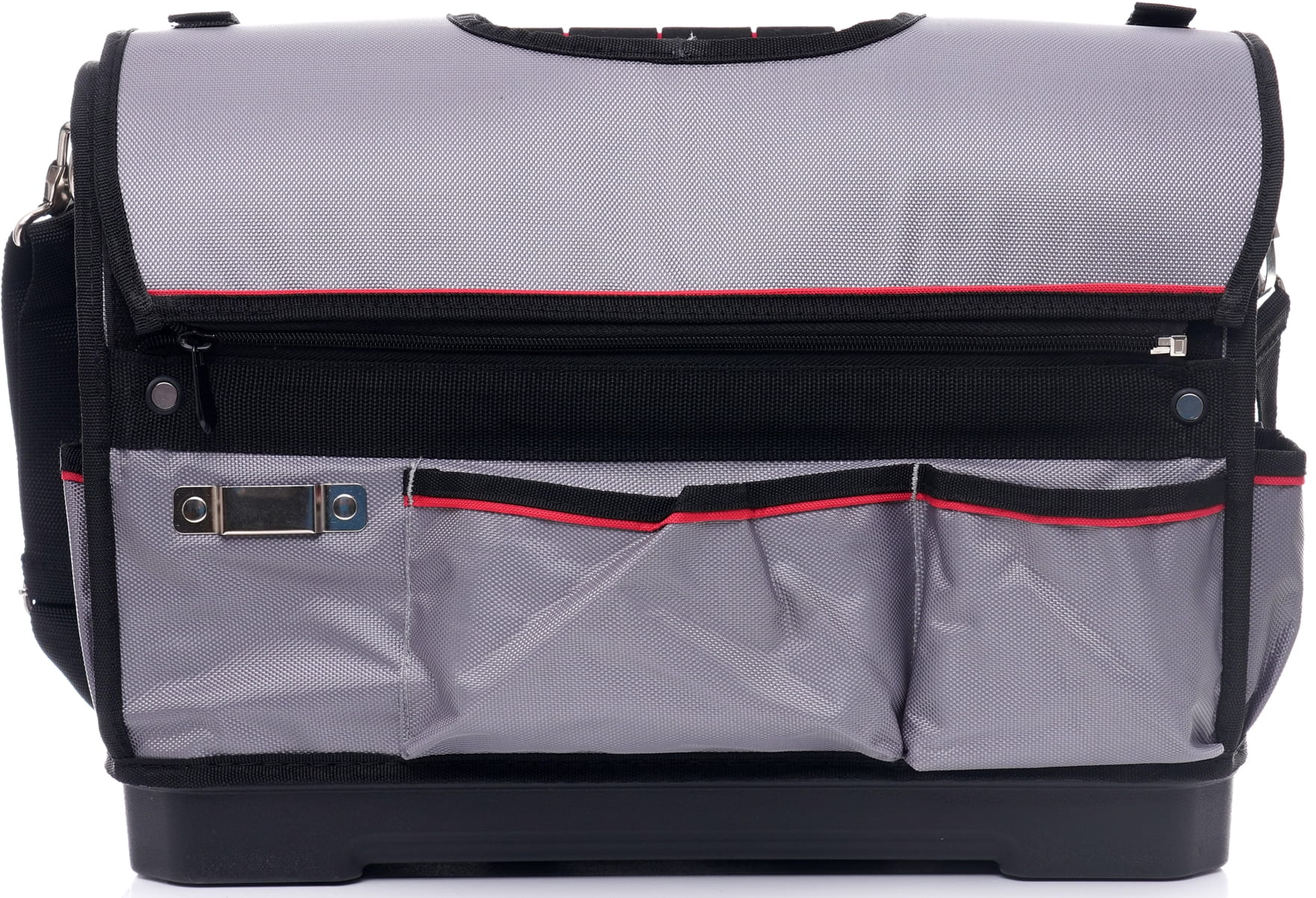 Klapa zabezpiecza zawartość podczas przenoszenia i chroni narzędzia przed wypadaniem. Jednocześnie umożliwia szybkie otwarcie torby bez konieczności wyjmowania całej zawartości — istotne przy pracy na budowie lub w terenie.