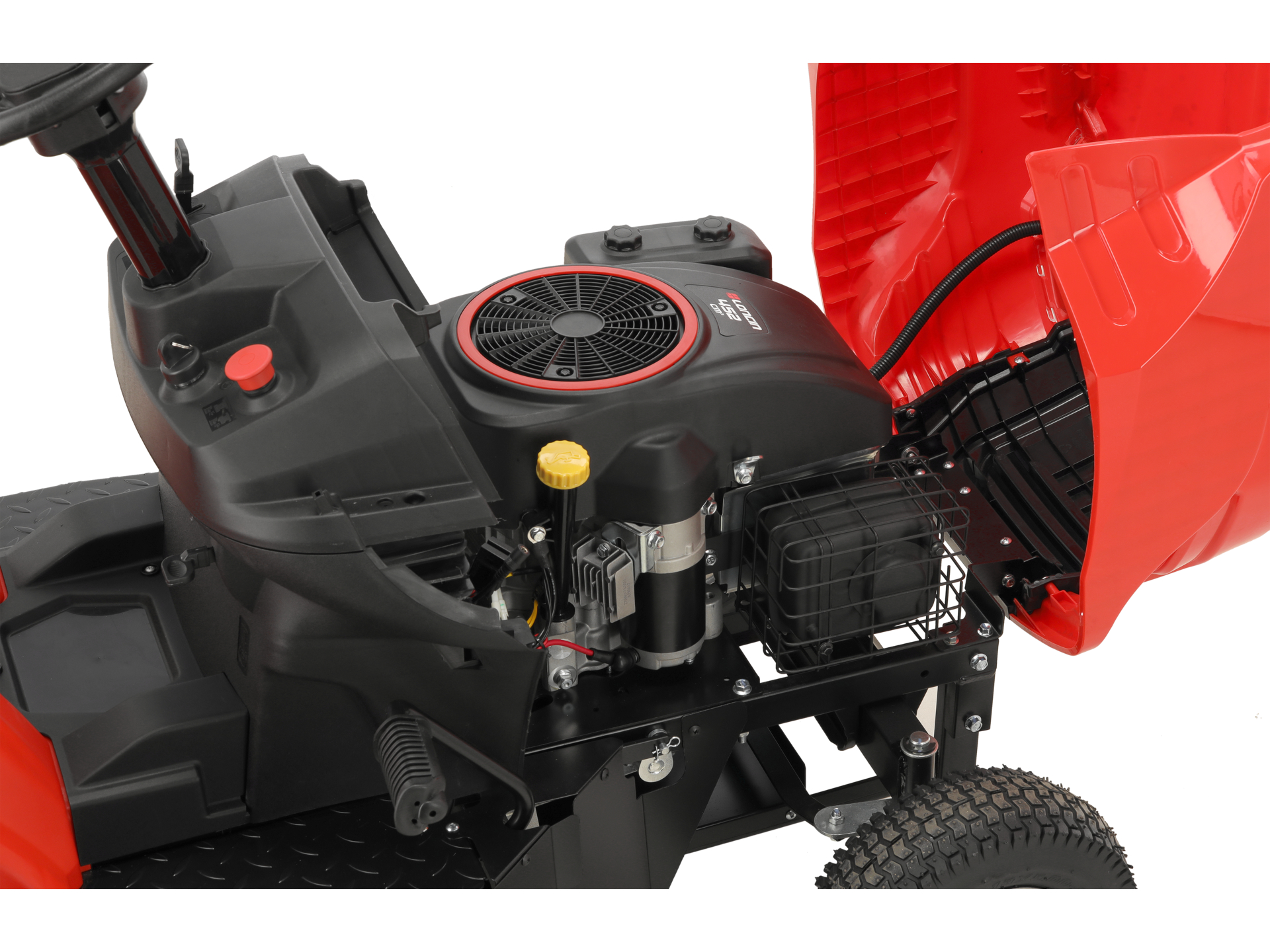 Czterosuwowy silnik górnozaworowy zapewnia stabilną pracę przy maksymalnym momencie obrotowym 2800 obr./min. Pojemność 452 cm³ przekłada się na wystarczającą moc do koszenia gęstej i wysokiej trawy na dużych powierzchniach bez przeciążania układu napędowego.