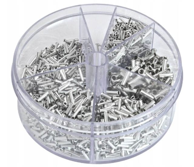 Zestaw tulejek nieizolowanych przeznaczonych do zakańczania odizolowanych końcówek przewodów elektrycznych w zakresie przekrojów 0,5–2,5mm². Zestaw zawiera pięć rozmiarów w łącznej liczbie 1900 sztuk, zapakowanych w przezroczyste pudełko z osobnymi przegrodami dla każdego rozmiaru.