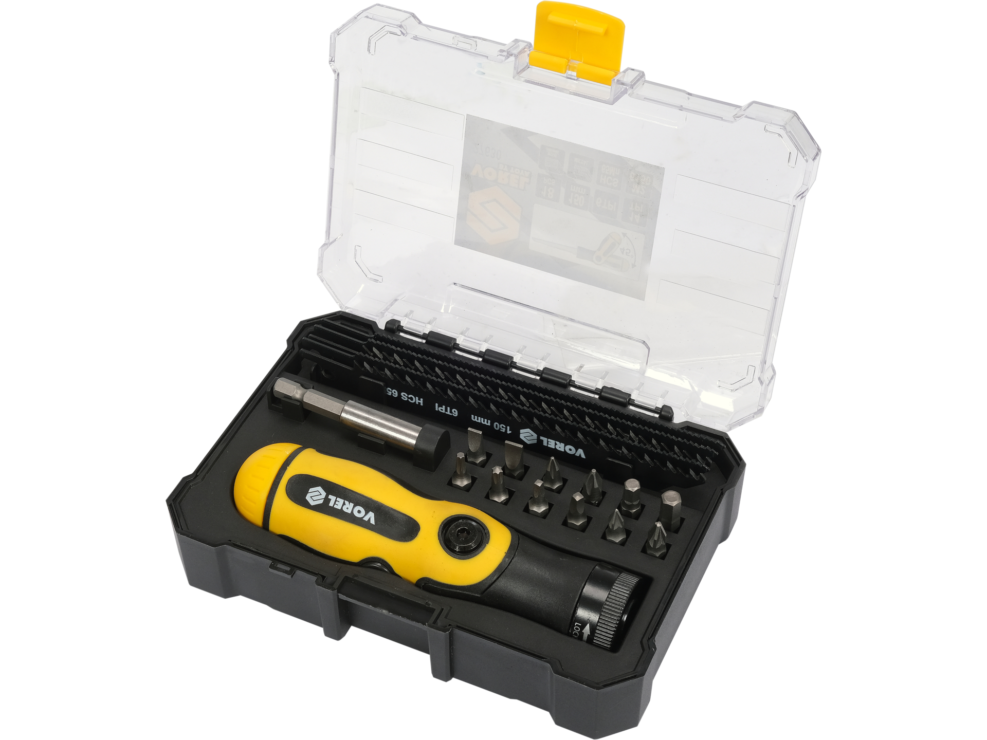 | Zawartość zestawu | Uchwyt z obrotową rękojeścią, 5 brzeszczotów bagnetowych, magnetyczny adapter do bitów, 12 końcówek śrubokrętowych |