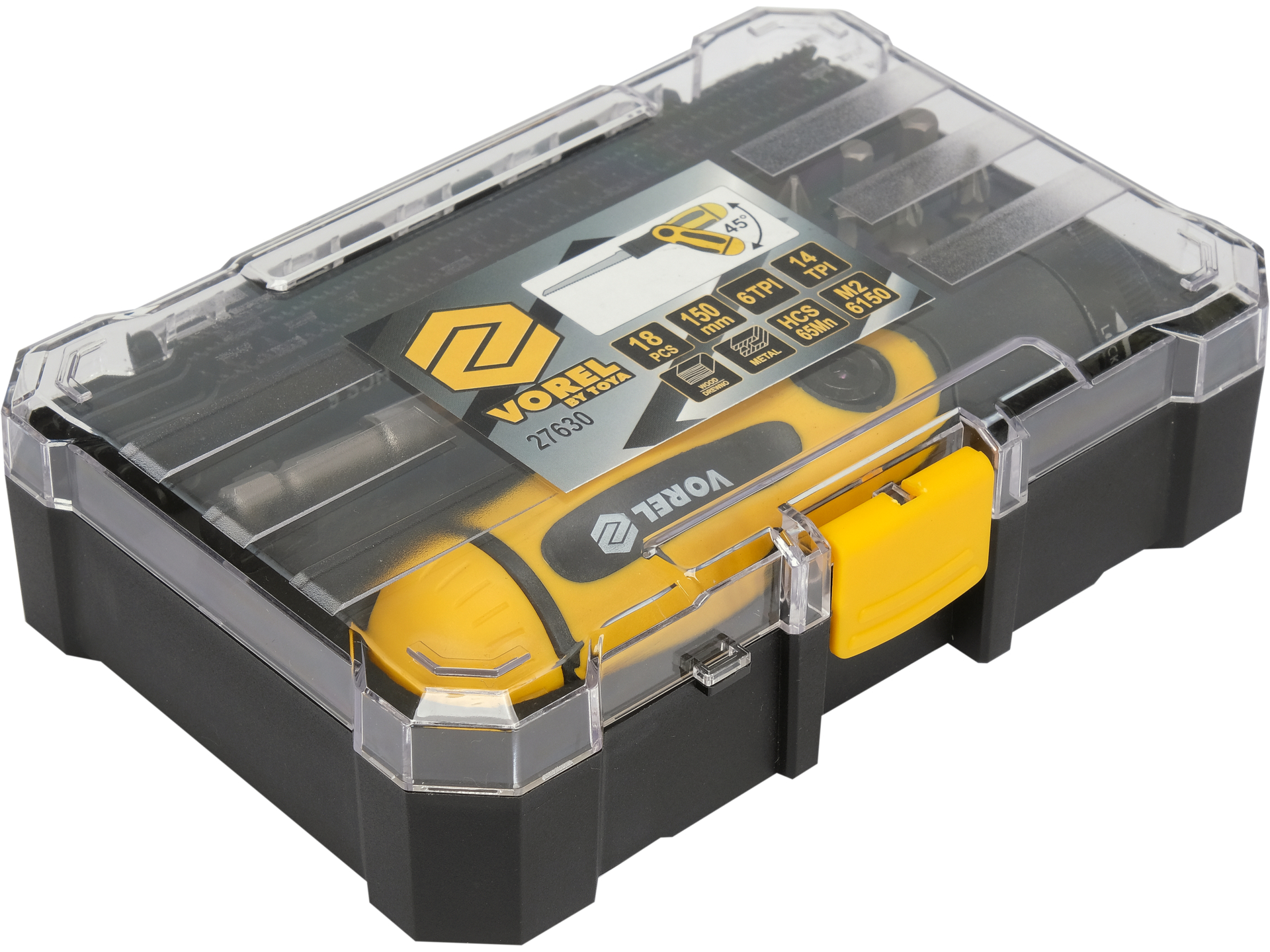 Uniwersalny uchwyt do brzeszczotów bagnetowych z przegubową rękojeścią, umożliwiający pracę pod kątem 45°. Zestaw zawiera 5 brzeszczotów do metalu i drewna oraz 12 końcówek śrubokrętowych z magnetycznym uchwytem.