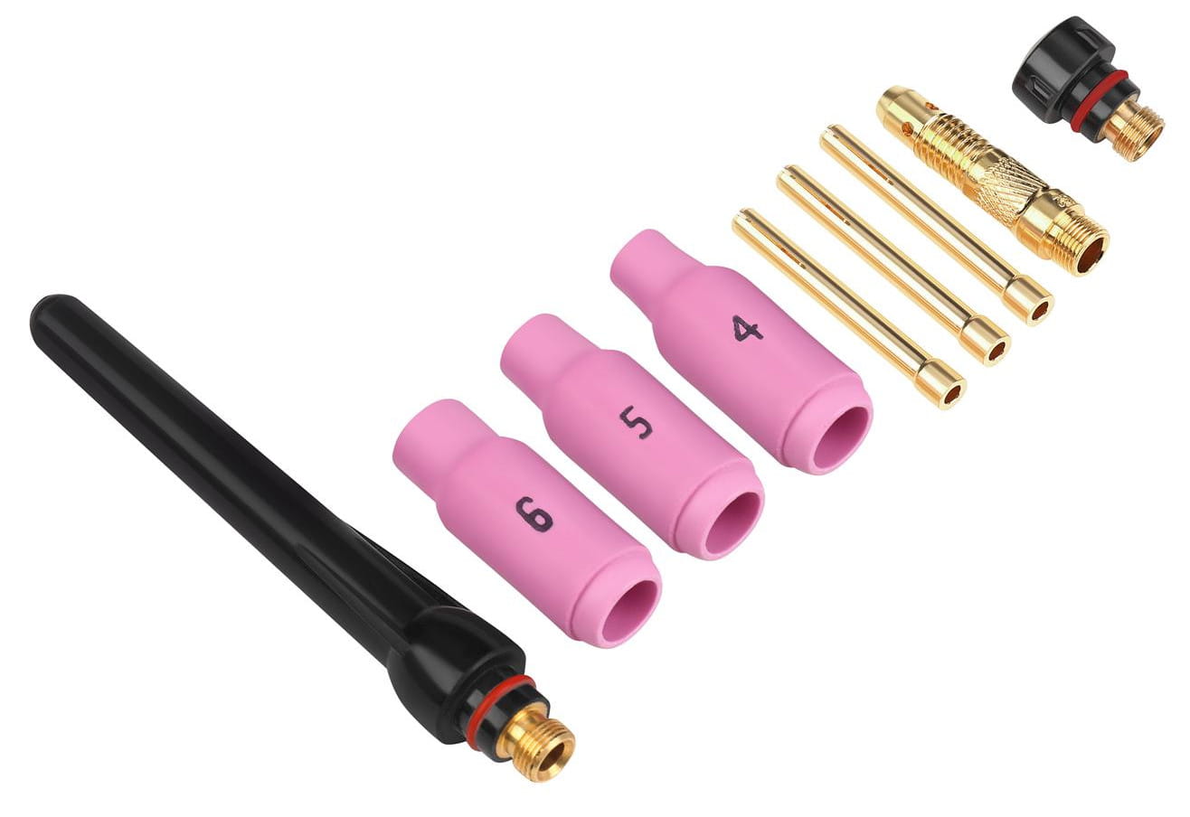 W komplecie znajdują się trzy dysze ceramiczne w rozmiarach 4, 5 i 6 (oznaczenia odpowiadają numerom zgodnym z normą AWS). Rozmiar dyszy dobiera się do średnicy elektrody wolframowej i natężenia prądu — mniejsze dysze stosuje się przy cienkich elektrodach i niskich prądach, większe przy grubych spoinach.