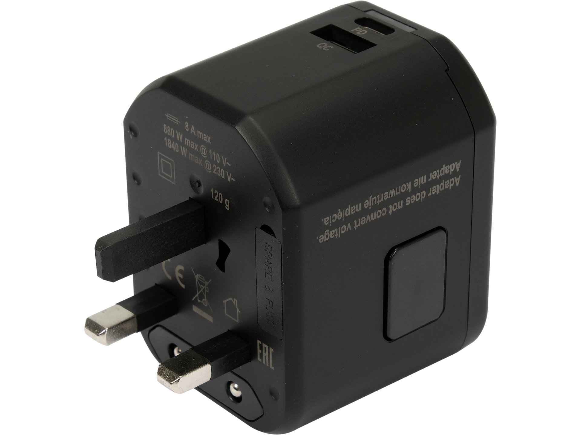 Wymiary 68 × 53 × 52 mm oraz masa nieprzekraczająca 100 g sprawiają, że adapter mieści się w kieszeni i nie zajmuje miejsca w bagażu. Zintegrowana konstrukcja eliminuje potrzebę noszenia oddzielnej ładowarki USB, redukując liczbę akcesoriów podróżnych.