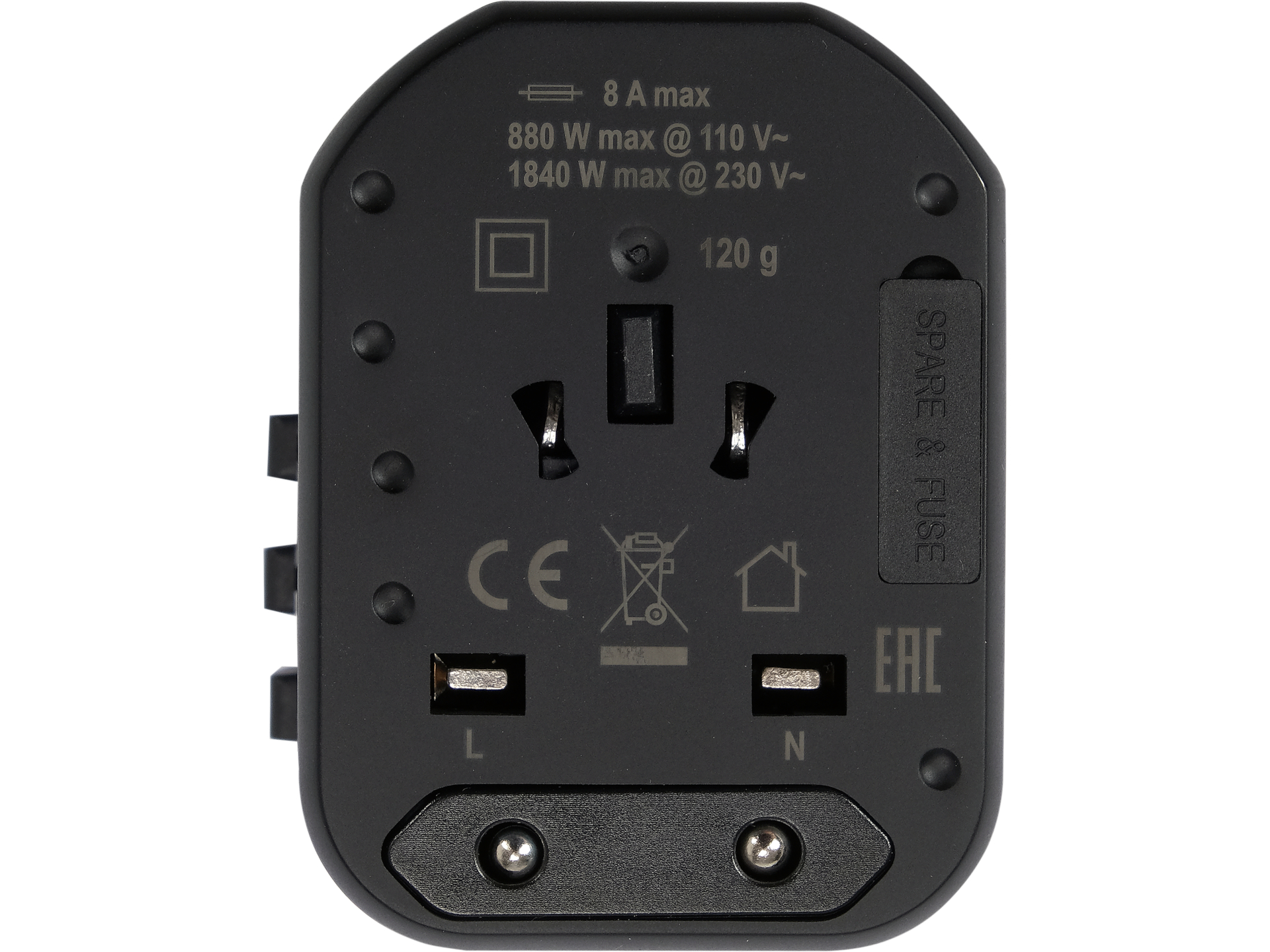 Maksymalna moc 1840W dotyczy sieci 230V. W krajach z napięciem 110-120V maksymalna moc spada do około 960W przy zachowaniu limitu prądowego 8A. Nie należy podłączać urządzeń o łącznej mocy przekraczającej te wartości, aby uniknąć zadziałania lub uszkodzenia bezpiecznika.