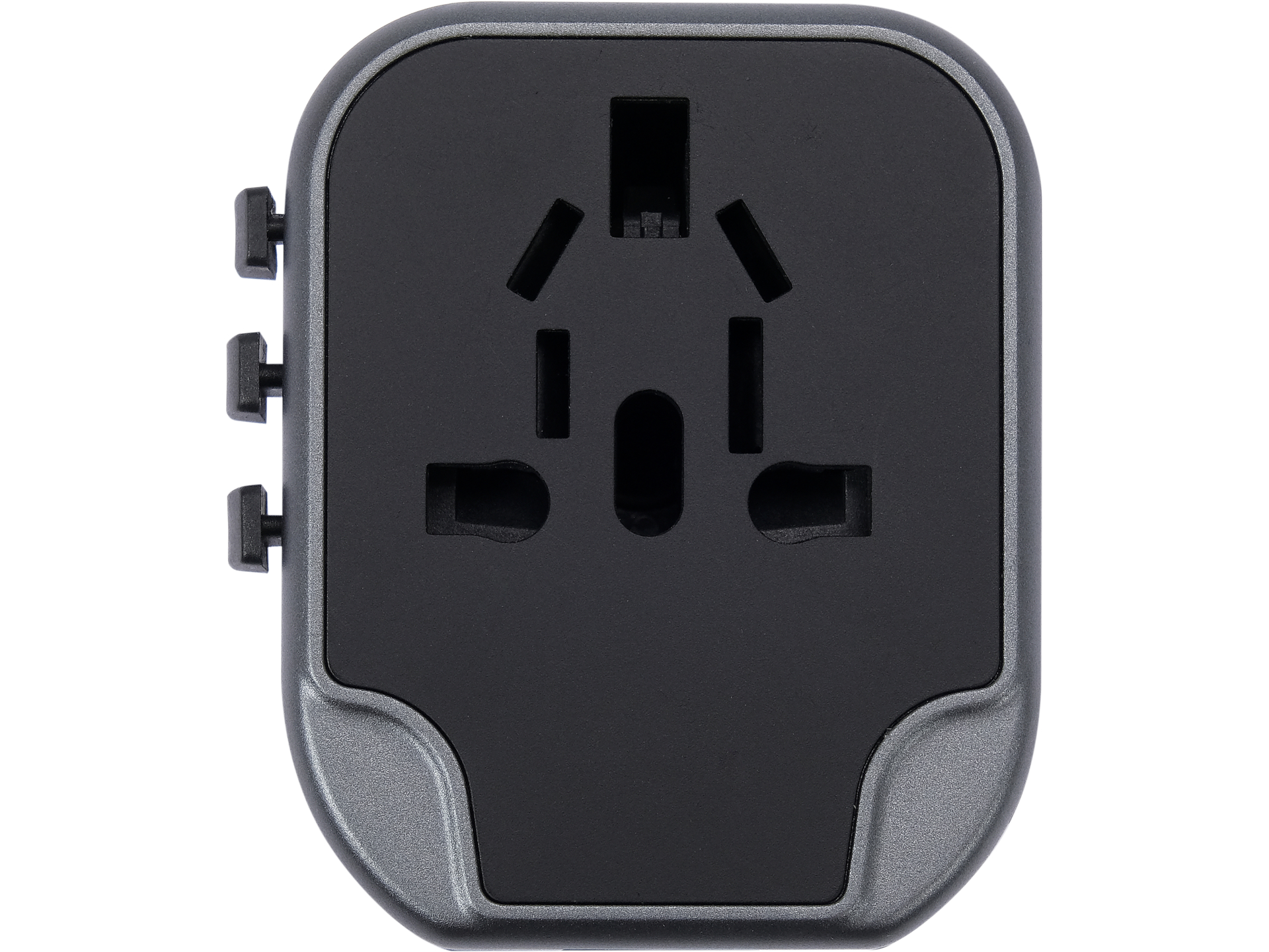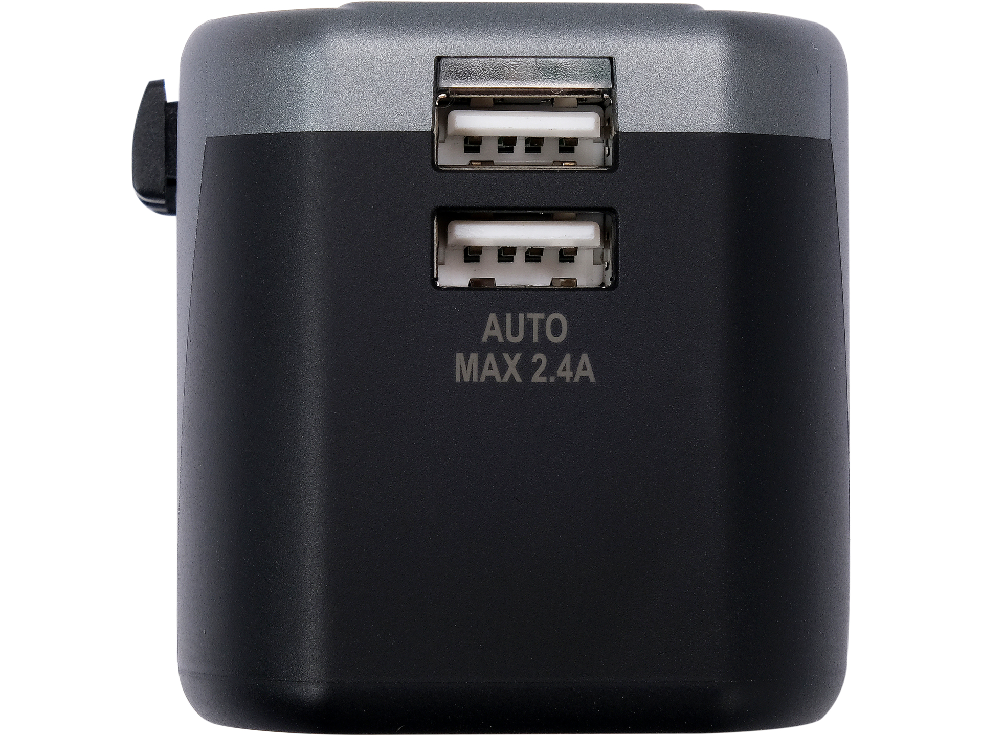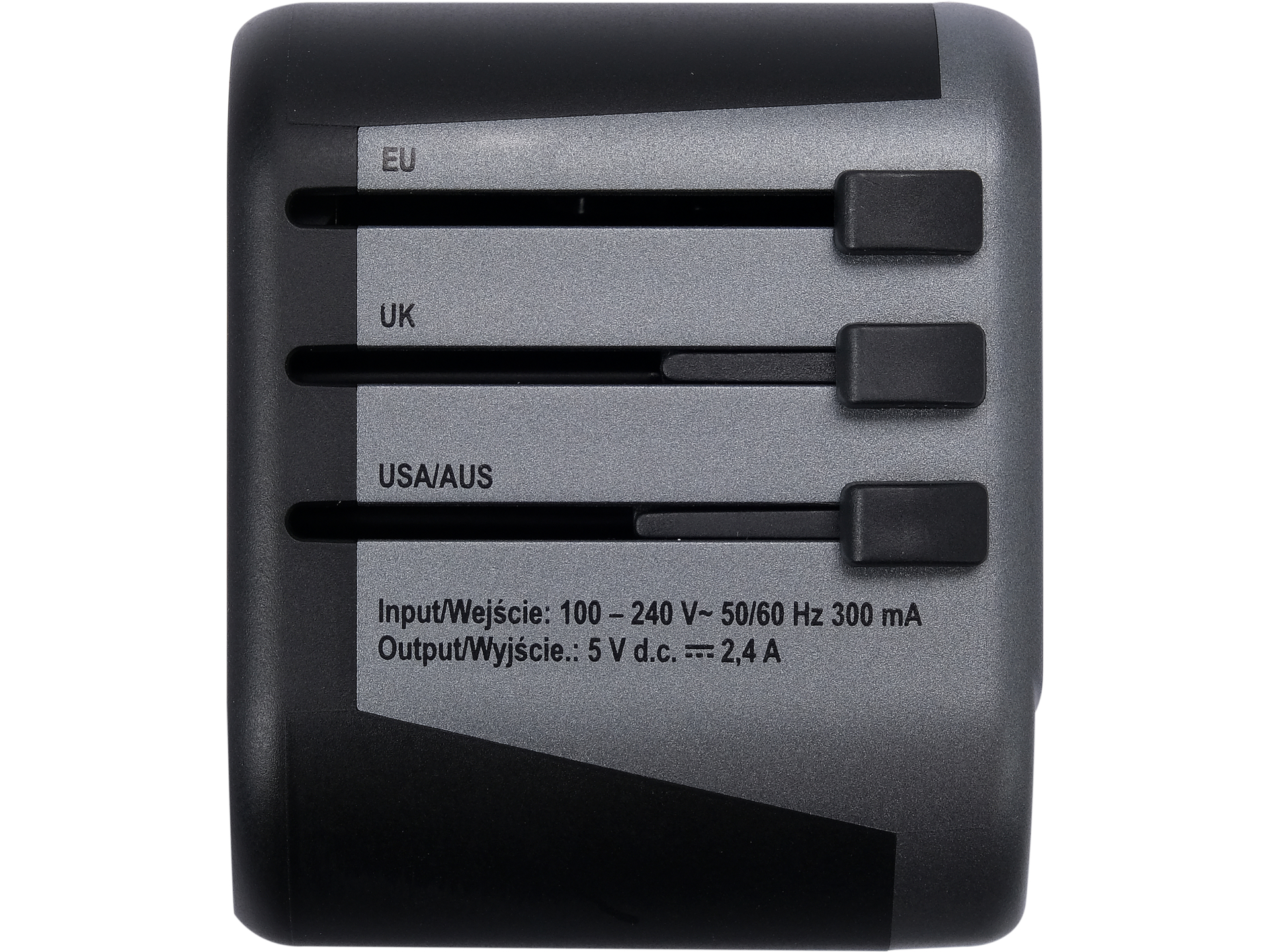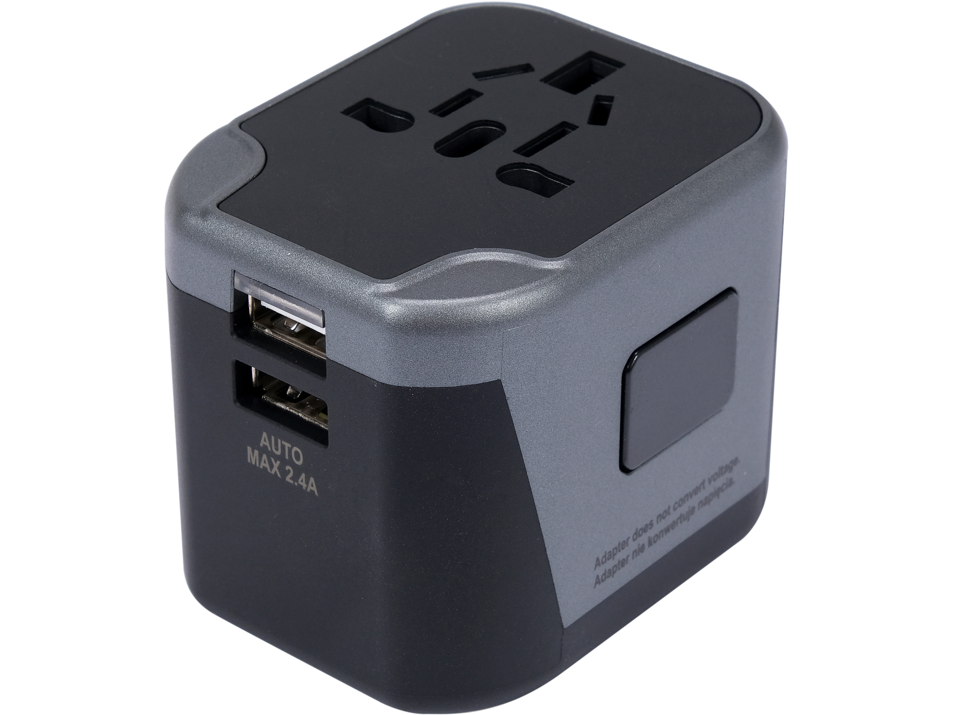 Adapter sieciowy z czterema typami wtyczek i dwoma portami USB-A, kompatybilny z gniazdami elektrycznymi w ponad 150 krajach. Umożliwia jednoczesne zasilanie urządzenia elektrycznego oraz ładowanie dwóch urządzeń mobilnych.