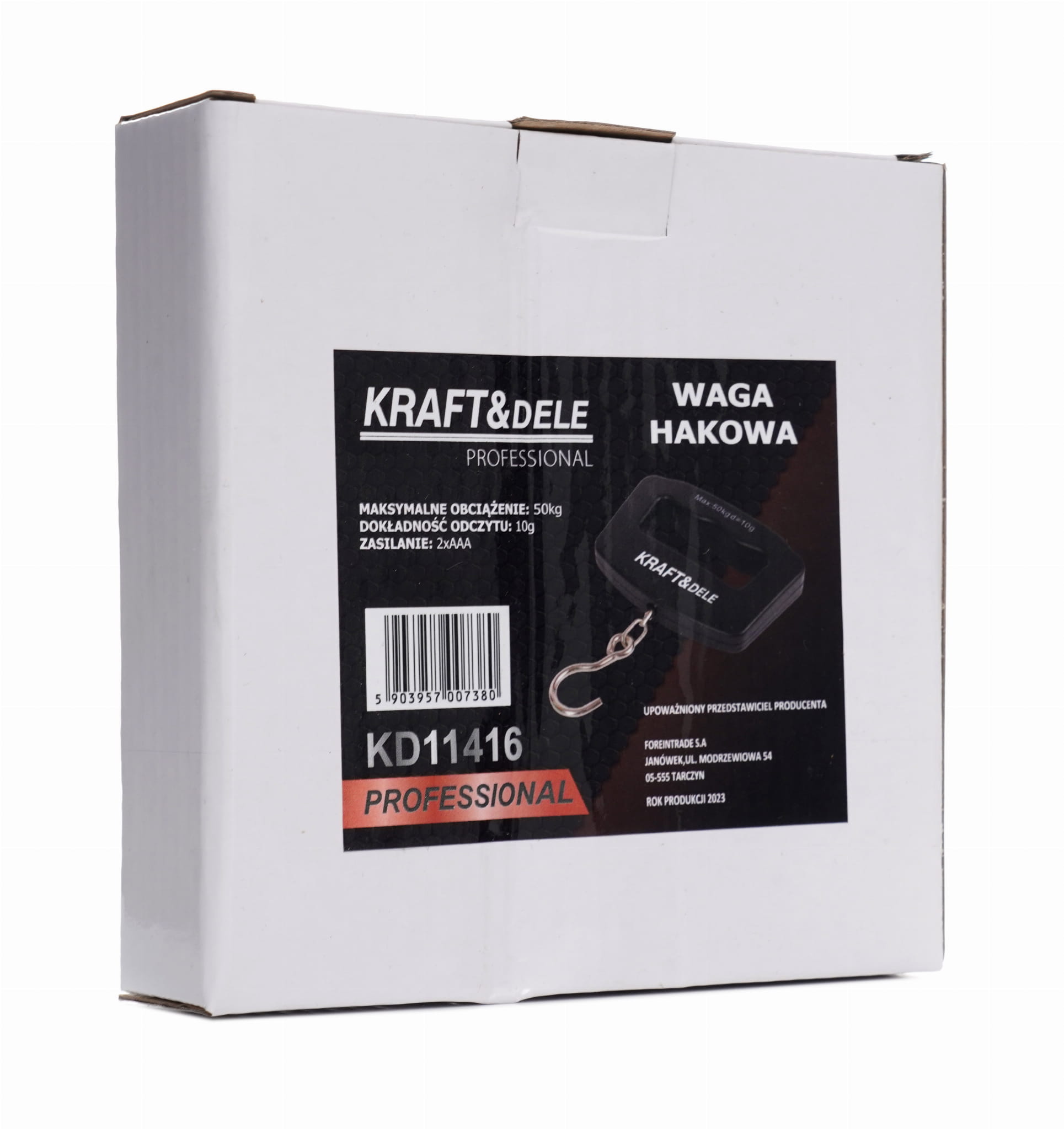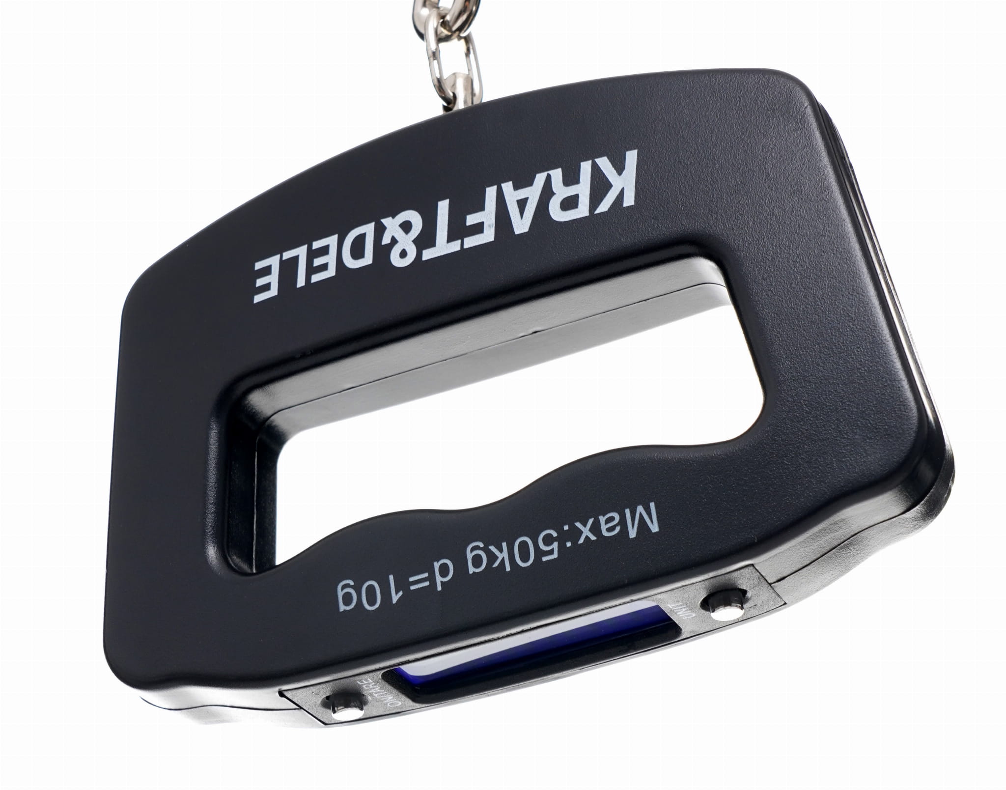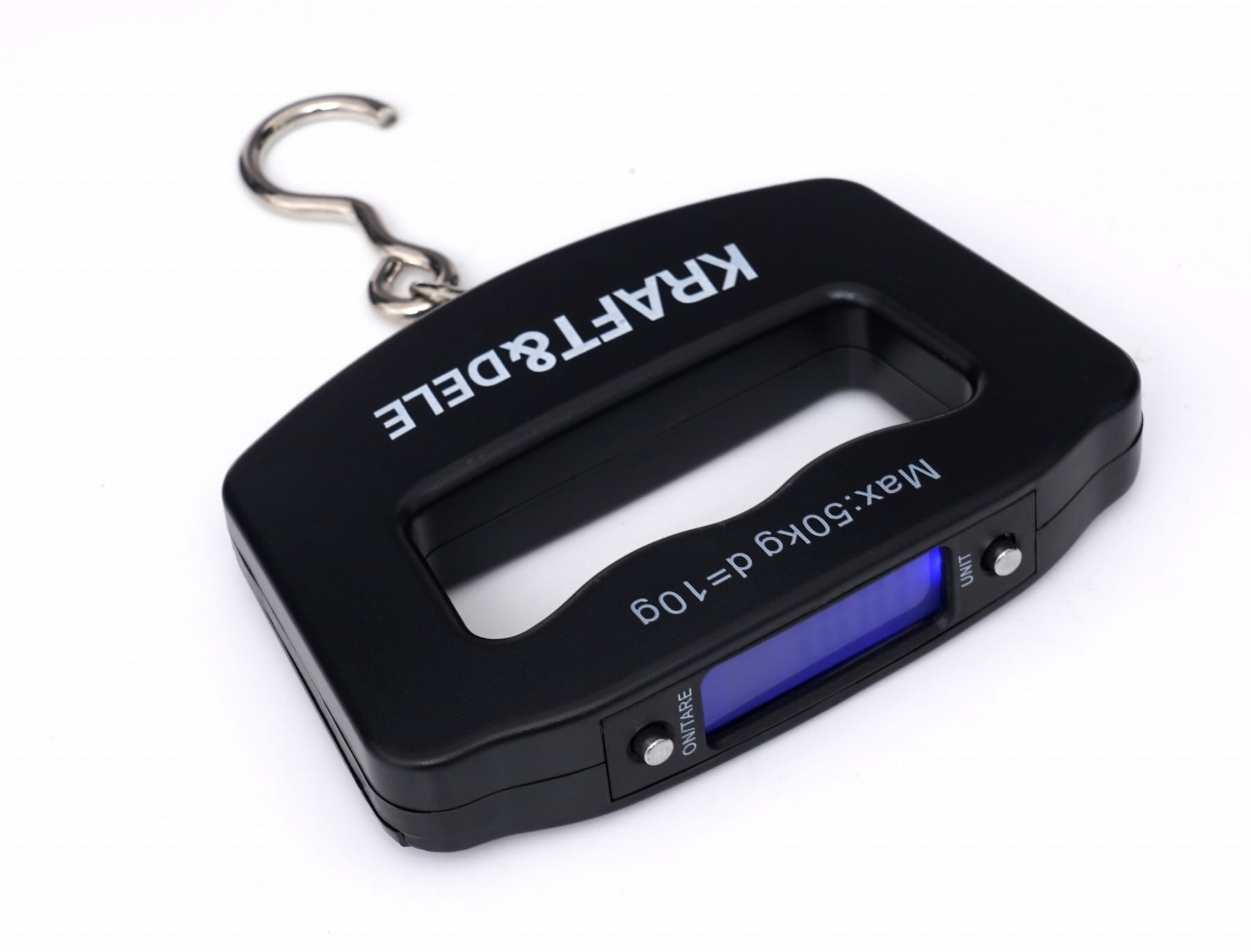 Kompaktowa waga hakowa z cyfrowym wyświetlaczem, przeznaczona do szybkiego ważenia bagażu, połowów wędkarskich, produktów spożywczych oraz towarów w magazynie lub warsztacie. Obsługuje zakres do 50 kg z podziałką 10 g i umożliwia odczyt w czterech jednostkach miar.