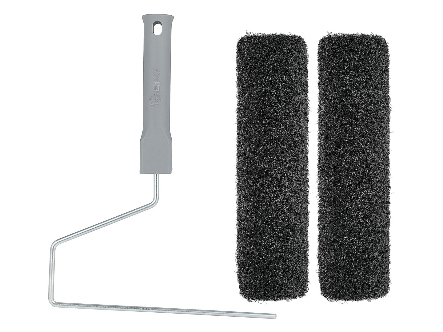 Zestaw do nakładania gładzi szpachlowych i mas wyrównujących, składający się z wałka roboczego osadzonego na rączce fi-6mm oraz dodatkowego wałka zapasowego. Włókno syntetyczne zapewnia równomierne rozprowadzanie masy bez smug i prześwitów.