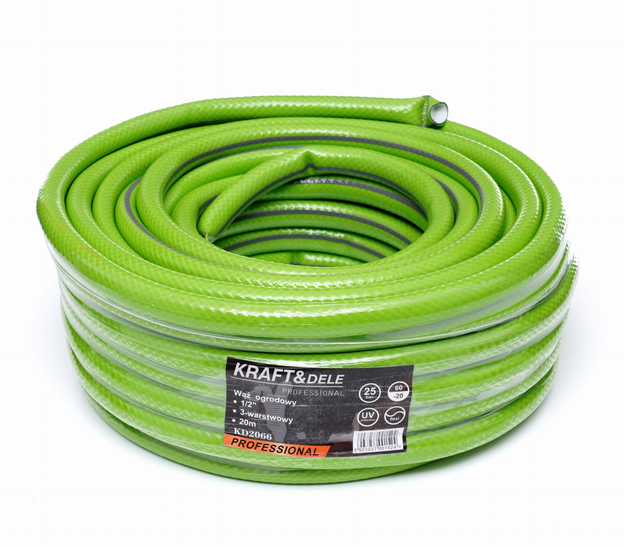 KD2070 to ogrodowy wąż do wody przeznaczony do tłoczenia i przepompowywania wody. Czterowarstwowa budowa oraz powłoka z miękkiej masy gumowej zapewniają odporność mechaniczną i termiczną w typowych warunkach ogrodowych i gospodarczych.