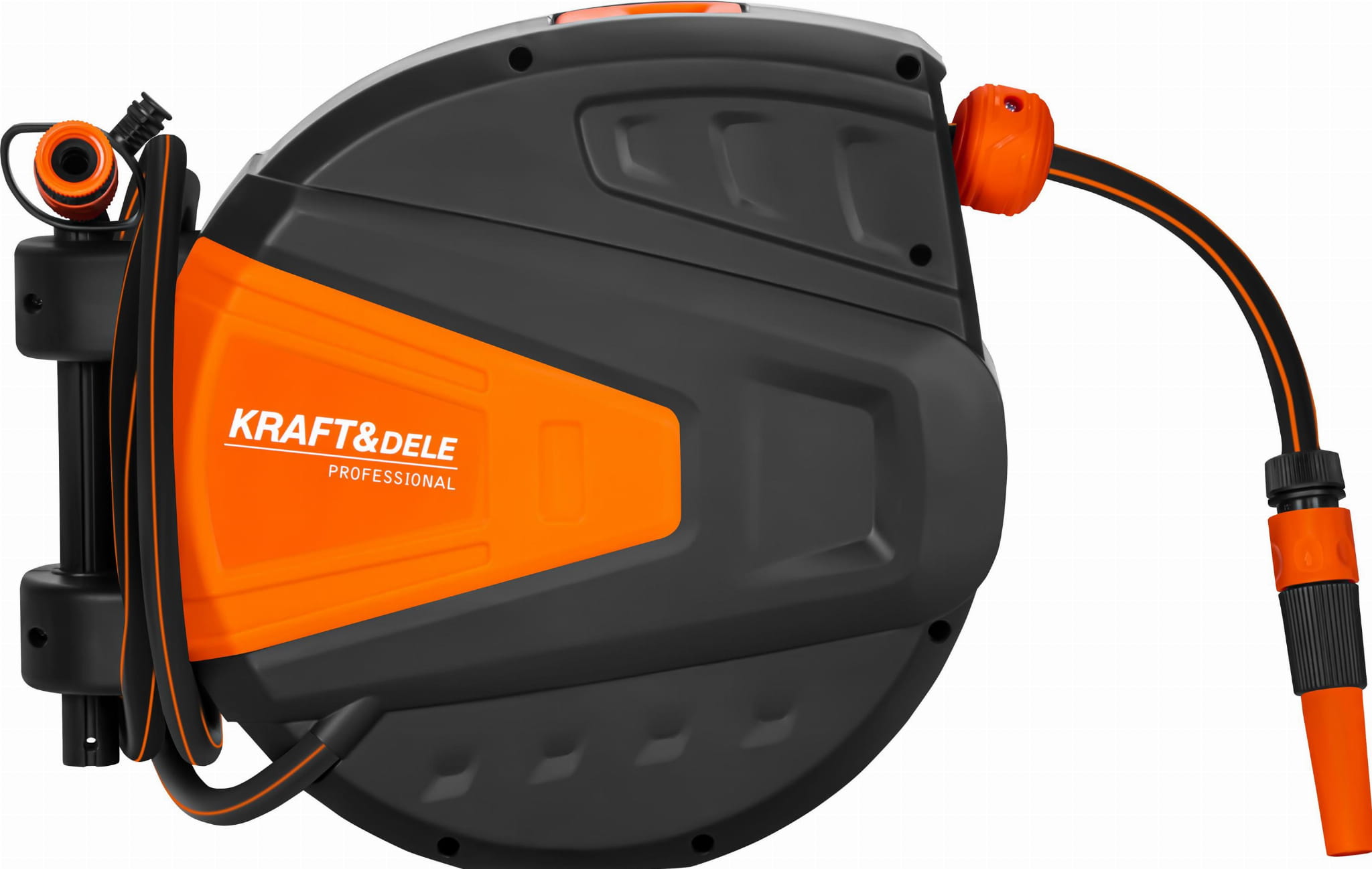 KD2154 to ścienny bęben z automatycznym mechanizmem zwijania węża ogrodowego o długości 25 m oraz dodatkowym odcinkiem przyłączeniowym 2 m. Urządzenie eliminuje konieczność ręcznego składania węża i zapobiega jego plątaniu się po nawierzchni. Wąż wykonany z PVC o średnicy 1/2" współpracuje ze standardowymi złączkami ogrodowymi 3/4".