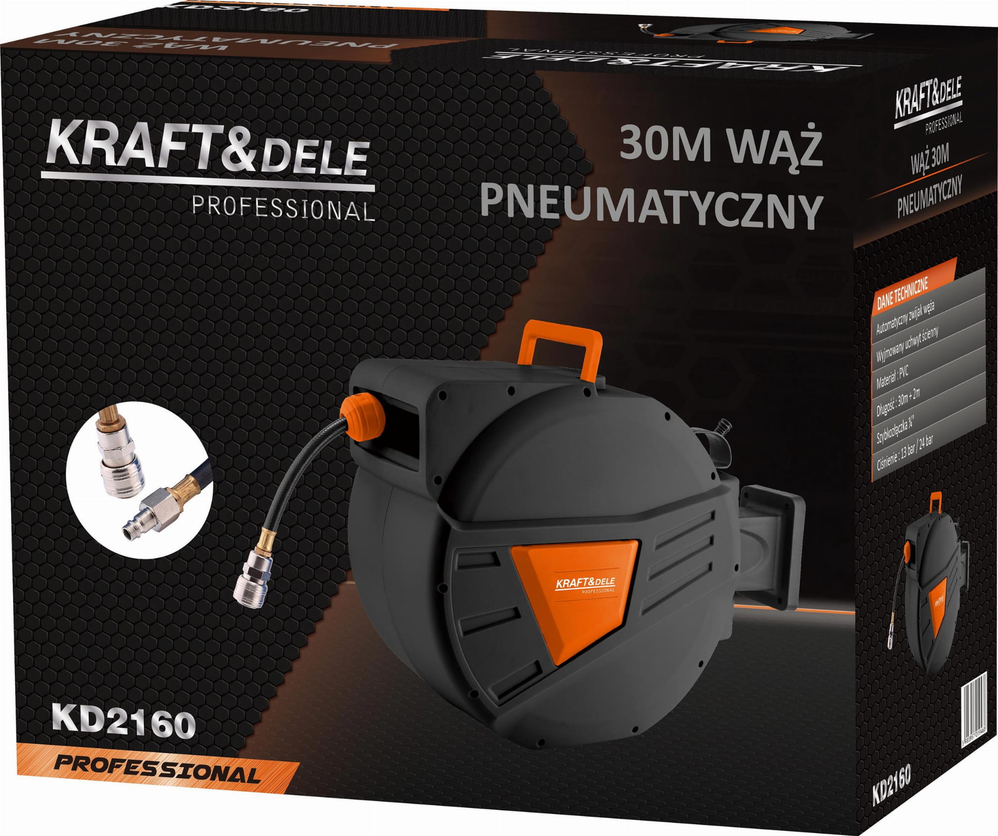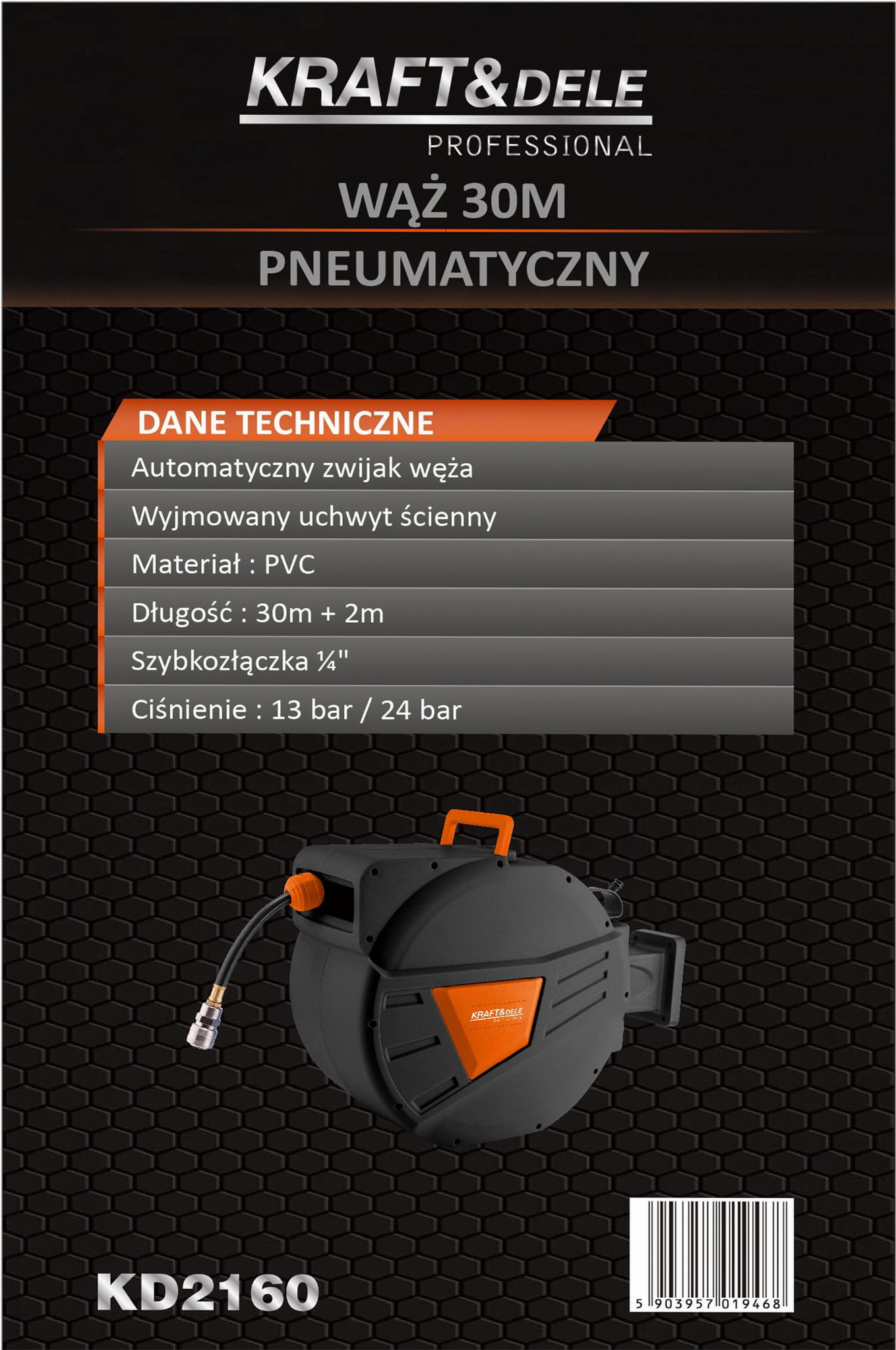 KD2160 to wąż pneumatyczny z PVC o łącznej długości 32 m (30 m roboczy + 2 m przyłączeniowy), osadzony na automatycznym zwijaku sprężynowym. Urządzenie przeznaczone do stałego montażu w warsztatach, serwisach i zakładach produkcyjnych, gdzie wymagana jest sprawna i bezpieczna dystrybucja sprężonego powietrza.