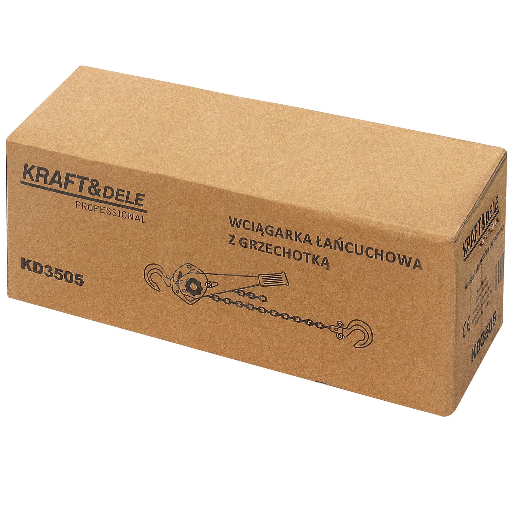 KD3505 to ręczna wciągarka łańcuchowa przeznaczona do podnoszenia i opuszczania ładunków o masie do 3000 kg. Urządzenie pracuje bez zasilania elektrycznego — napęd realizowany jest ręcznie przez mechanizm łańcuchowy z grzechotką, co umożliwia precyzyjne sterowanie ruchem ładunku w każdych warunkach.