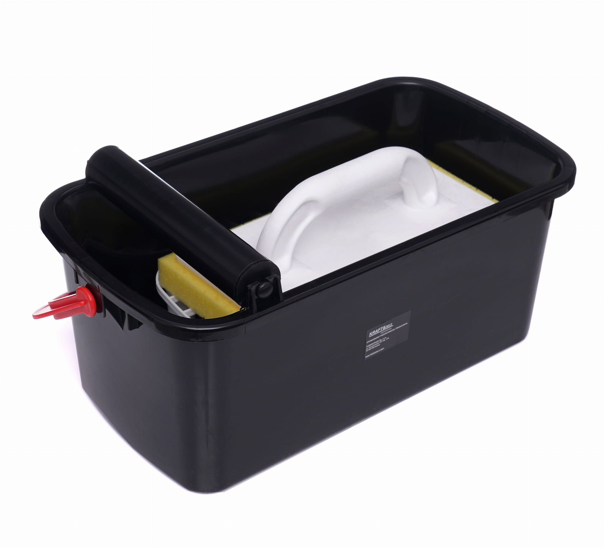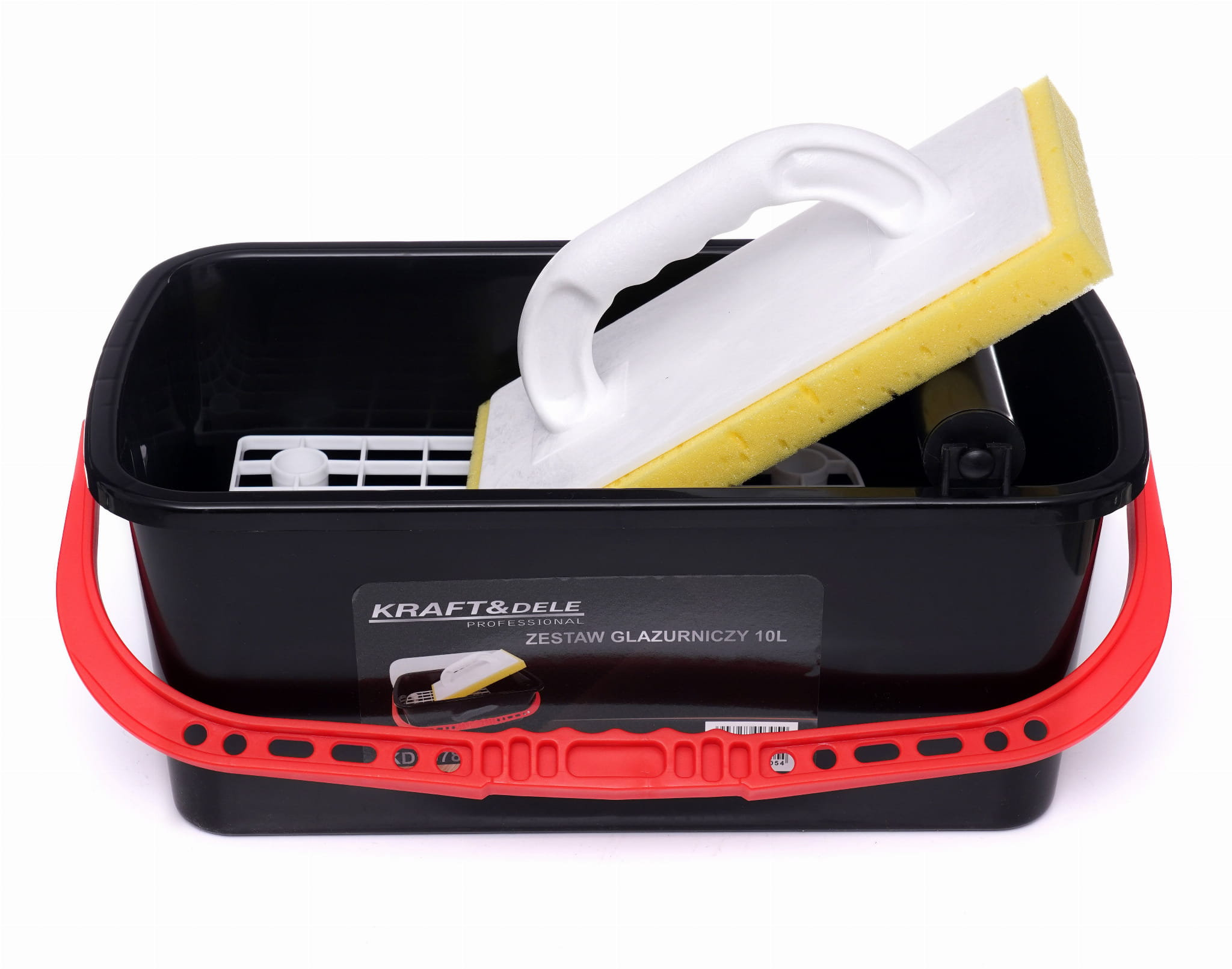 Kompletny zestaw do prac glazurniczych obejmujący wiadro z akcesoriami oraz pacę z gąbką. Umożliwia sprawne mycie powierzchni po fugowaniu i usuwanie pozostałości zaprawy fugowej z glazury i gresu.