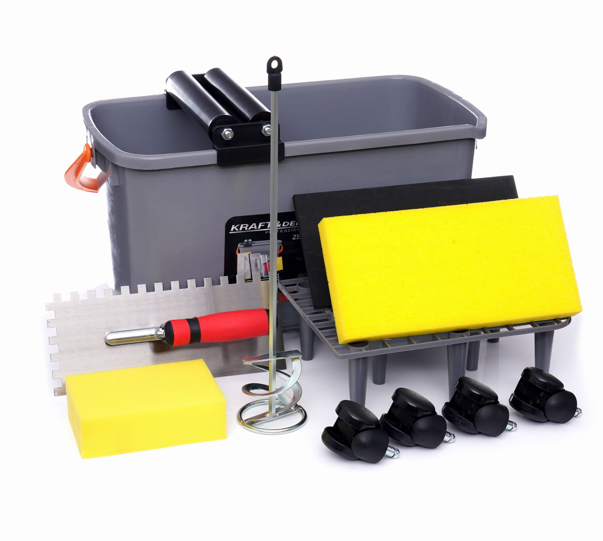 Zestaw KD10785 zawiera: wiadro 24L z uchwytem, rolki do wiadra (kółka wyciskające), kratkę na nóżkach do wiadra, pacę z gąbką, gąbkę, pacę do spoinowania oraz kielniię nierdzewną sztukatorską. Wszystkie elementy są ze sobą kompatybilne i przeznaczone do współpracy w trakcie prac glazurniczych.