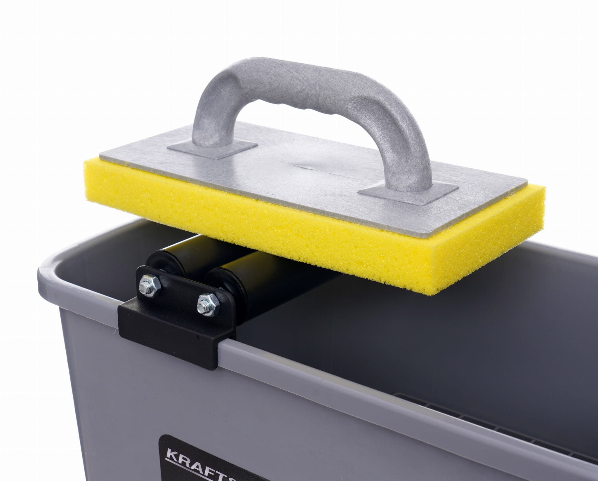 Rolki montowane na wcisk umożliwiają wyciskanie nadmiaru wody z gąbki bezpośrednio nad wiadrem. Eliminuje to konieczność ręcznego wyżymania gąbki i przyspiesza cykl mycia płytek po fugowaniu.