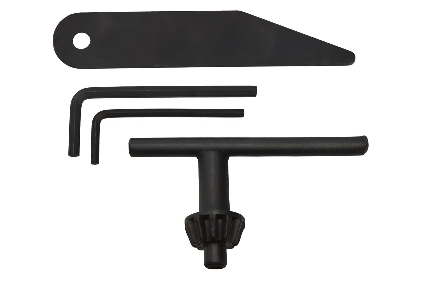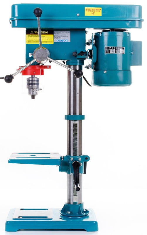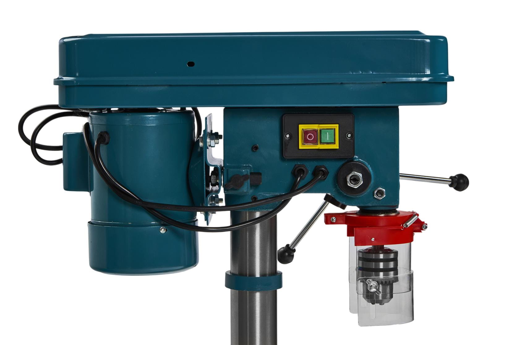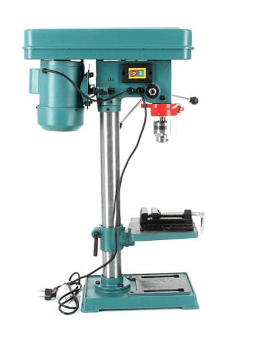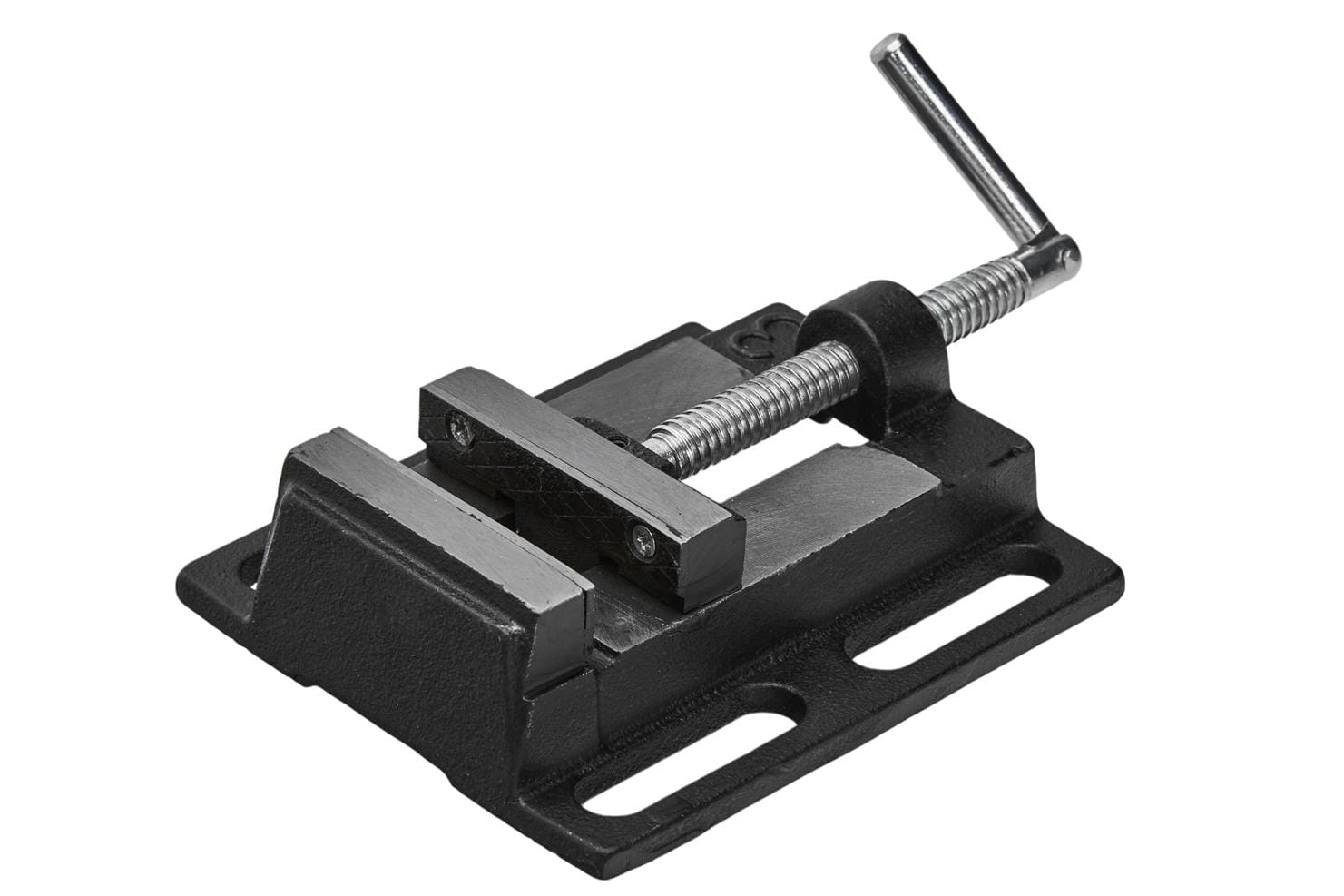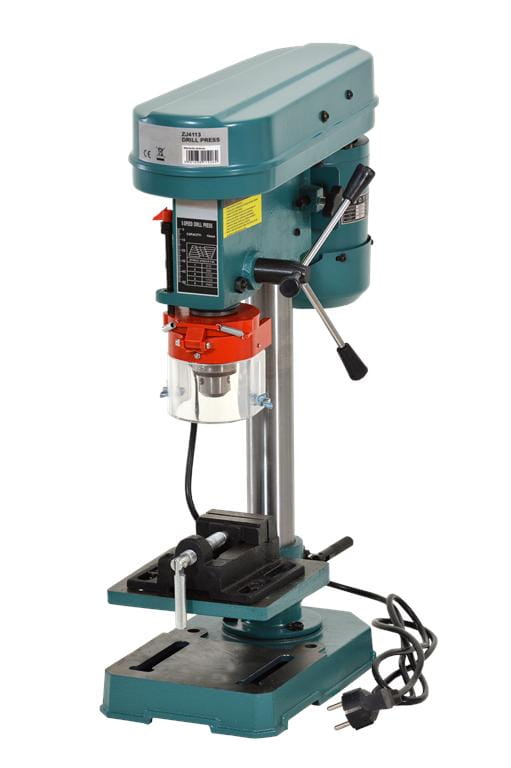Stół o wymiarach 355 × 235 mm można ustawiać na różnych wysokościach wzdłuż kolumny, co pozwala wiercić w przedmiotach o różnej grubości. Dołączone imadło maszynowe stabilizuje obrabiany element, eliminując ryzyko obrotu materiału podczas wiercenia — jest to szczególnie istotne przy pracy w metalu.
